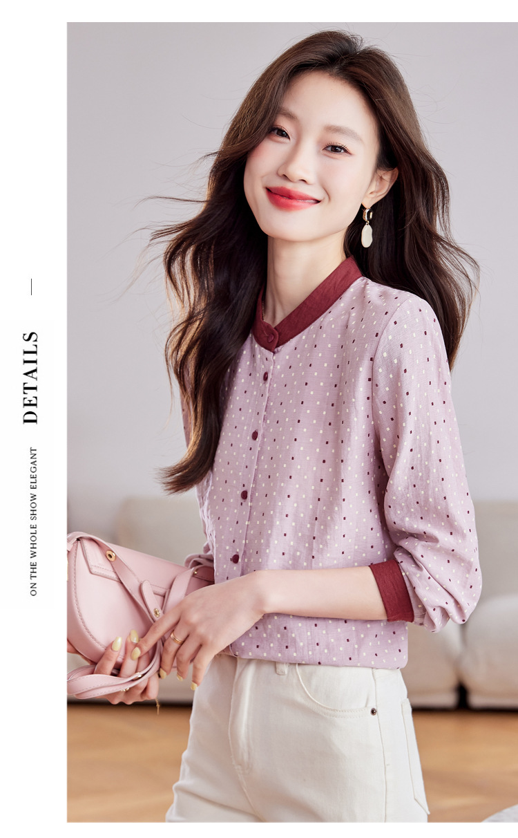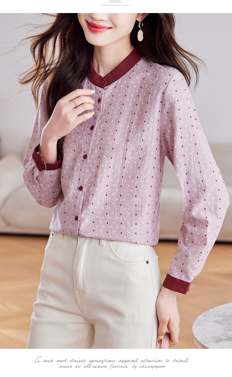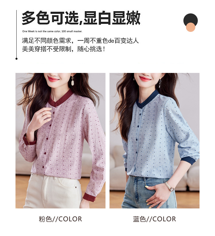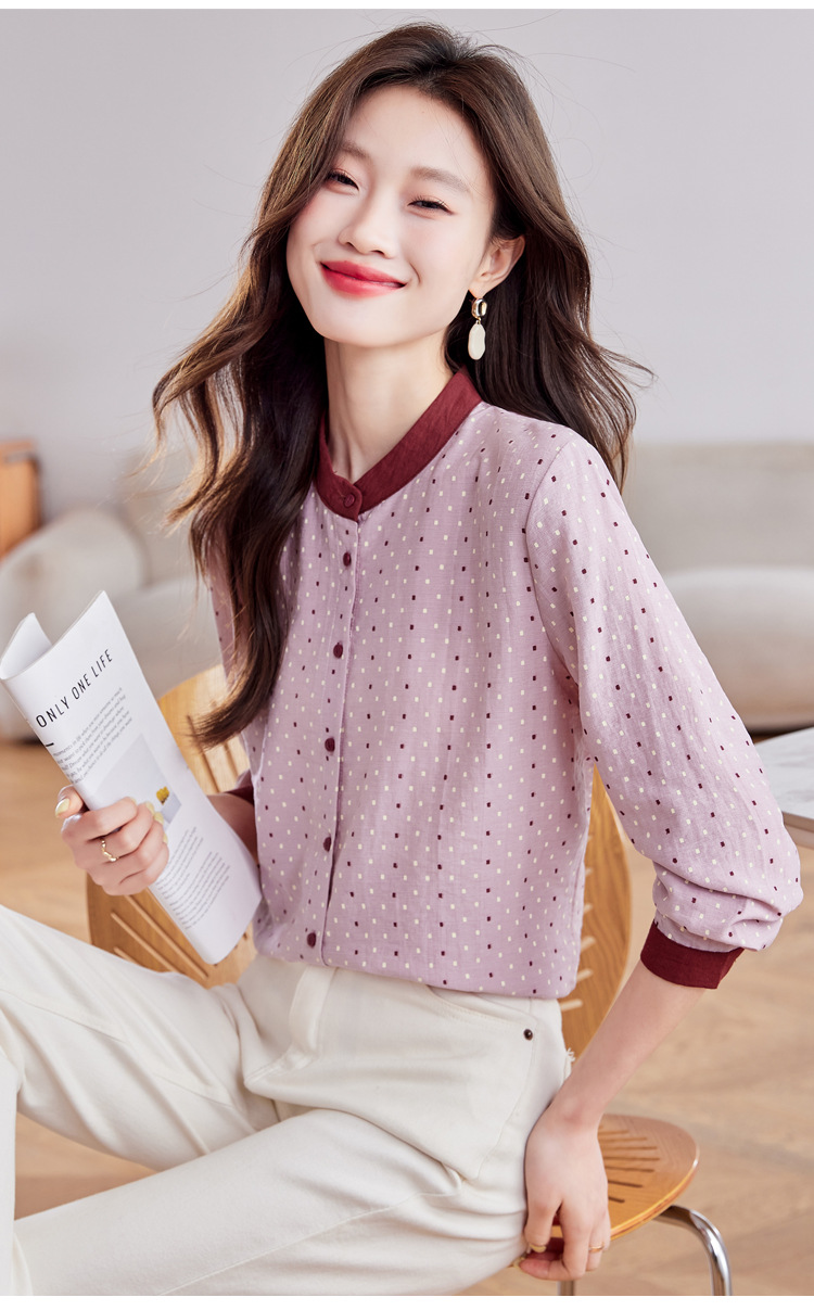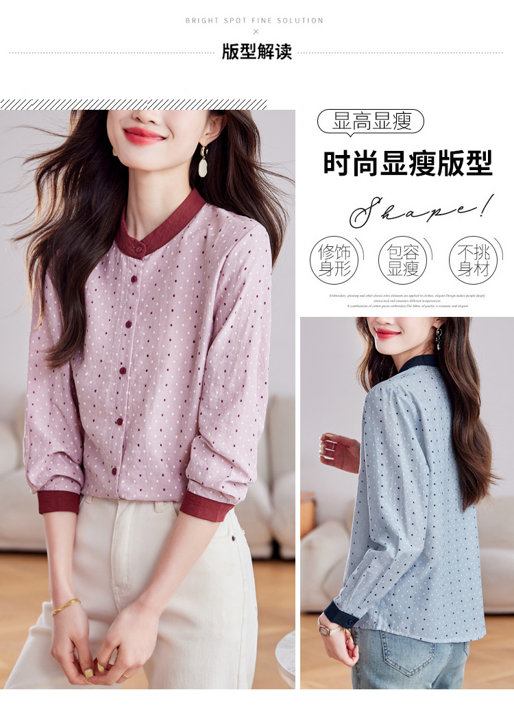 KQL2025秋季新款韩版设计感拼色圆点长袖衬衫女减龄百搭亚麻平纹上衣