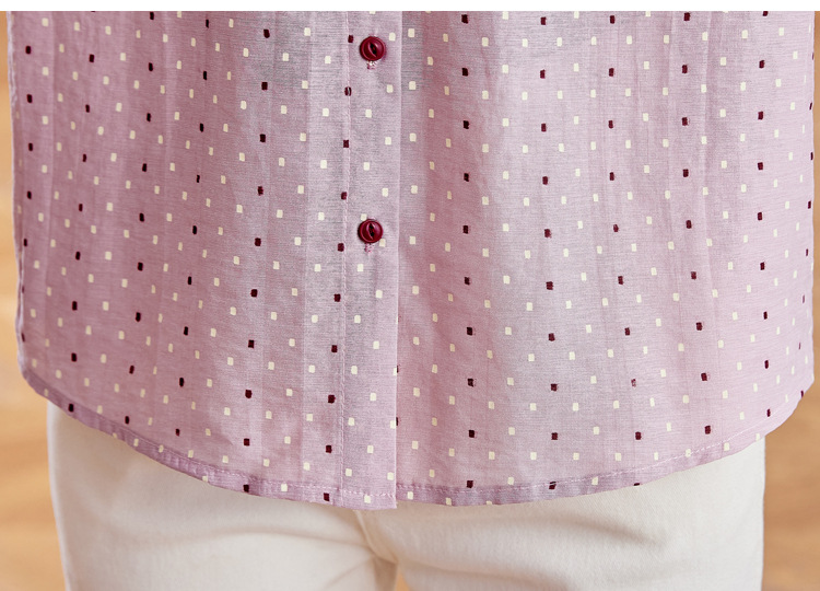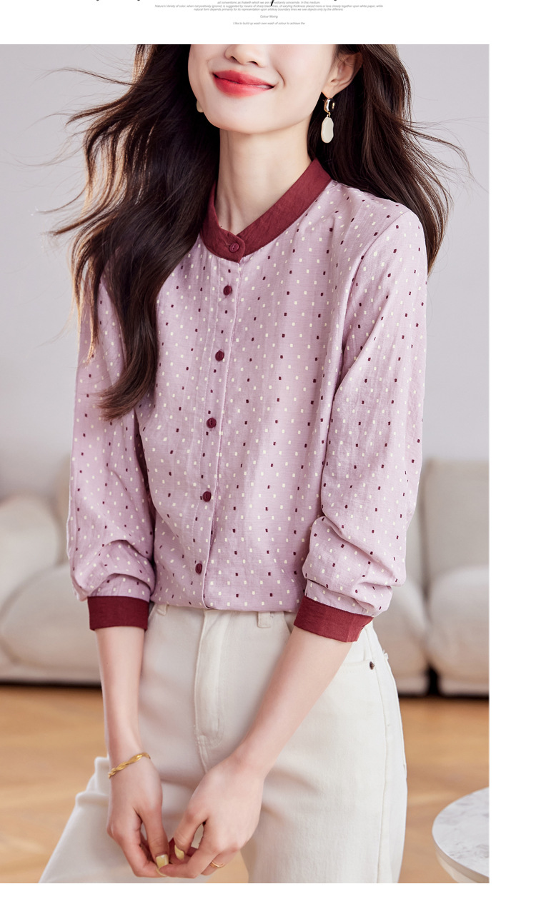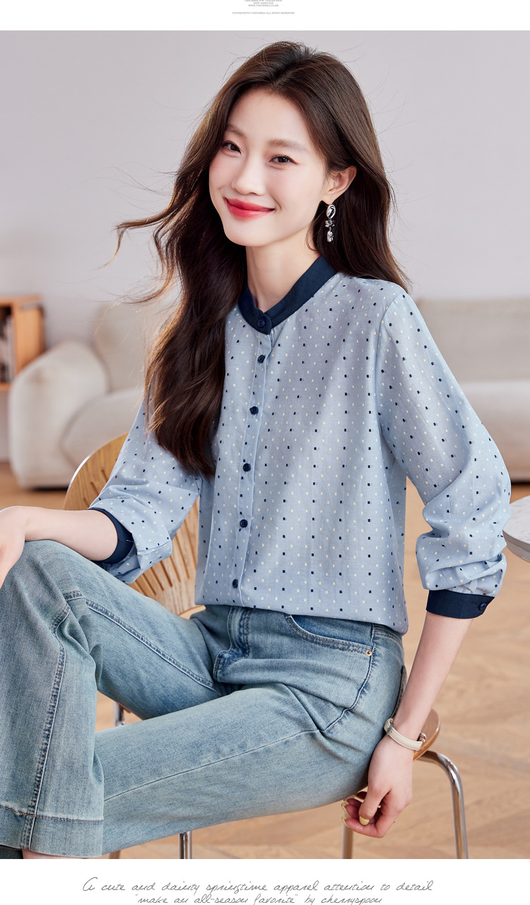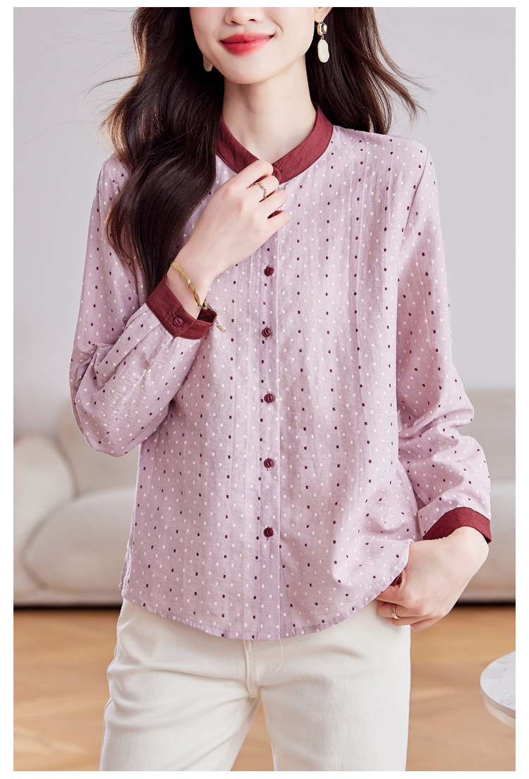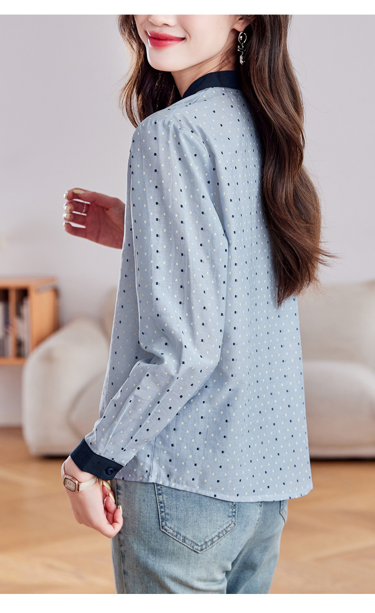 KQL2025秋季新款韩版设计感拼色圆点长袖衬衫女减龄百搭亚麻平纹上衣