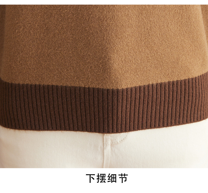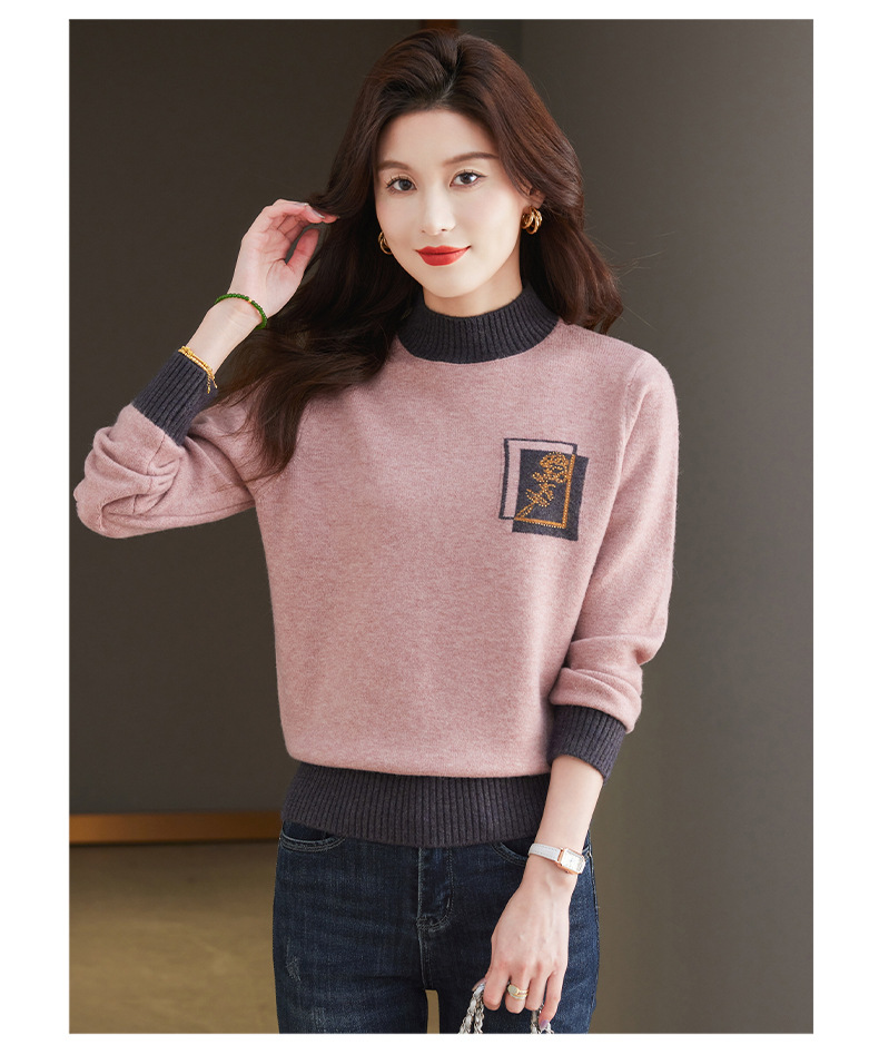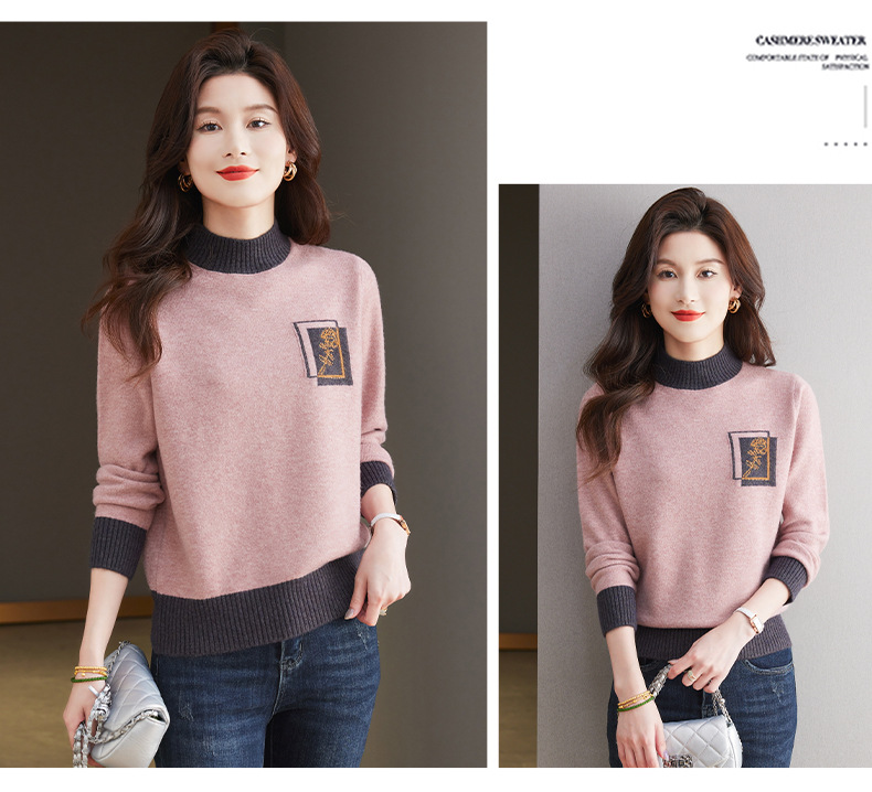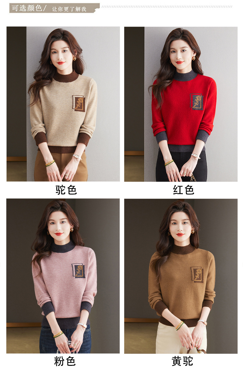 CC-13-6367秋冬内搭打底衫女士2024新款半高领洋气拼色提花毛衣镶钻