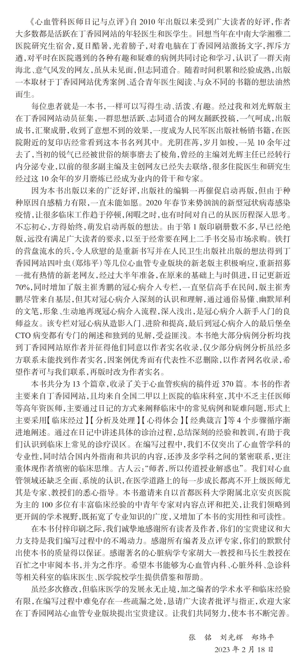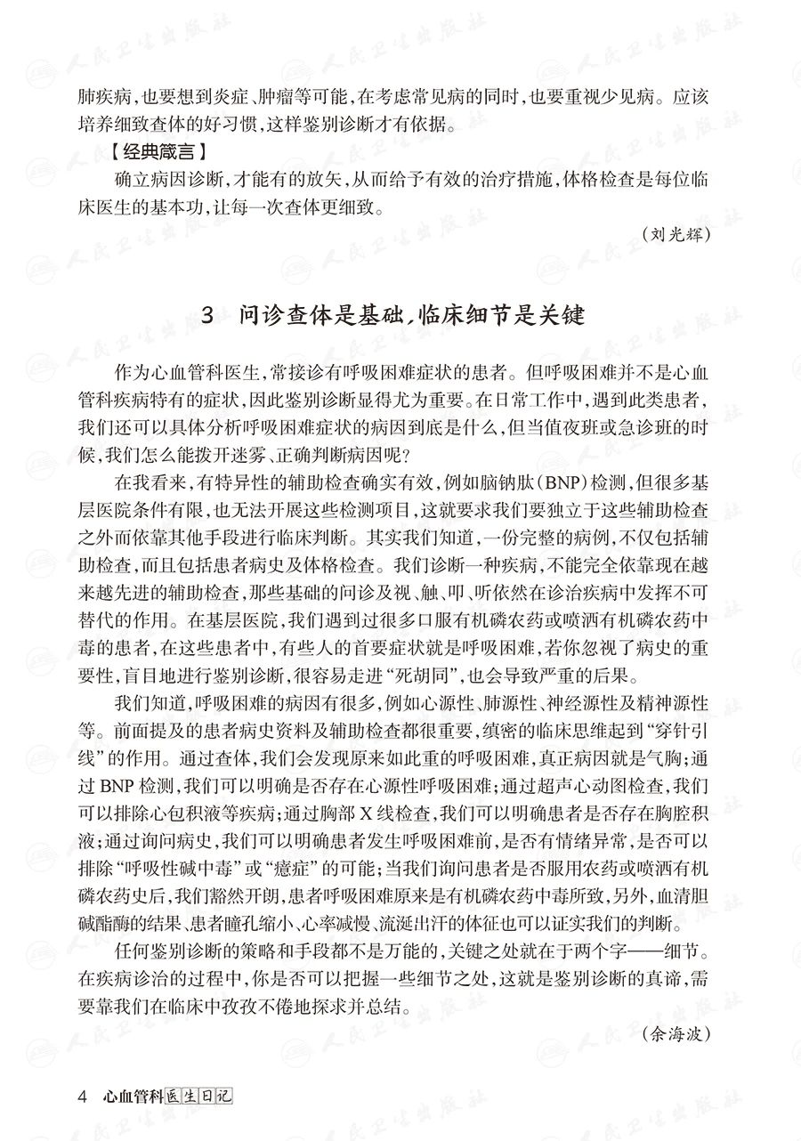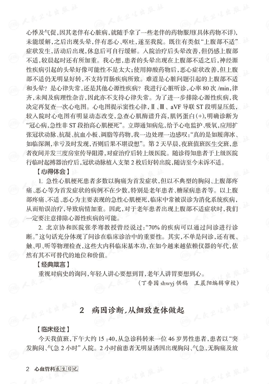 本书共分为 13 个篇章,收录了关于心血管疾病的稿件近 370 篇。主要通过日记的方式来阐释临床中的常见病例和疑难问题,形式上主要采用【临床经过】【分析及处理】【心得体会】【经典箴言】等 4 个步骤循序渐进地阐述。通过在日记中讲述具体的诊治过程,总结深刻的经验和教训,有助于读者认识到临床上常见的诊疗误区。在编写过程中,不仅突出了心血管学科的专业性,同时结合国内外指南和共识的内容,还涉及多学科之间的紧密联系,更注重体现作者缜密的临床思维。此外,本书邀请来自以首都医科大学附属北京安贞医院为主的 100 多位有丰富临床经验的中青年专家对内容点评和把关,以期让读者领略到更开阔的学术视野,既拓宽了专业知识的广度,又增加了本书的实用性和可读性。