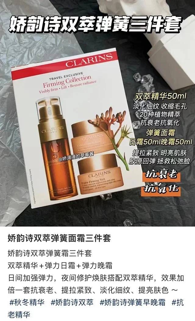 日霜提拉紧致,晚霜被美誉为“逆时光之面霜”,精华水补充肌肤水分,恢复轻熟肌弹性。一个套装,全面护理!很实用的三件套
