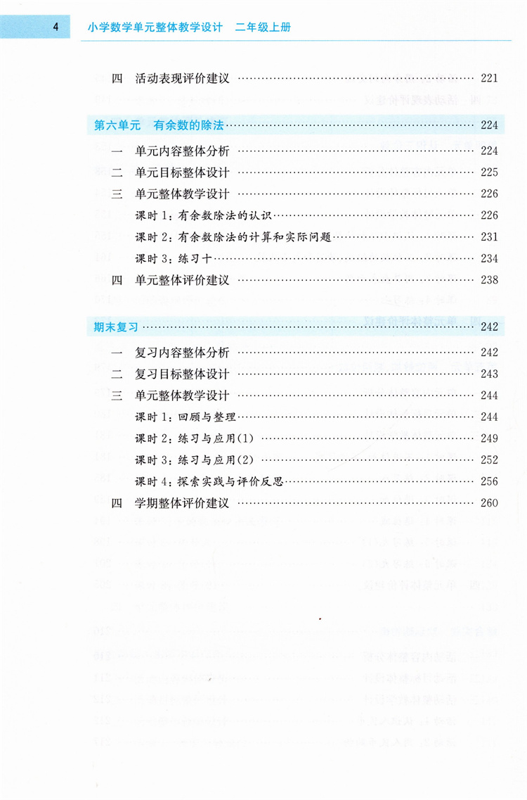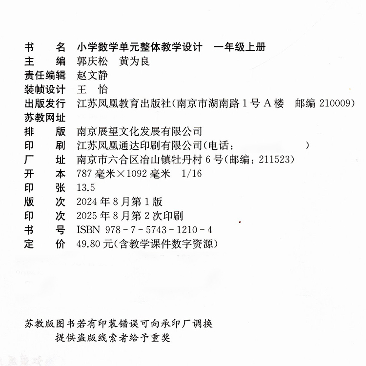 本书配套苏教版小学数学修订教材使用,为教师实施新课标理念下的数学教材的教学提供参考和示范。主要内容包括单元知识节点和知识结构图,单元教学目标和课时教学目标,单元 教学重点难点和关键点,课时教学设计和设计意图说明,以及单元教学评价。特点在于:努力体现新课程发展核心素养的课程目标,以单元教学目标统领课时教学目标;立足知识整体 结构分析单元教学内容,把握课时教学内容的逻辑;通过单元教学评价,落实教—学—评一致。