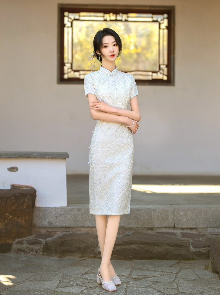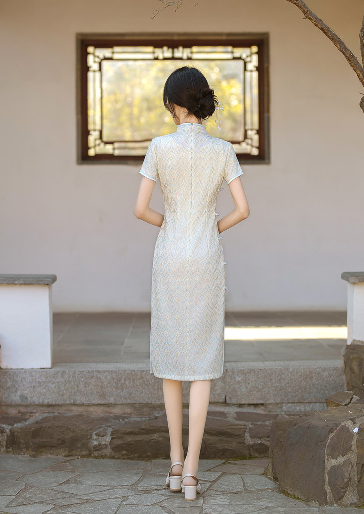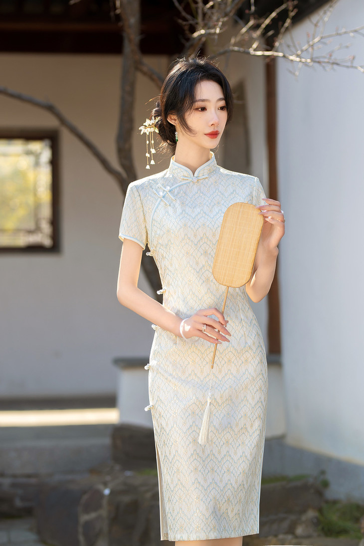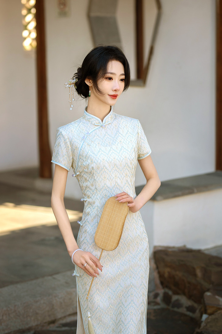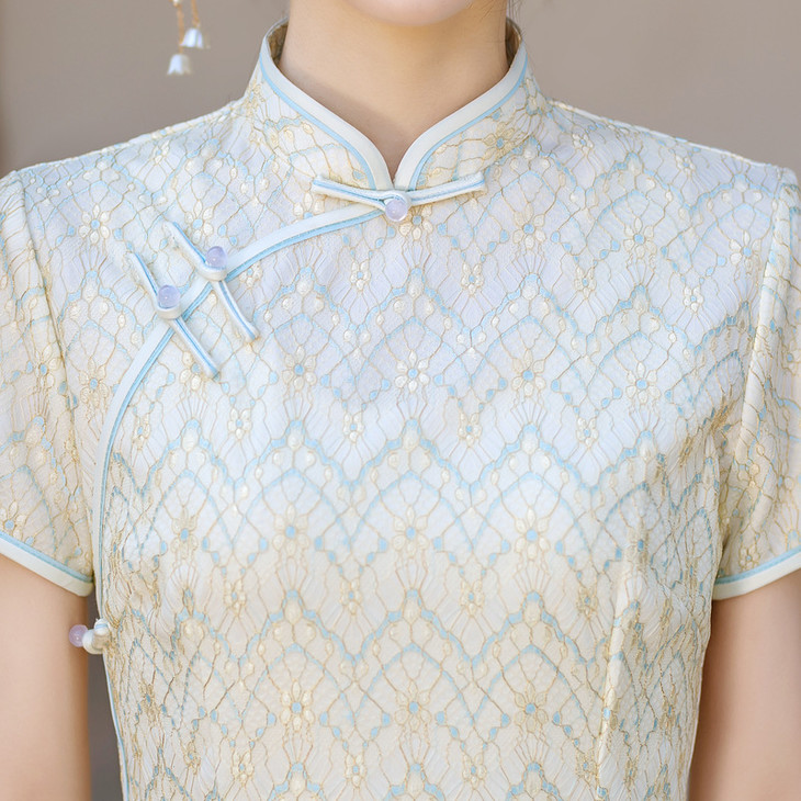 ZAYS2024夏季年轻气质短袖蕾丝复合中长旗袍日常淑女修身旗袍