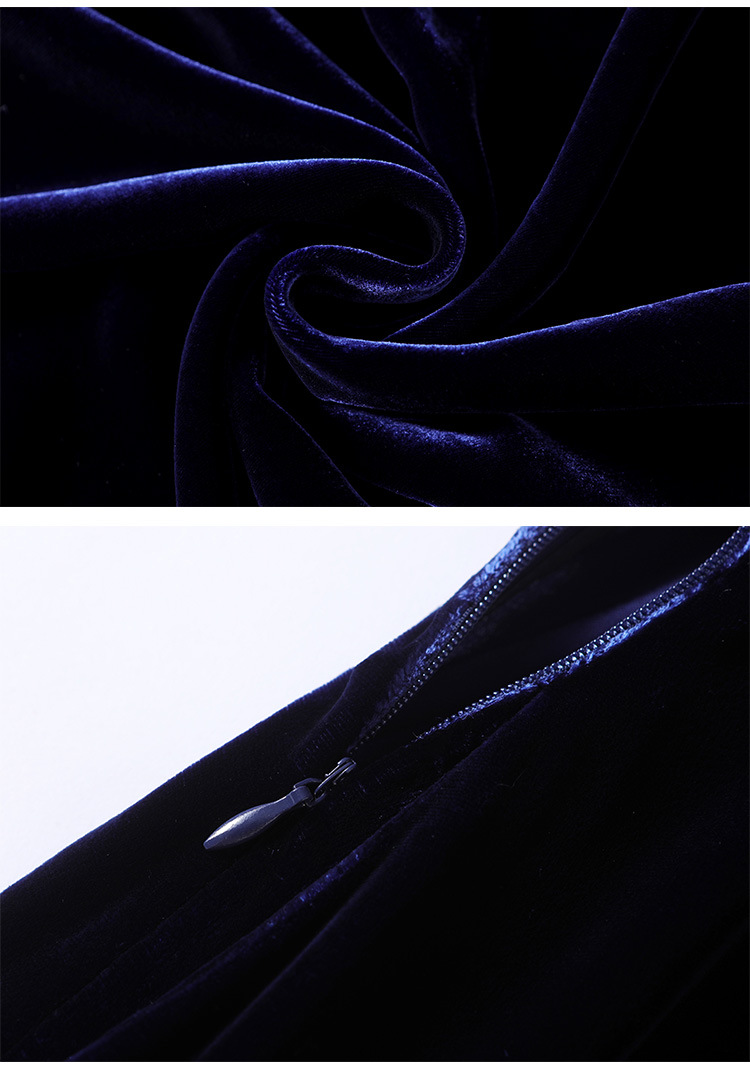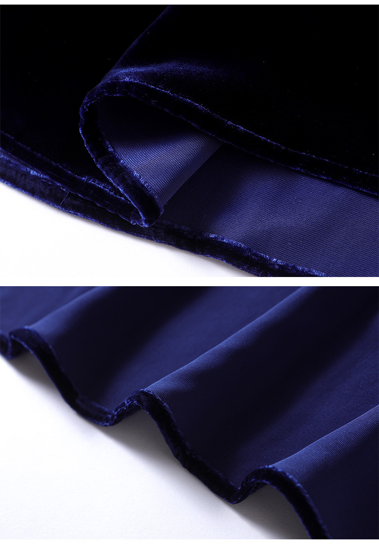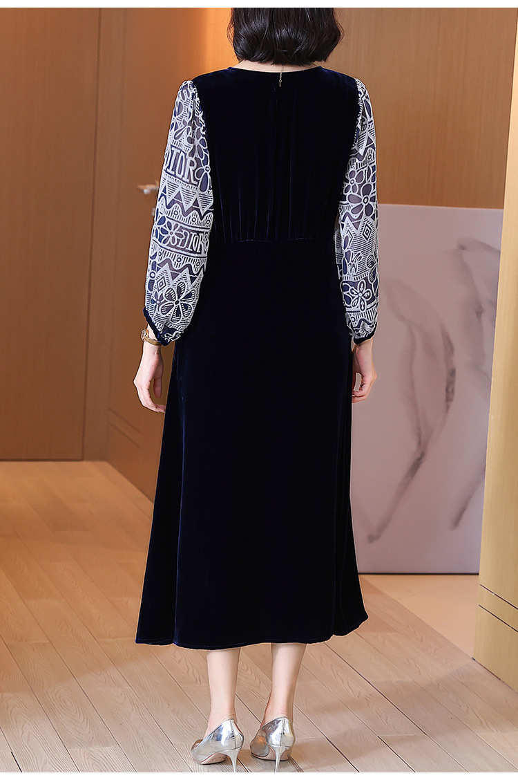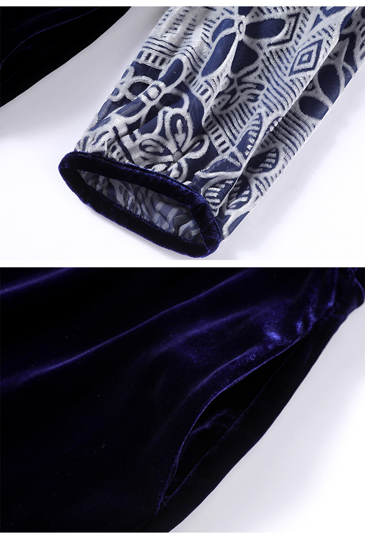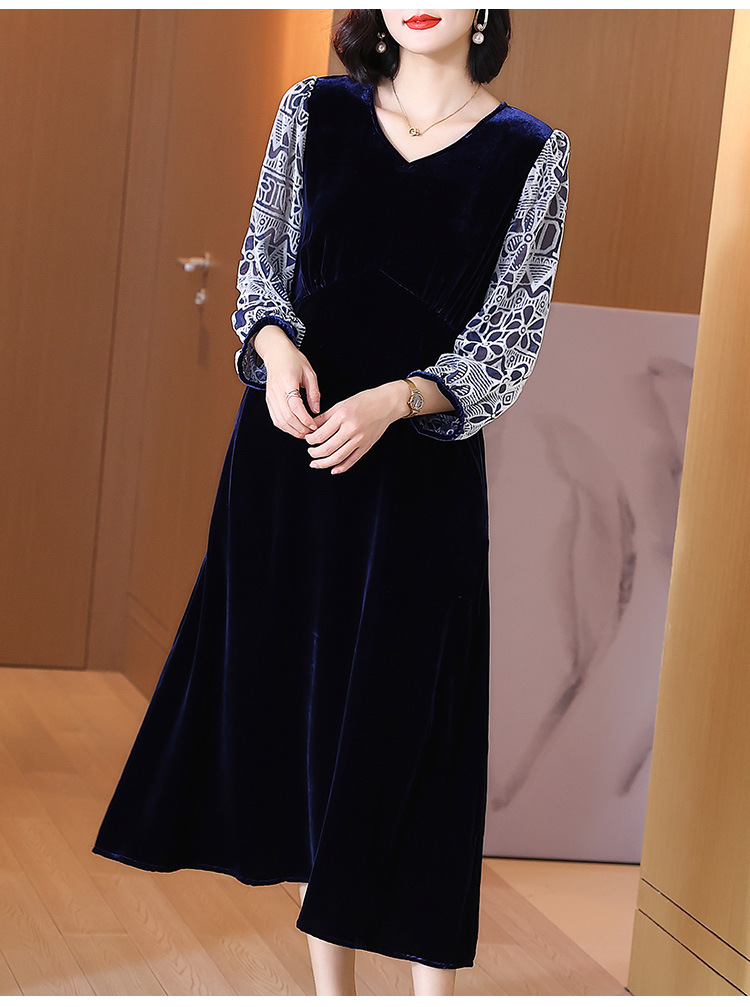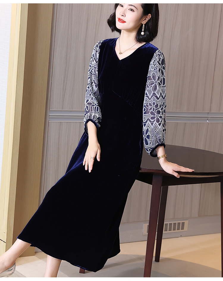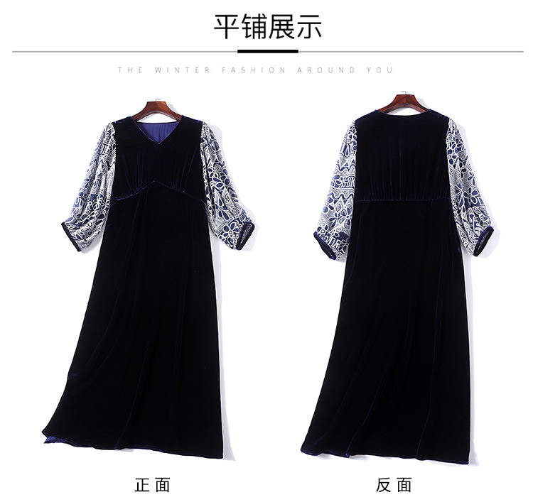 KDS-8919真丝丝绒连衣裙时尚V领拼接烧花七分袖连衣裙