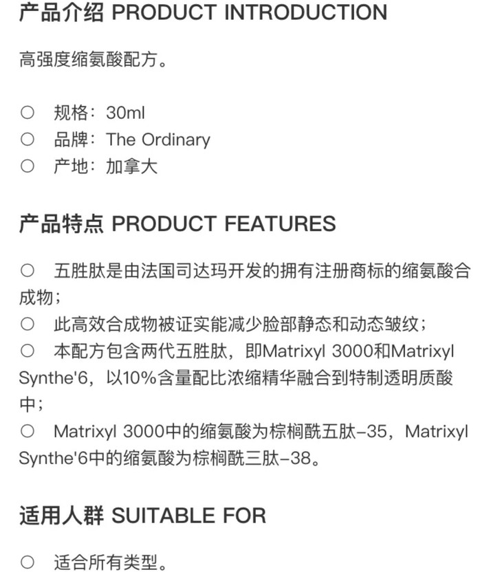 加拿大 The ordinary10%五胜肽抗老修护精华30ml👍轻熟龄和熟龄肌的秘密武器🧐。10%五胜肽➕透明质酸,高浓度浓缩精华液专注抗老👊,尤其针对静态纹,抚平皱纹。五胜肽有保湿💦、阻止弹力蛋白分解、促进胶原蛋白增生等效果。可以为皮肤提供长期的抵御衰老和平滑作用,使皮肤更加富有弹性〰这款可以全脸使用哦🤪!
