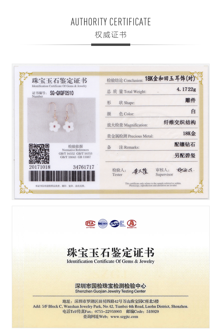 18K玫瑰金和田玉(白玉)镶钻耳饰--三生三世