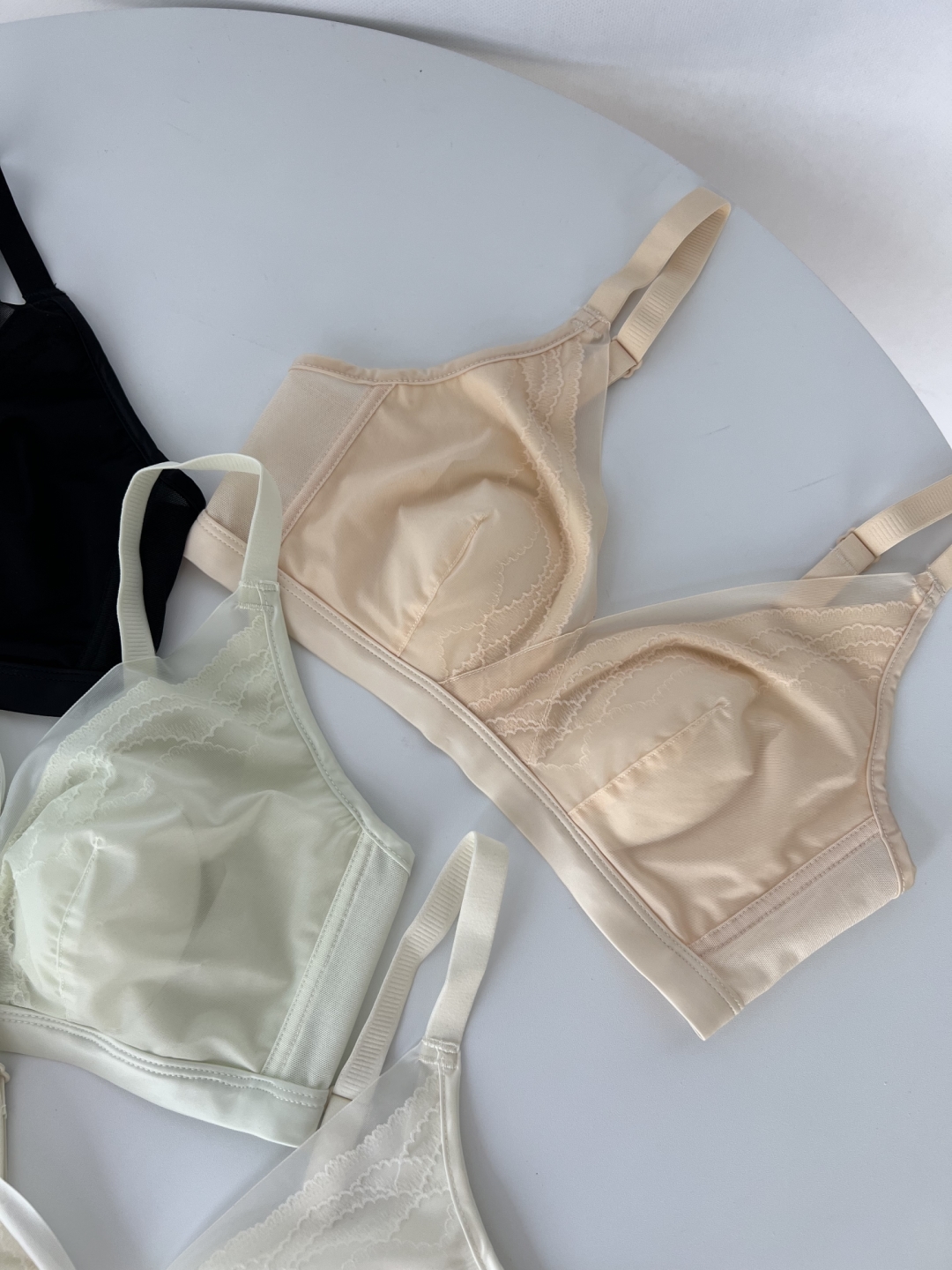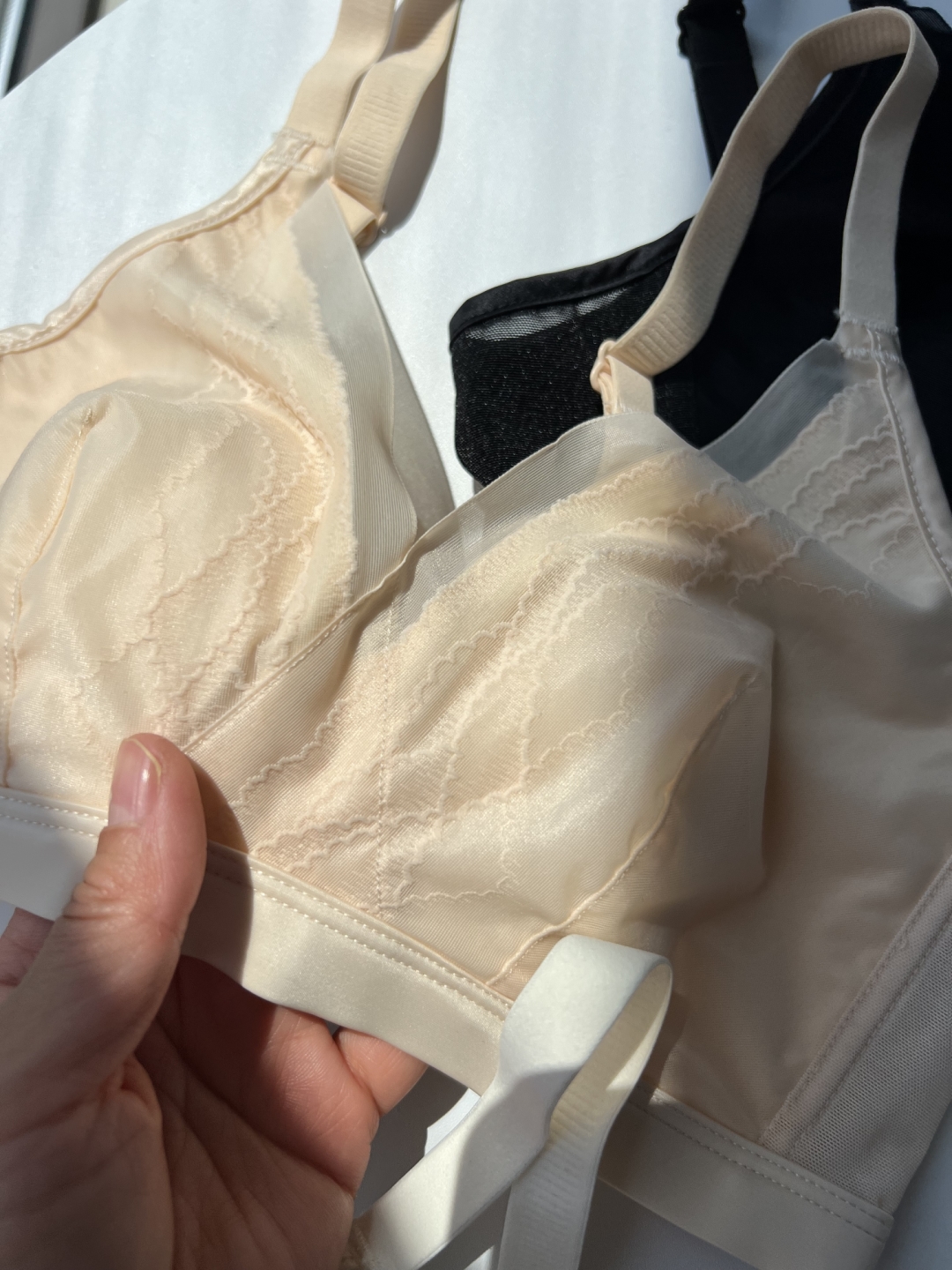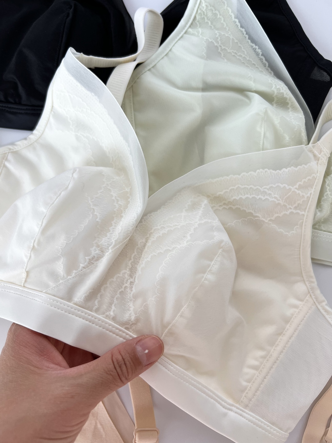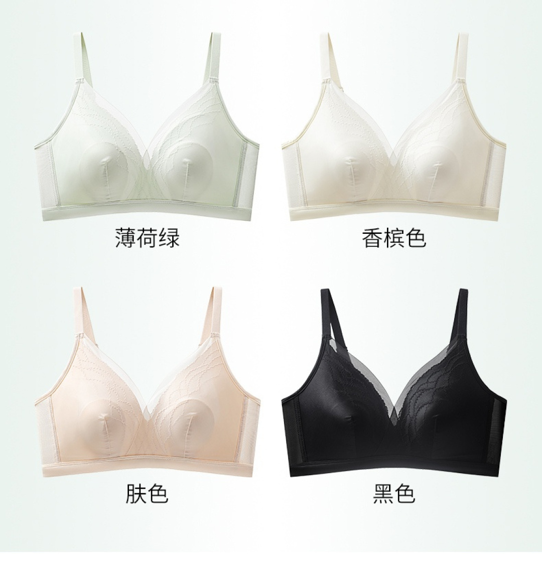 码数非常适合想要纸片人效果的姐妹 整件内衣厚度不足0.3cm拥有更充盈的包容空间 客供提花蕾丝 柔软细腻不扎肉 搭配缎感包边 勾勒性感深V曲线 无钢圈设计让胸部舒适自在