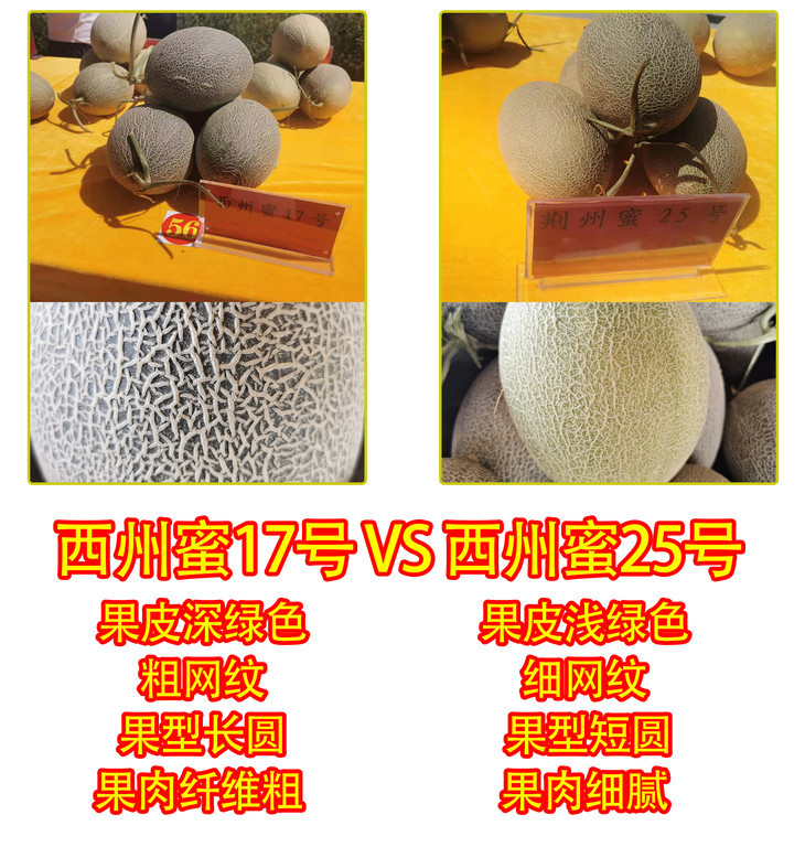 西州蜜25号:身材偏椭圆形、表皮呈现青绿色,比较平滑,外表是个小清新子,内心更是个小甜甜,风味独特,瓜肉肥厚,清脆爽口,脆甜多汁,是蜜瓜界的人气MVP选手,在蜜瓜品种当中品质最高,被誉为“瓜中之王”,所以价格也相对要比西州蜜17号略高一些。