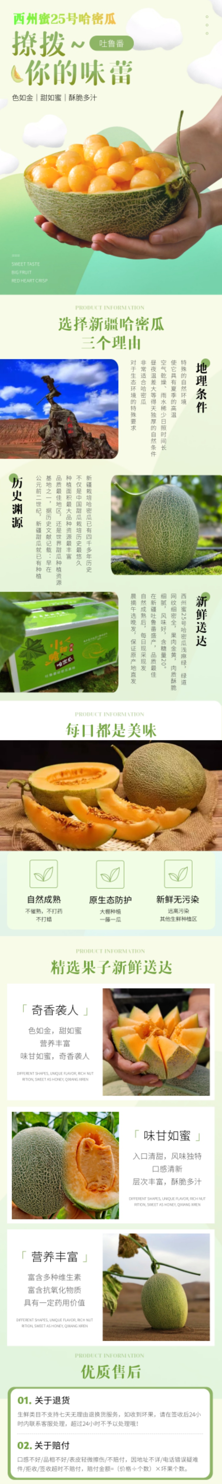 尝在口中,甜在心里! 精选西州蜜25号品种, 果肉质厚,甜度高,肉厚细质! 香甜清脆,水分足,甜度脆度高于一般蜜瓜!