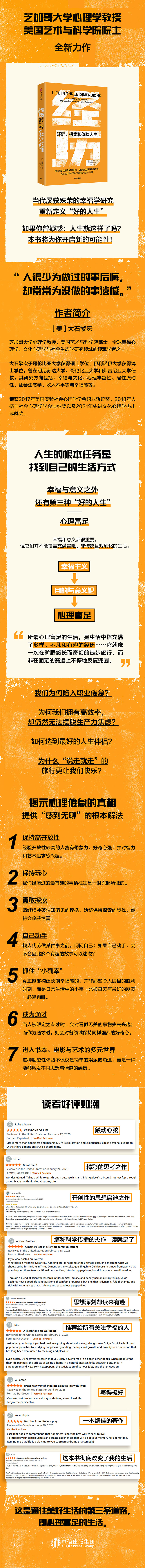 所谓心理富足的生活,是生活中指充满了多样、不凡和有趣的经历,这些经历能够丰富你的视角:它不是一条笔直平坦的道路,而是一段戏剧性十足、波澜起伏的旅程;它充满了多样性和复杂性;它会让你遇到许多停顿、迂回和转折点;它就像一次在旷野悠长而奇幻的徒步旅行,而非在固定的赛道上不停地反复兜圈。如果你没有按照自己想要的方式来审视这个世界,我们终将遗忘生命的自主权。因此,请谨记这是我们一的人生,并且我们希望它比现状更好——也许是更多的幸福、更多的意义,或者,更多的心理富足。