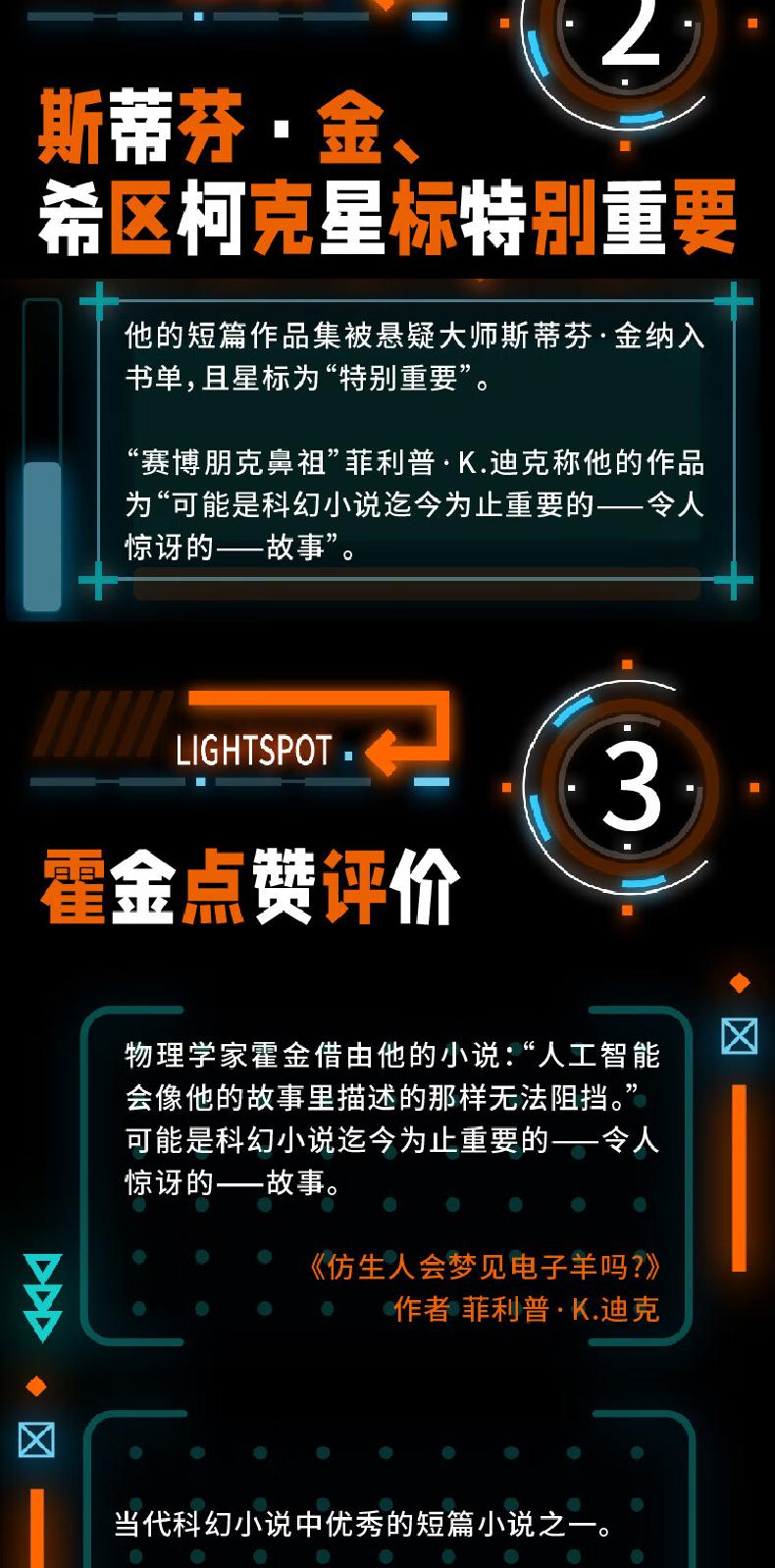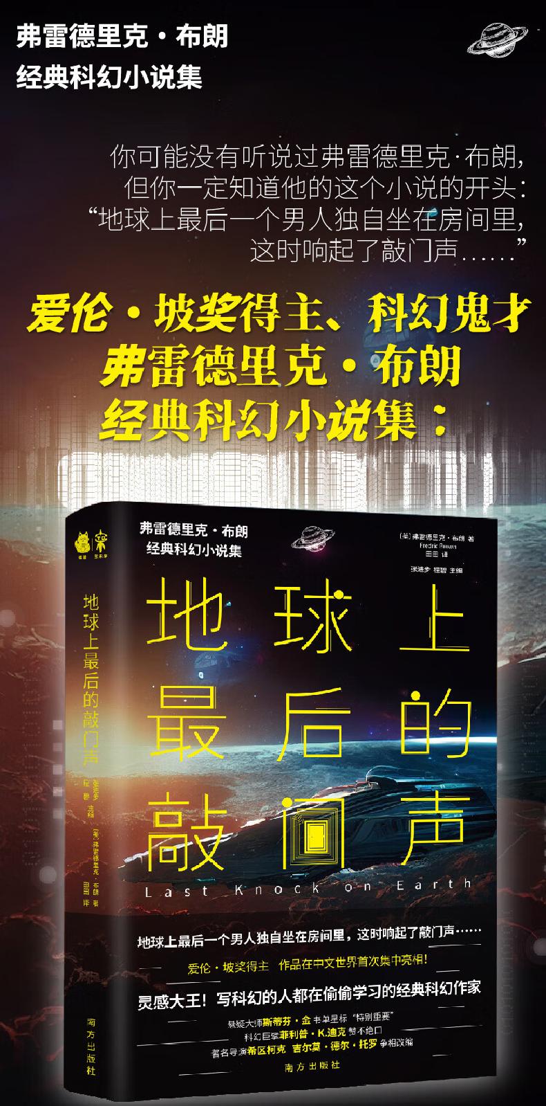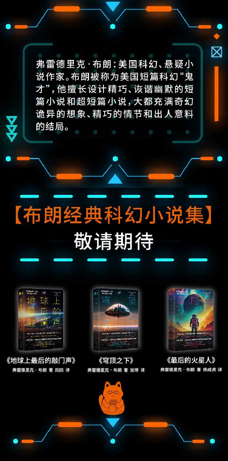 弗雷德里克·布朗:美国科幻、悬疑小说作家。布朗被称为美国短篇科幻“鬼才”,他擅长设计精巧、诙谐幽默的短篇小说和超短篇小说,大都充满奇幻诡异的想象、精巧的情节和出人意料的结局。他的短篇作品集被悬疑师斯蒂芬·金纳入书单,且星标为“特别重要”。