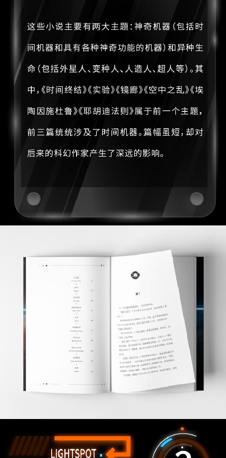 其中,《时间终结》《实验》《镜廊》《空中之乱》《埃陶因施杜鲁》《耶胡迪法则》属于一个主题,前三篇统统涉及了时间机器。篇幅虽短,却对后来的科幻作家产生了深远的影响。我国科幻作家刘慈欣的《坍缩》和日本科幻作家广濑正的《负零》中都能找到它们的影子。