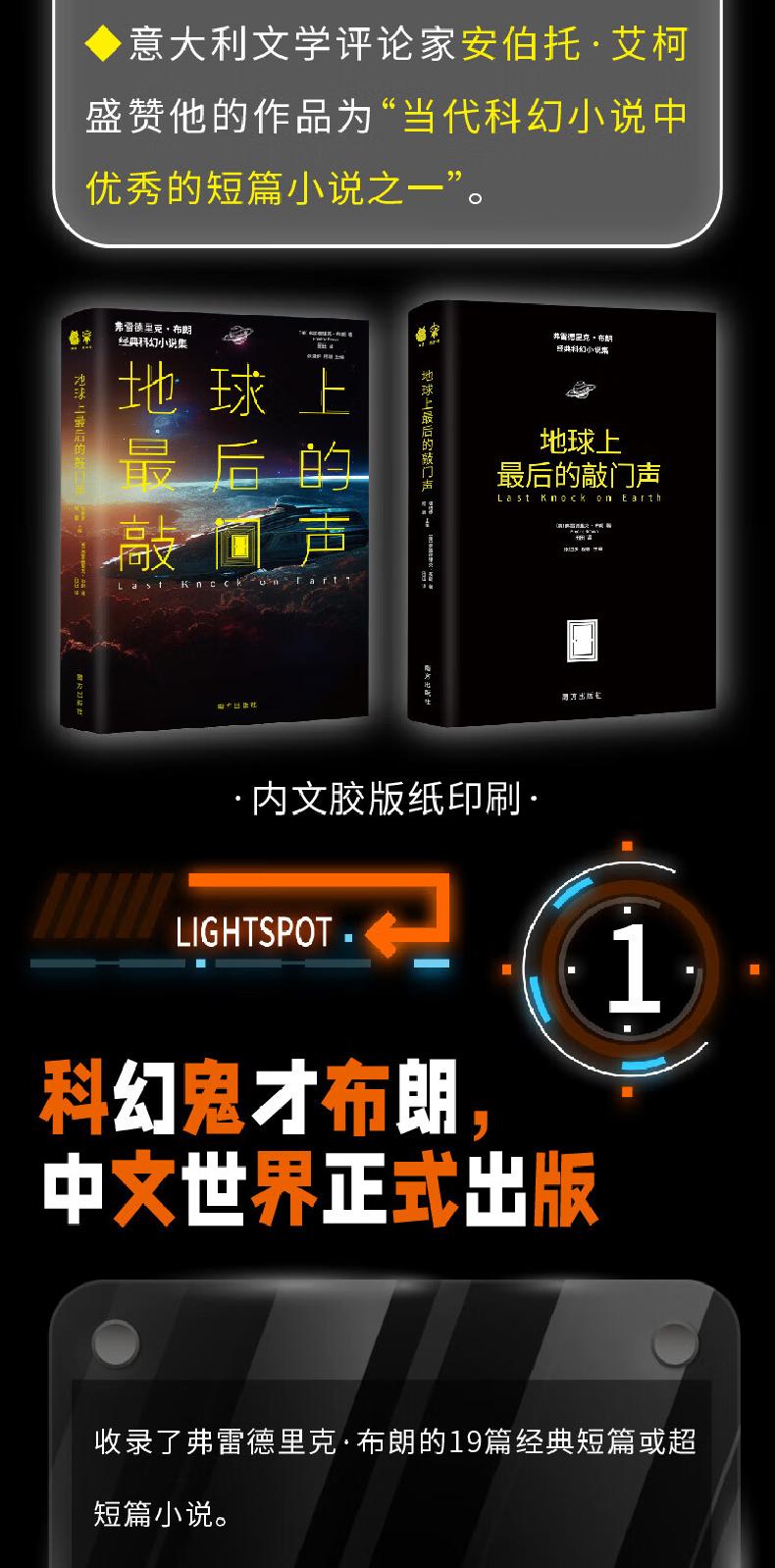 《地球上后的敲门声》收录了弗雷德里克·布朗的19篇典短篇或超短篇小说。这些小说主要有两大主题:神奇机器(包括时间机器和具有各种神奇功能的机器)和异种生命(包括外星人、变种人、人造人、超人等)。