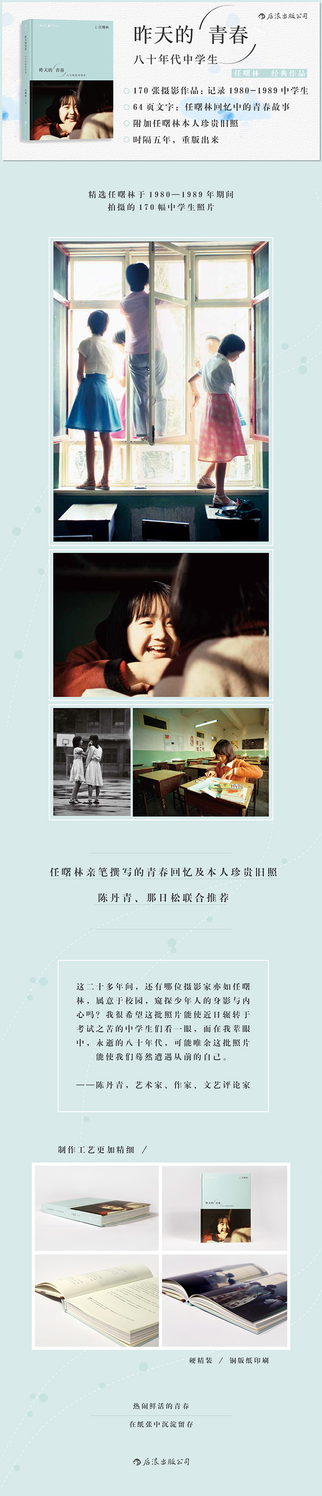 书中前64页为任曙林的回忆文字,分享了他的青春故事:跟随恩师狄源沧学艺的点滴、与影友惺惺相惜的友情、拍摄中学生的动机、在校园内外与师生的交往……后224页为四色印刷的168张作品,和任曙林本人的珍贵旧照。