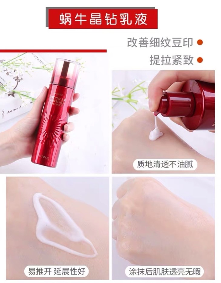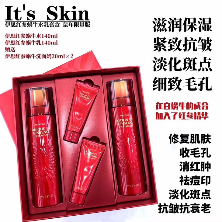 伊思红参蜗牛水乳洁面套(鼠年限量版)👍伊思这一品牌被号称平民的“LAMER”😍,蜗牛系列精粹在于神奇的粘液精华成分的修复嫩肤之功效。这款添加红参成分❤,可修复改善受损肌肤,光泽嫩滑肌肤,👊抗衰老,淡化痘印、疤痕、红血丝等,💁适合毛孔粗大、有皱纹、干燥肌肤及过敏性肌肤使用。套装包括:蜗牛水140ml➕蜗牛乳140ml➕蜗牛洗面奶20ml*2。