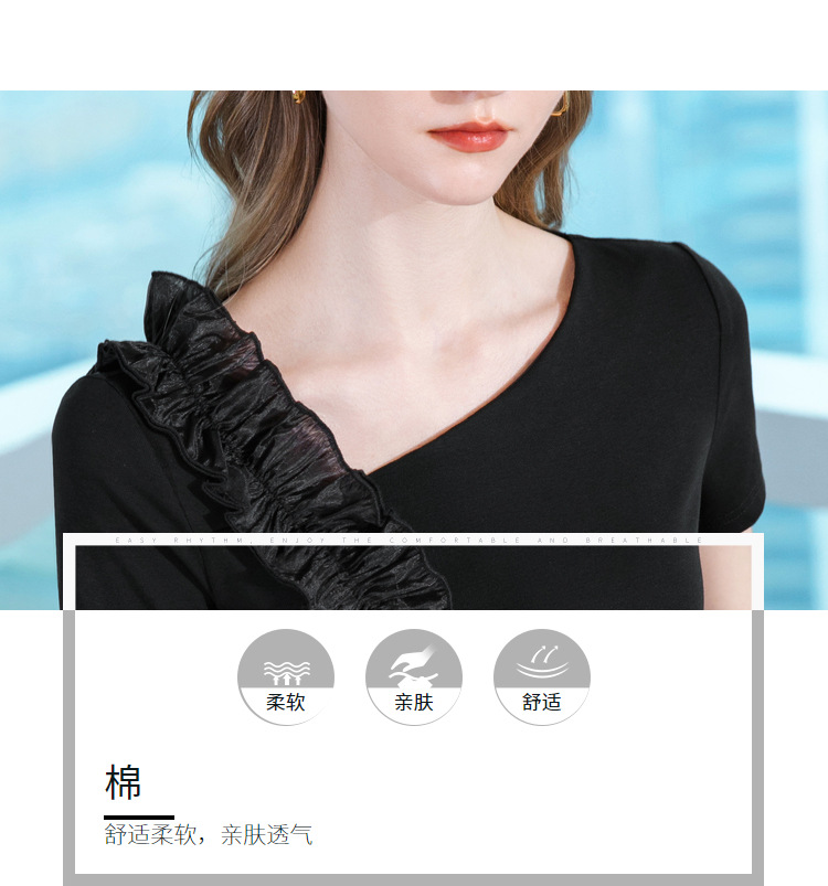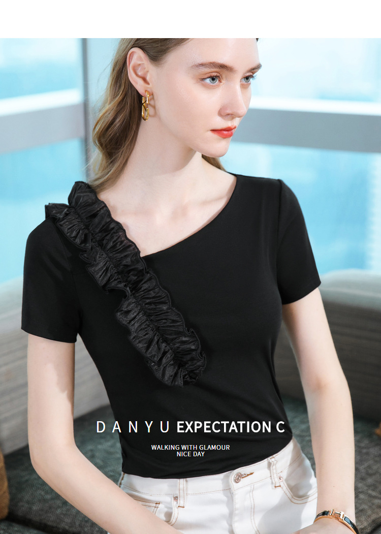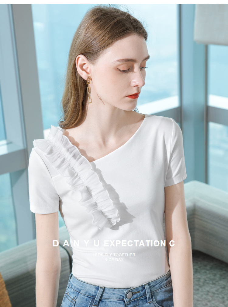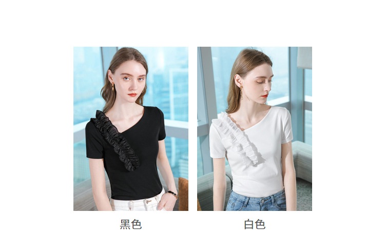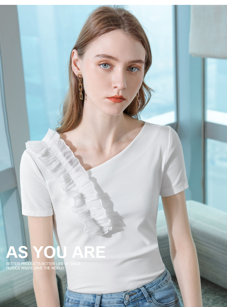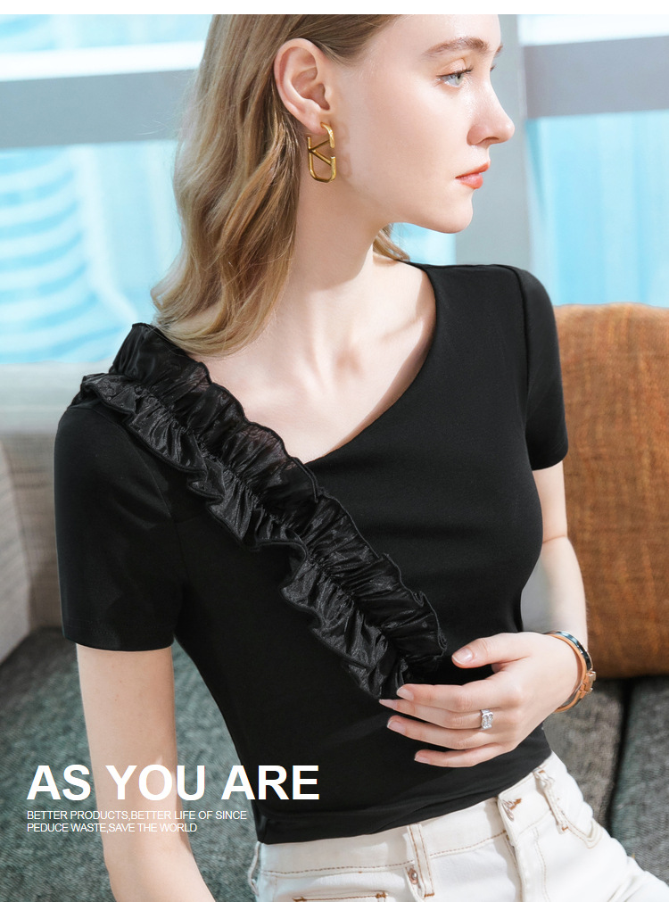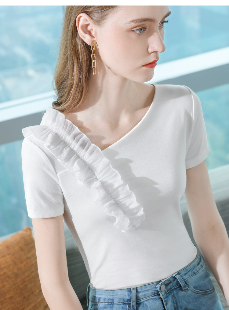 短袖T恤,设计感小众斜肩v领法式荷叶边上衣SG-T2X2553