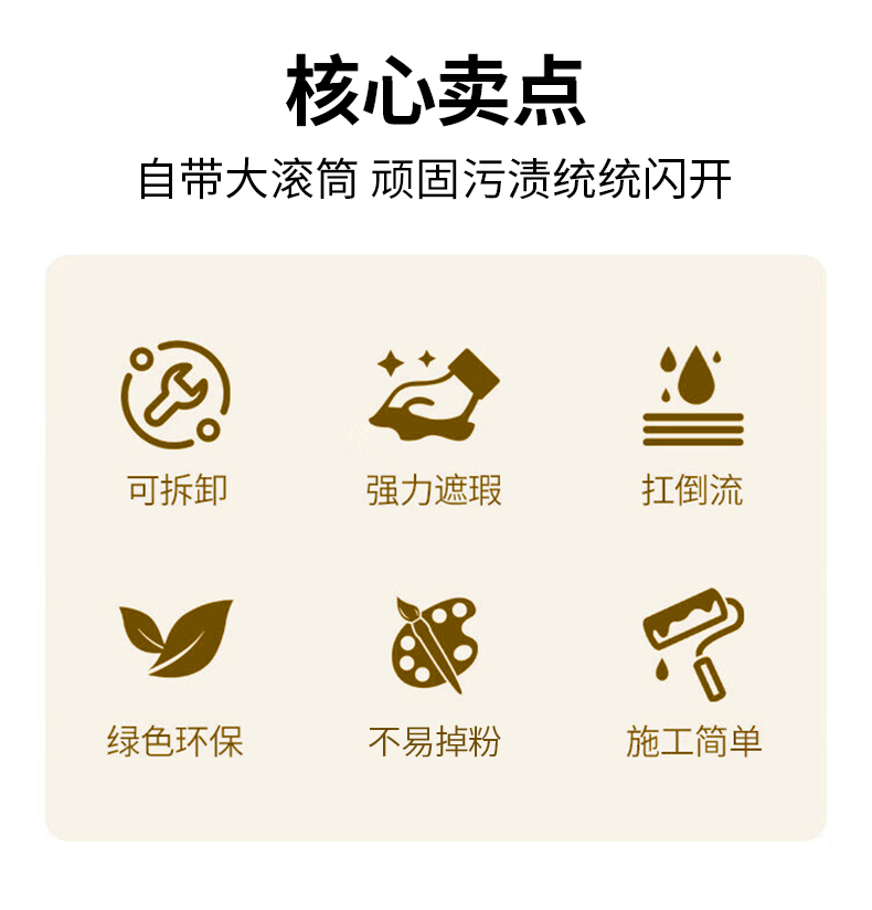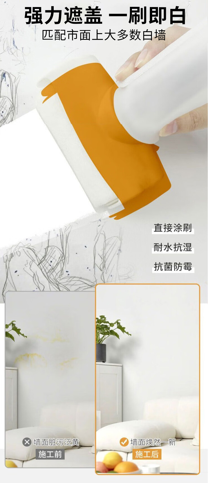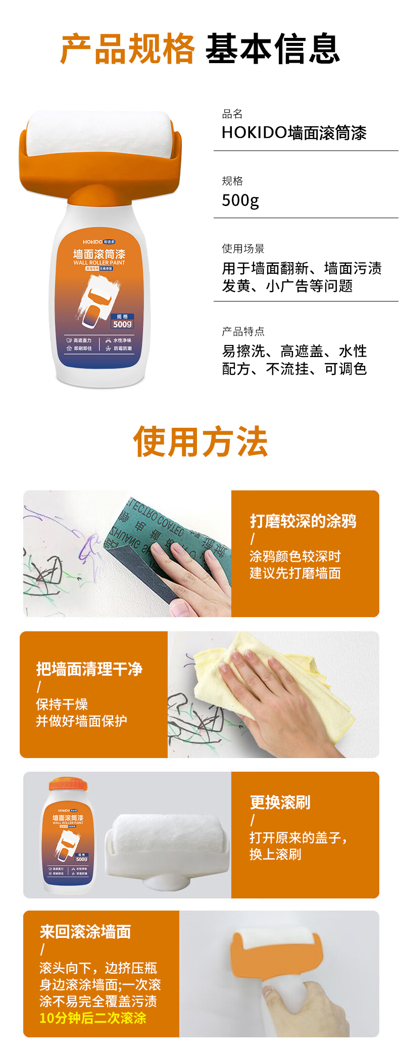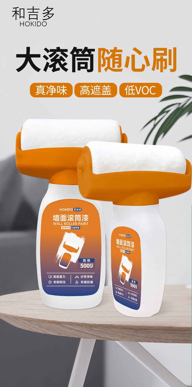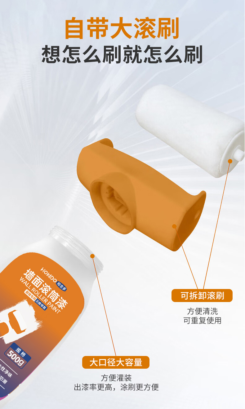 HOKIDO 墙面滚筒漆 500g*3瓶+滚筒*1个 自带大滚刷操作轻松,强力遮盖一刷即白,细腻不留挂,快速干燥,耐磨持久;雨季霉斑、涂鸦印记、墙面发黄等均适用;