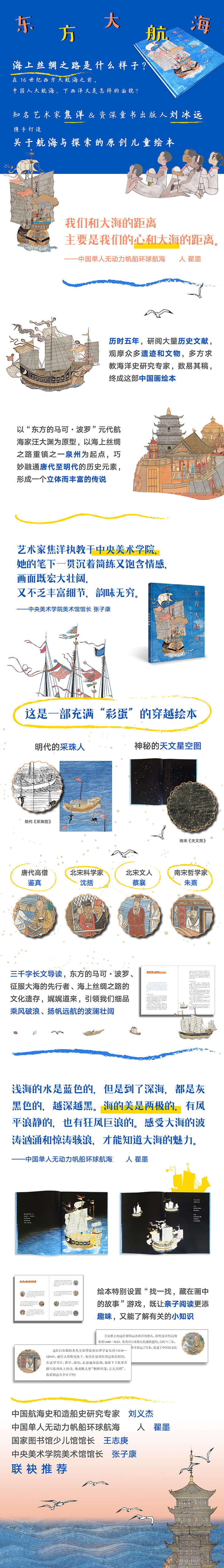 海上丝绸之路是什么样子?在16世纪西方大航海之前,中国人大航海、下西洋又是怎样的面貌?知名艺术家焦洋、童书编辑刘冰远携手打造关于航海与探索的原创儿童绘本。