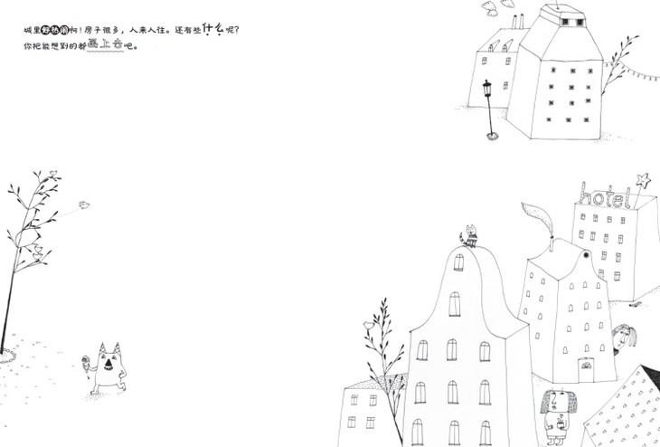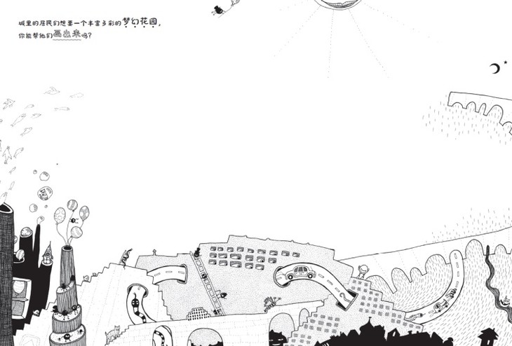 “创意涂鸦”系列的图画设计并不局限于“把图画完”,更重要的是如何发展和延续图片的思路。在这套书中,想象力是第一位的——书中每个场景都附有一句启发性的话,能引导、激励孩子们发挥想象力去编织自己的故事,同时发挥创造力接着构造出完整的故事画面。