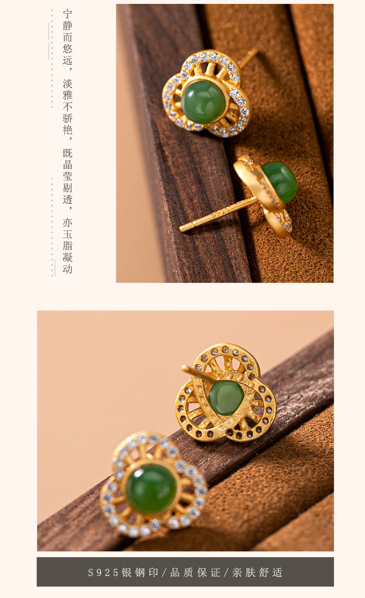 S925纯银镀金,镶嵌和田玉碧玉复古个性镂空小花耳钉CW