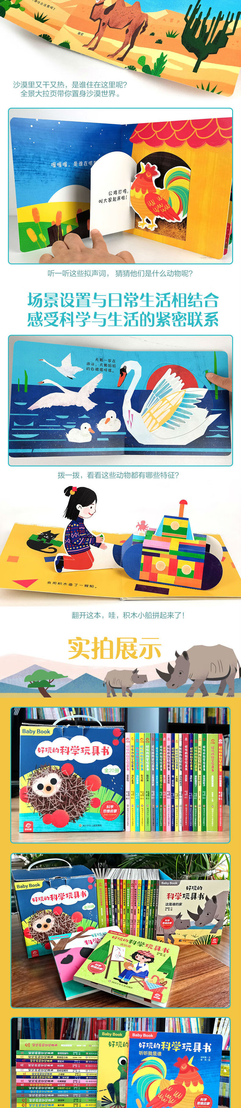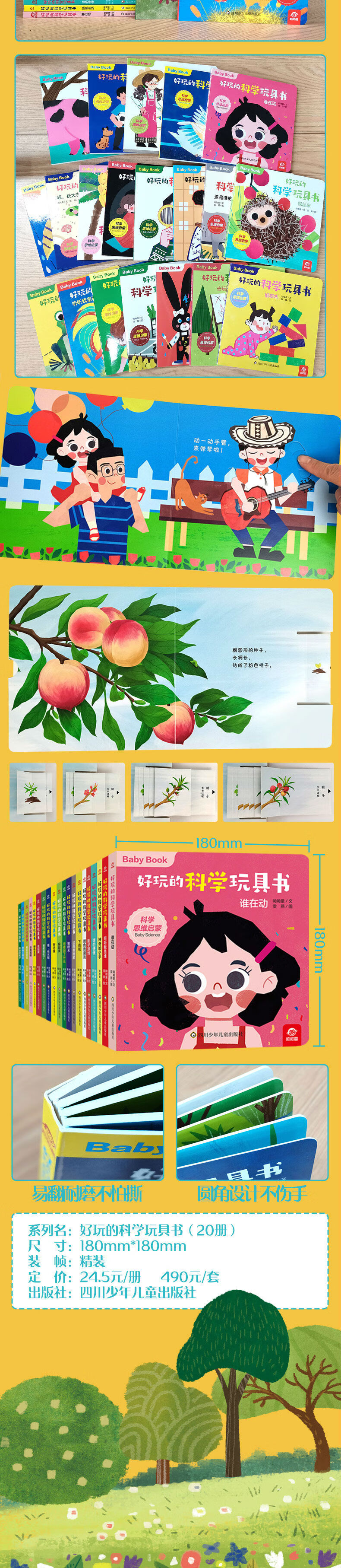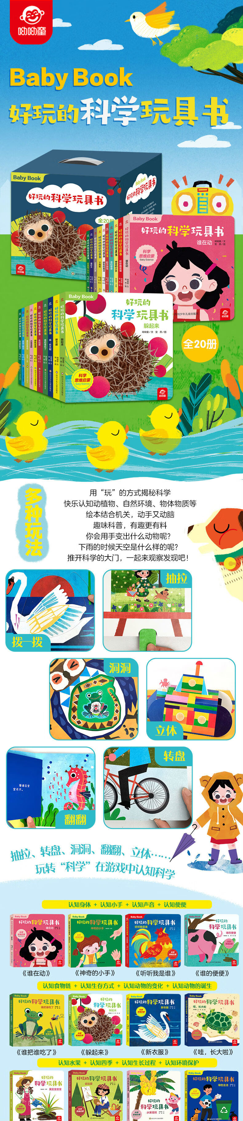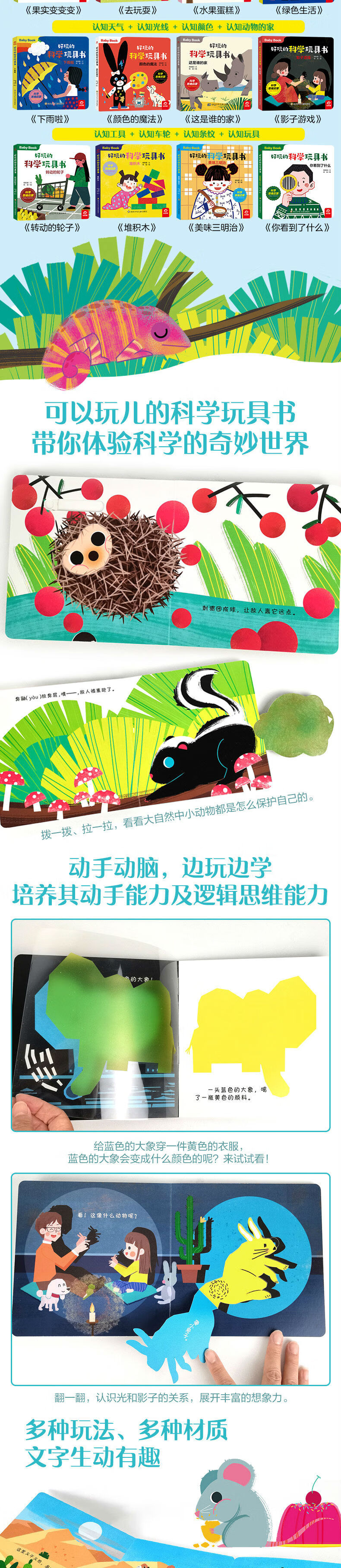 本套书是科学玩具书,共分为20册。根据不同主题进行划分。分别为:美味三明治、影子游戏、水果蛋糕、颜色的魔法、去玩耍、这是谁的家、神奇的小手、你看到了什么、绿色生活、谁在动、转动的车轮、 听听我是谁、果实变变变、下雨啦、 新衣服、躲起来、堆积木、谁的便便、谁把谁吃了、哇,长大啦。通过动手游戏,分别讲述了光和影子、雨、环境保护等科学物质的名称、概念与特性。