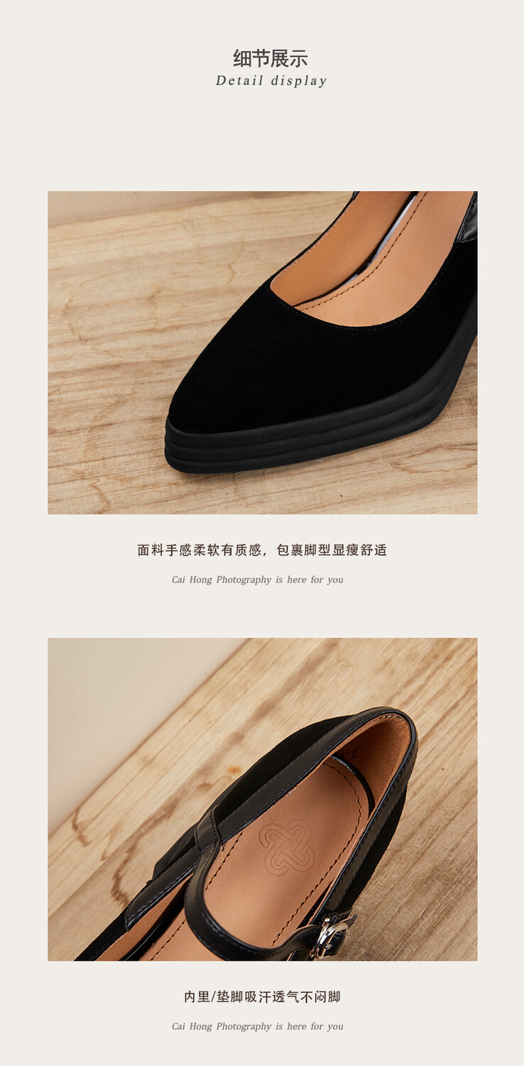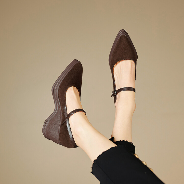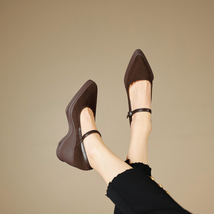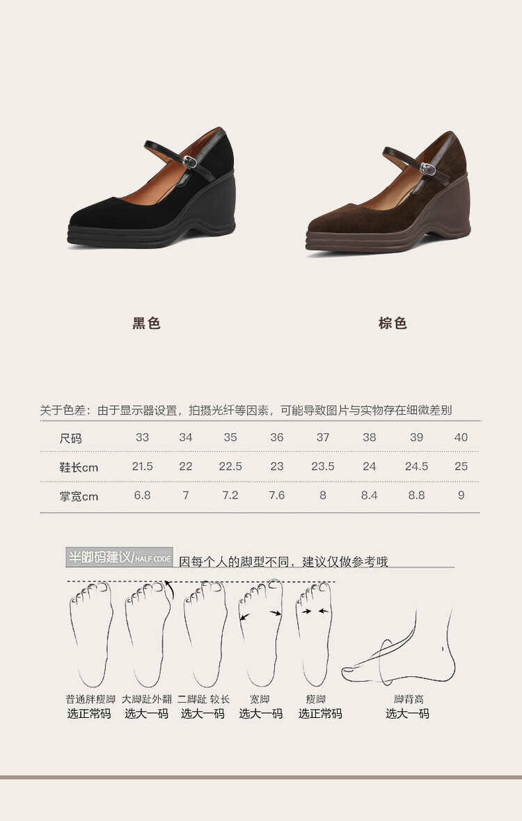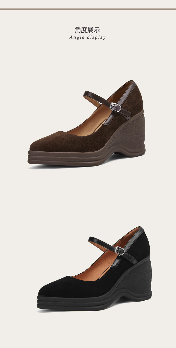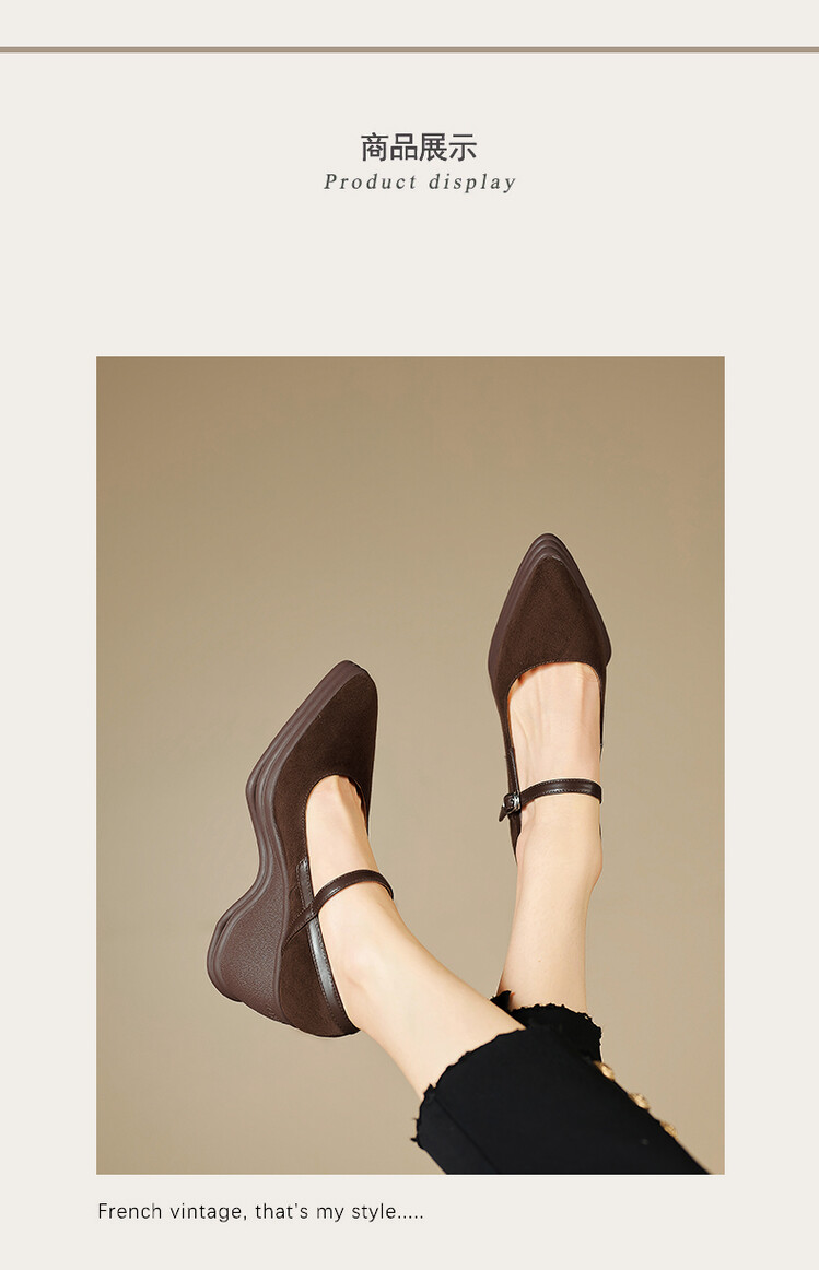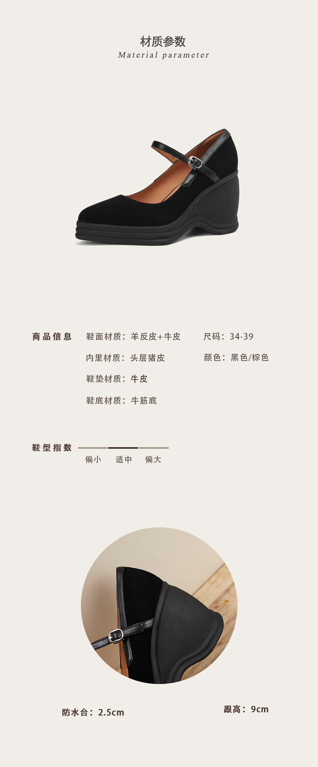 货号:N9467颜色:黑色 棕色跟高:9CM水台: 2.5CM鞋码:34-39鞋面材质:羊反皮+牛皮鞋 垫:牛皮内里材质:头层猪皮鞋底材质:牛筋底