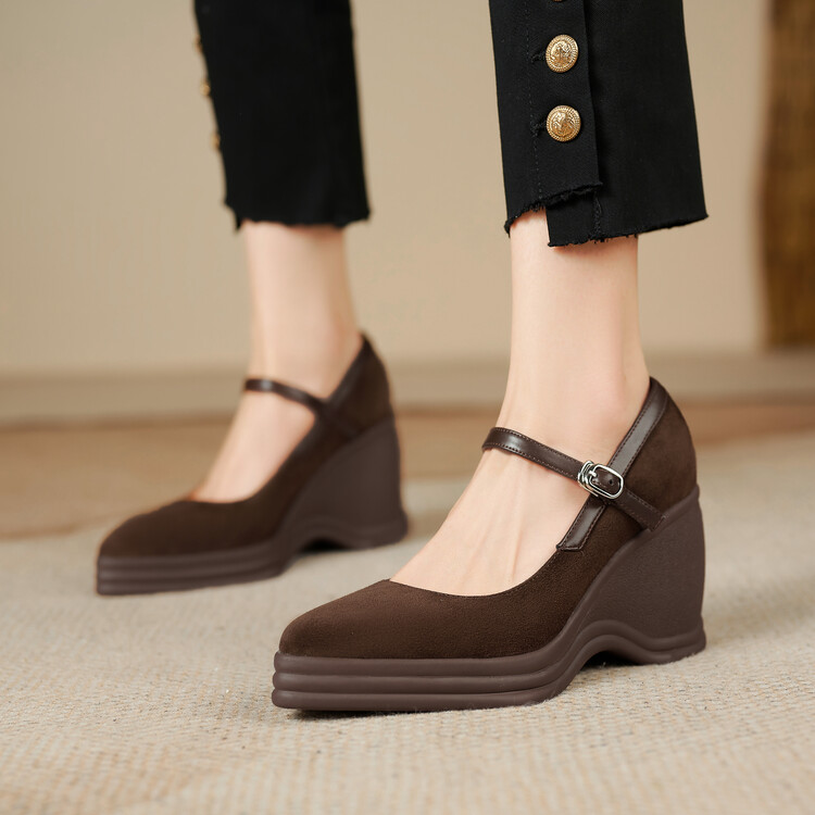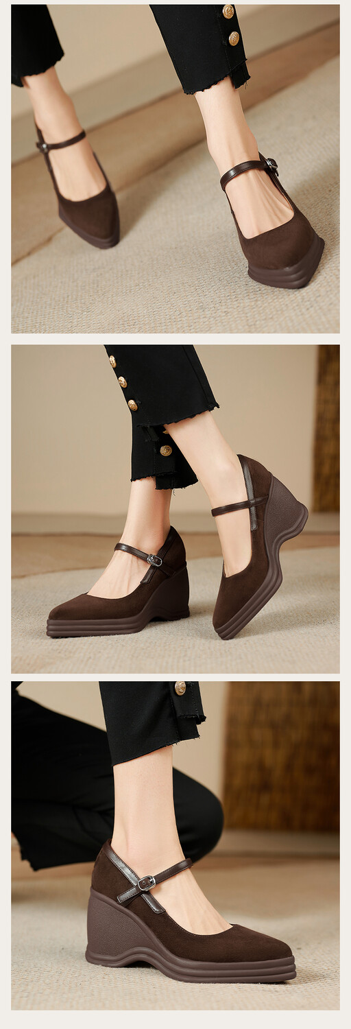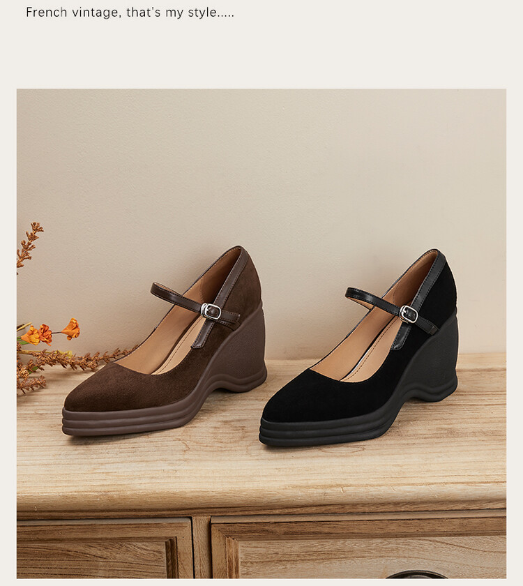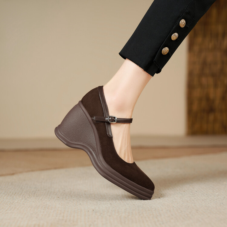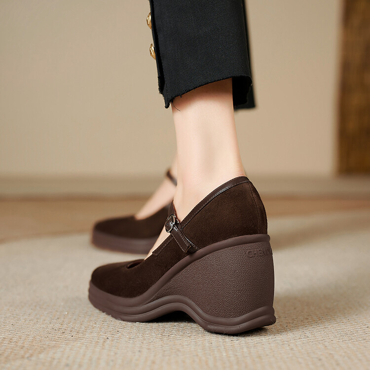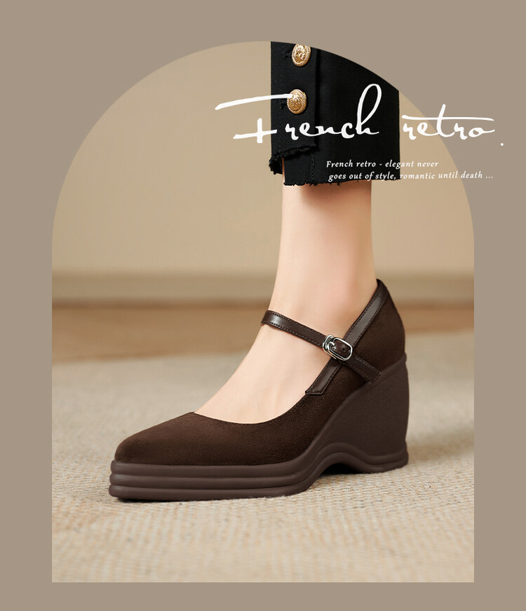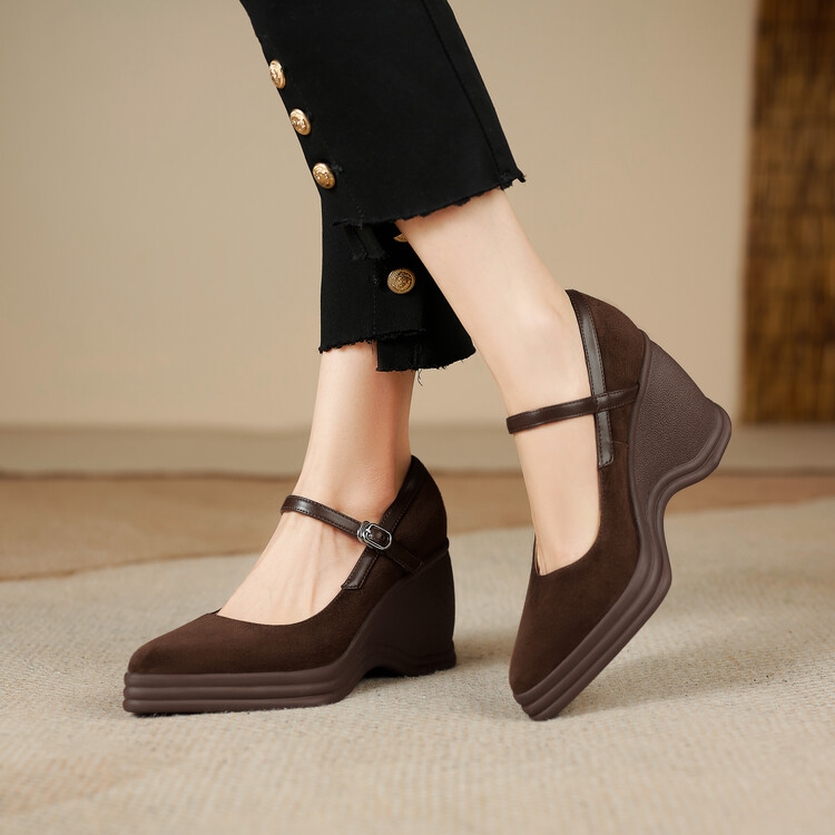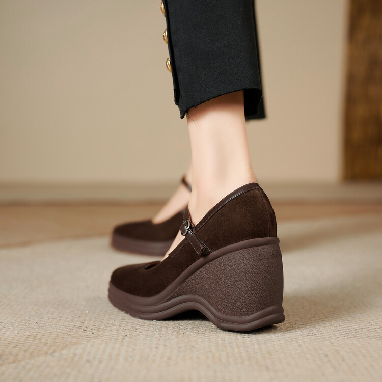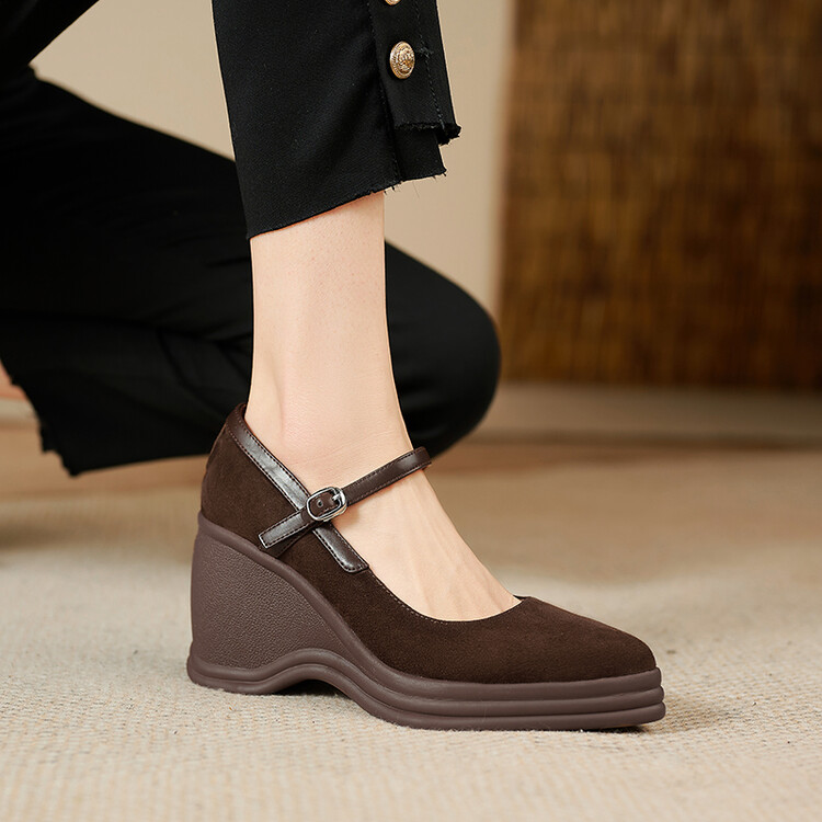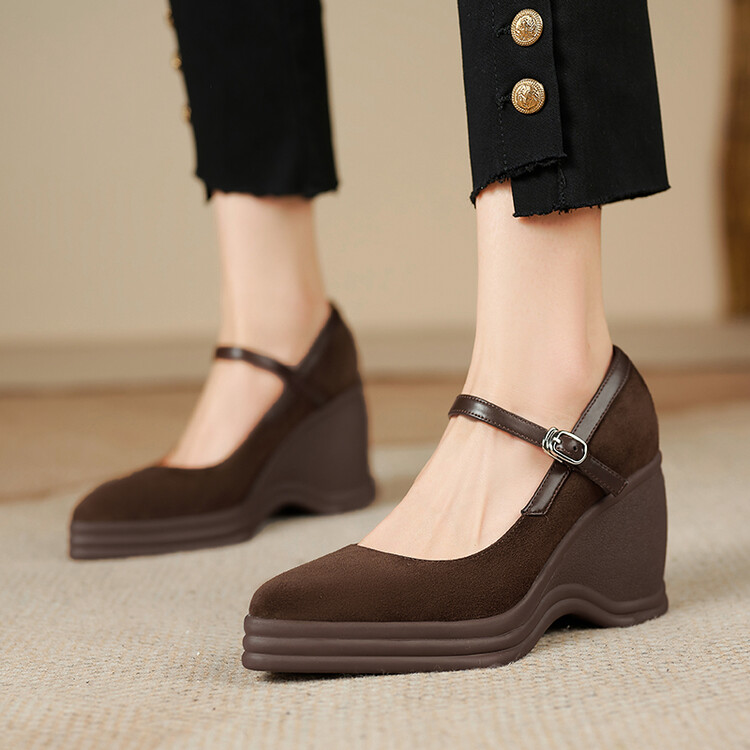 货号:N9467颜色:黑色 棕色跟高:9CM水台: 2.5CM鞋码:34-39鞋面材质:羊反皮+牛皮鞋 垫:牛皮内里材质:头层猪皮鞋底材质:牛筋底