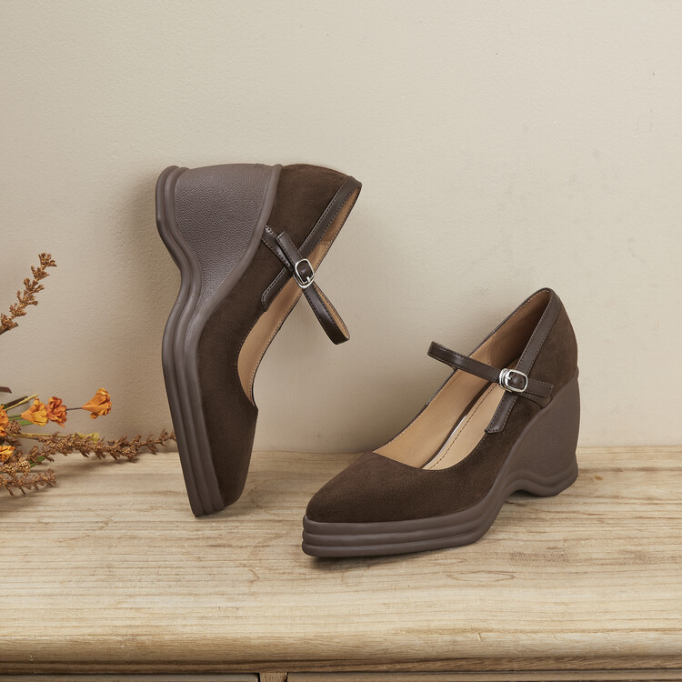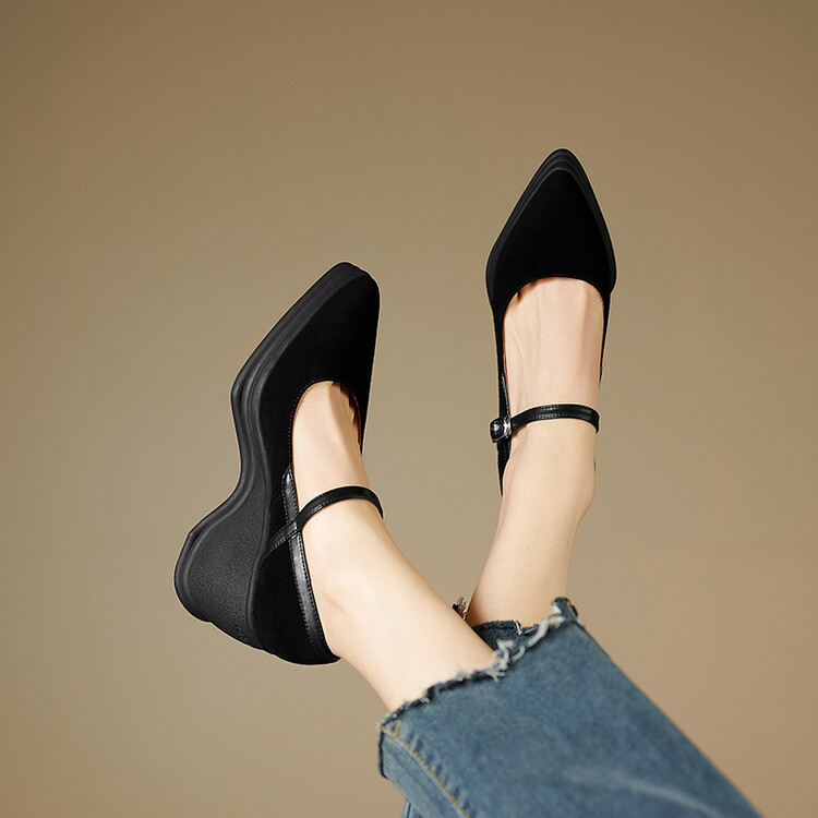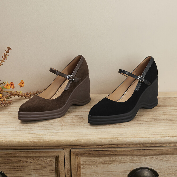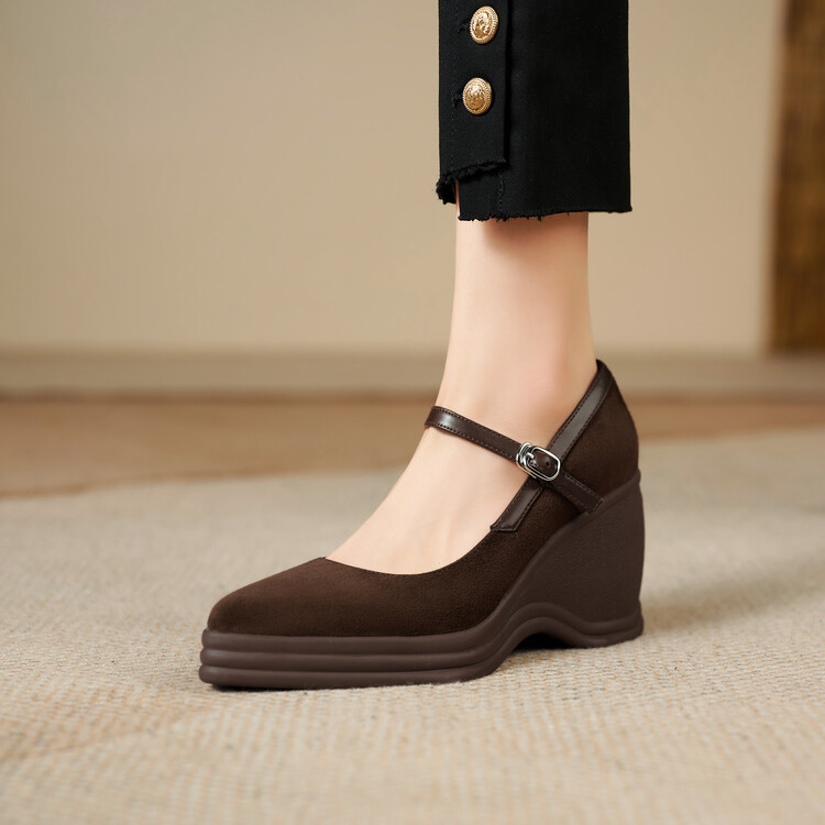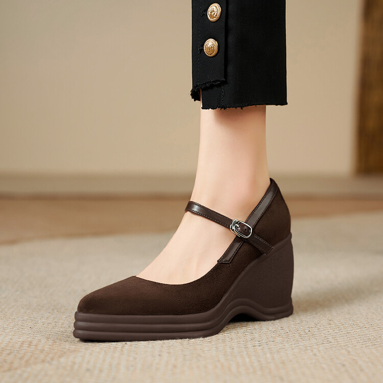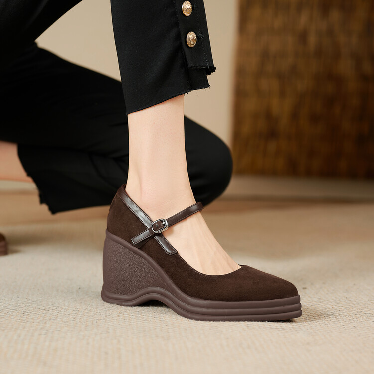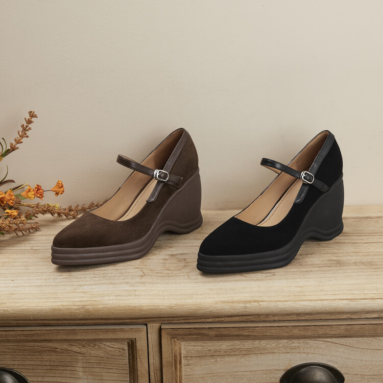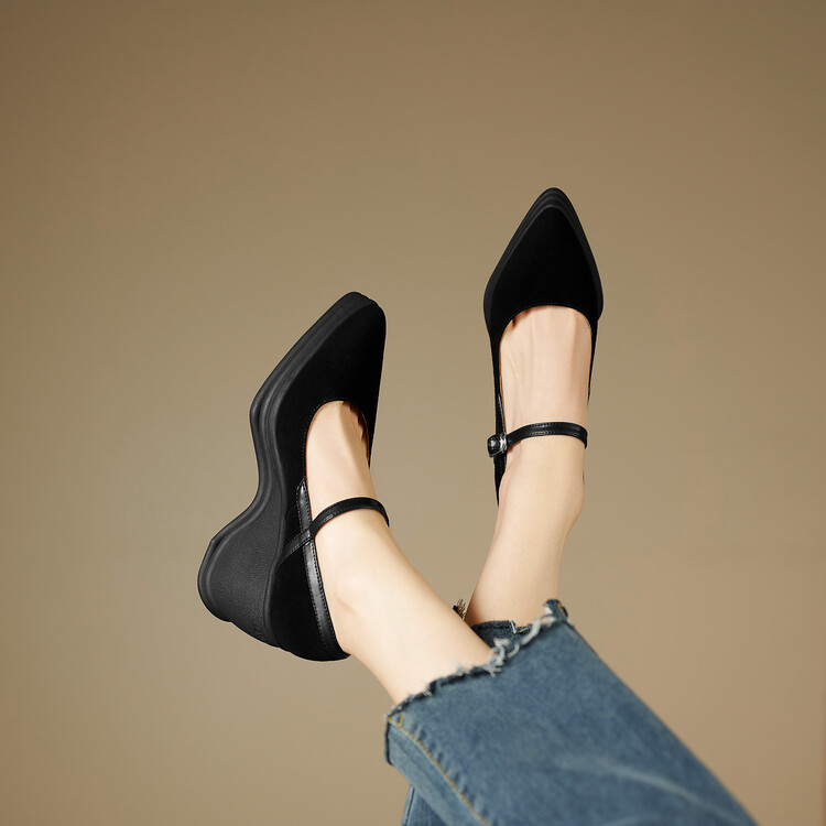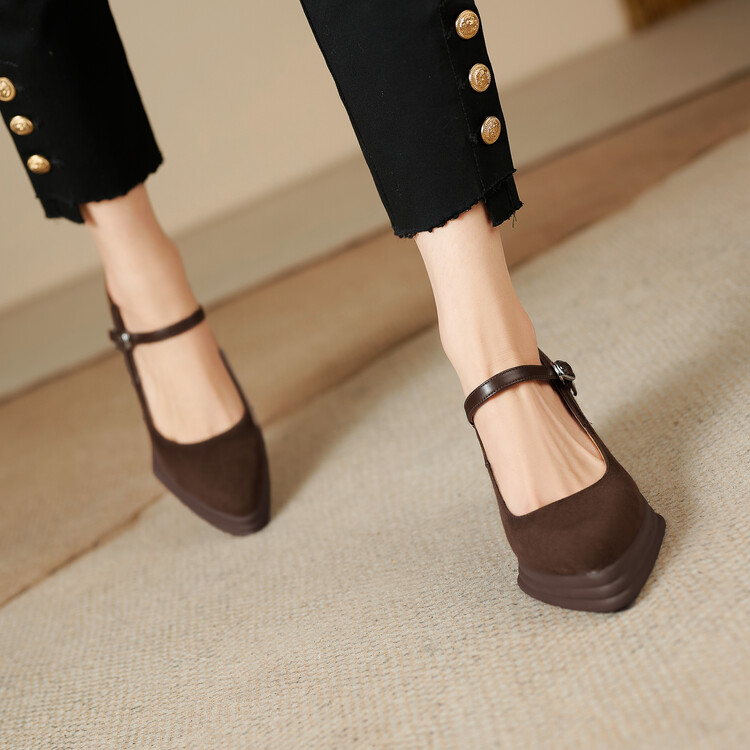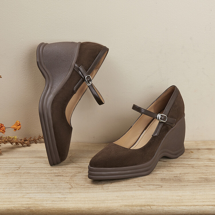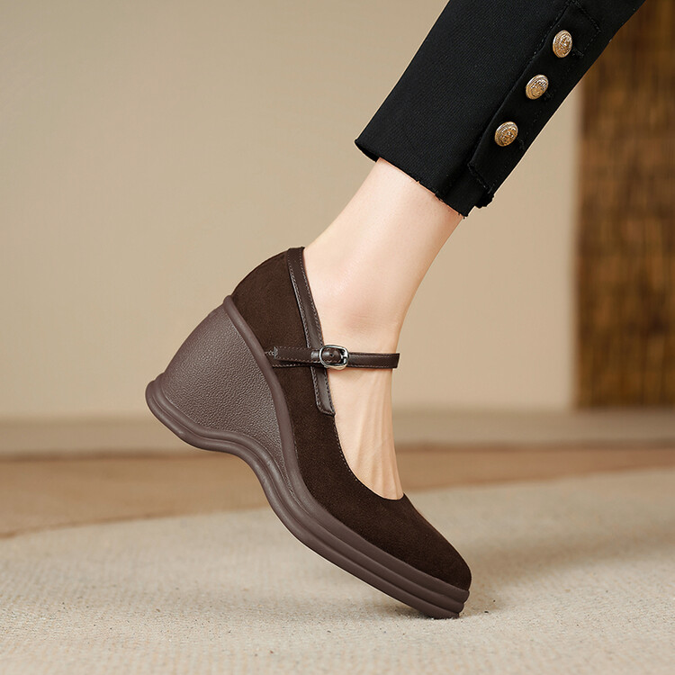 货号:N9467颜色:黑色 棕色跟高:9CM水台: 2.5CM鞋码:34-39鞋面材质:羊反皮+牛皮鞋 垫:牛皮内里材质:头层猪皮鞋底材质:牛筋底