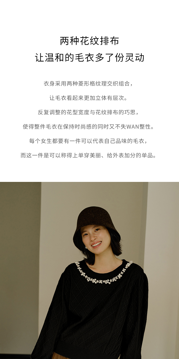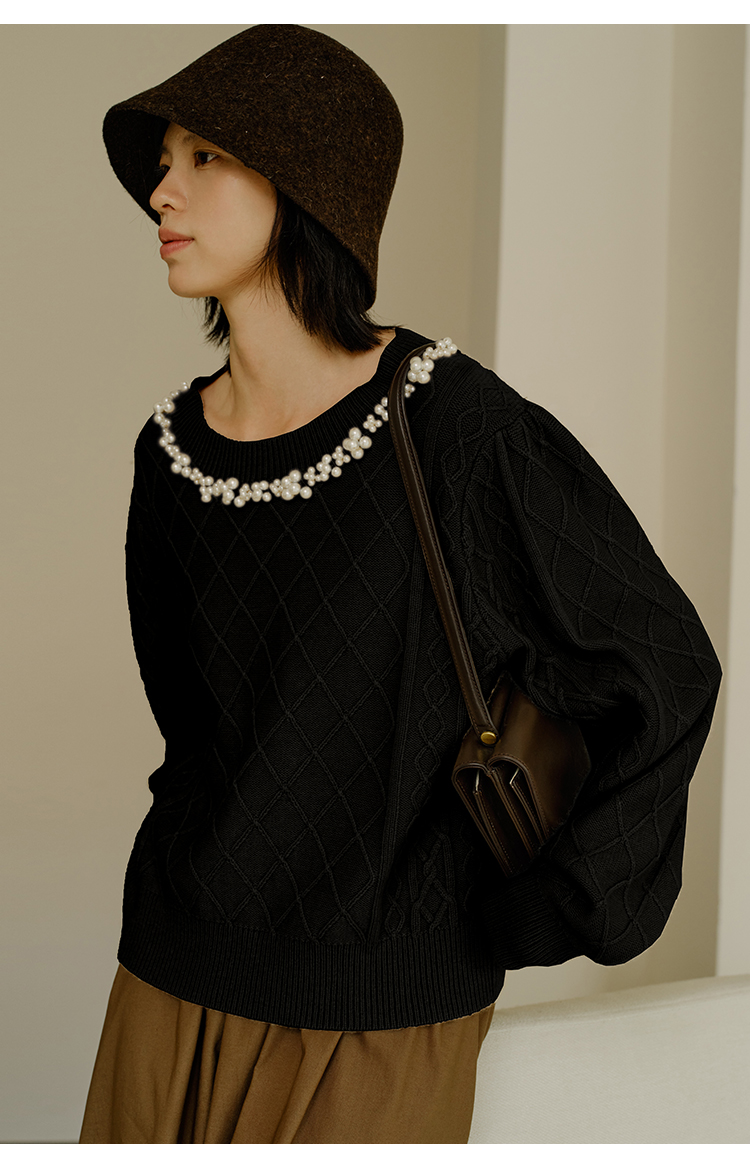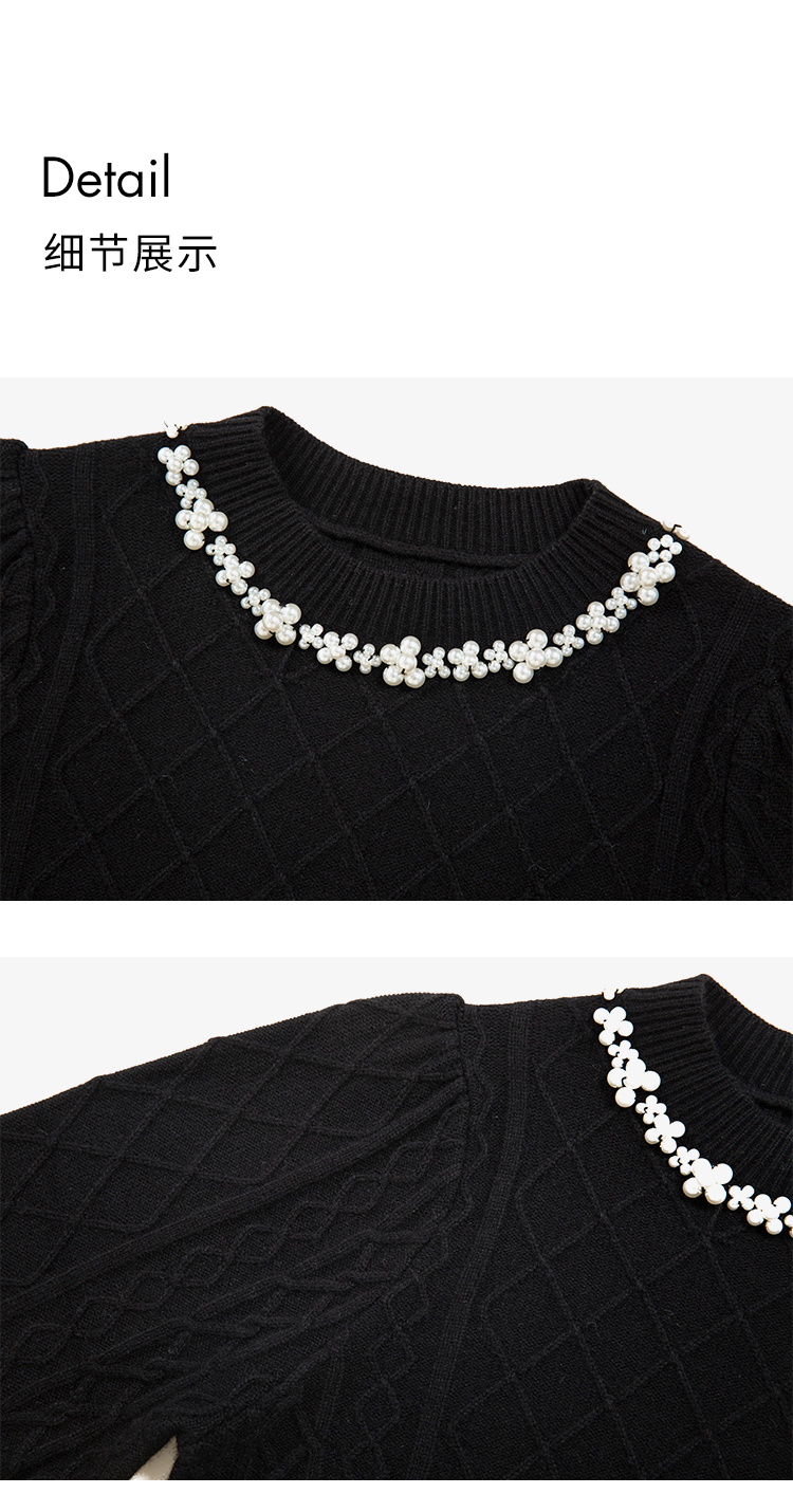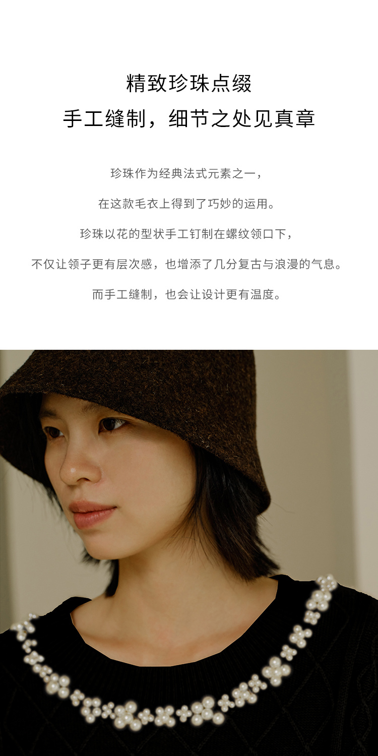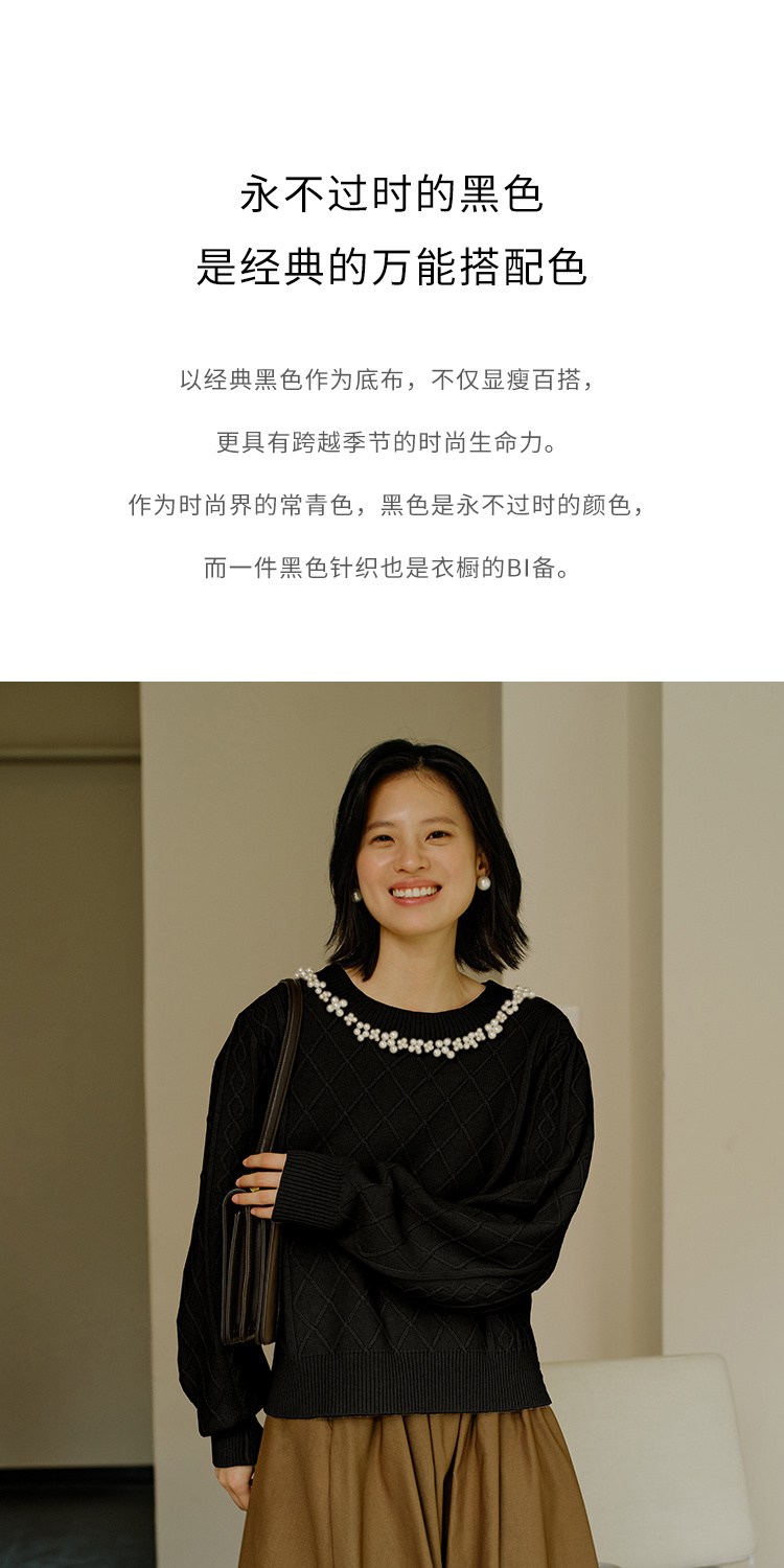 HeyDress珍珠花边领毛衣女秋冬法式优雅设计感针织衫黑色羊毛上衣