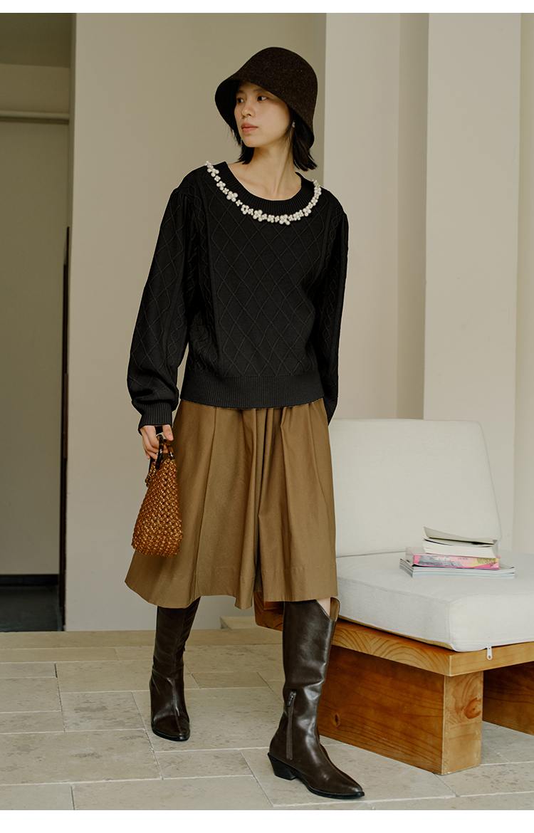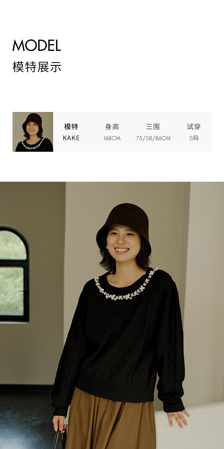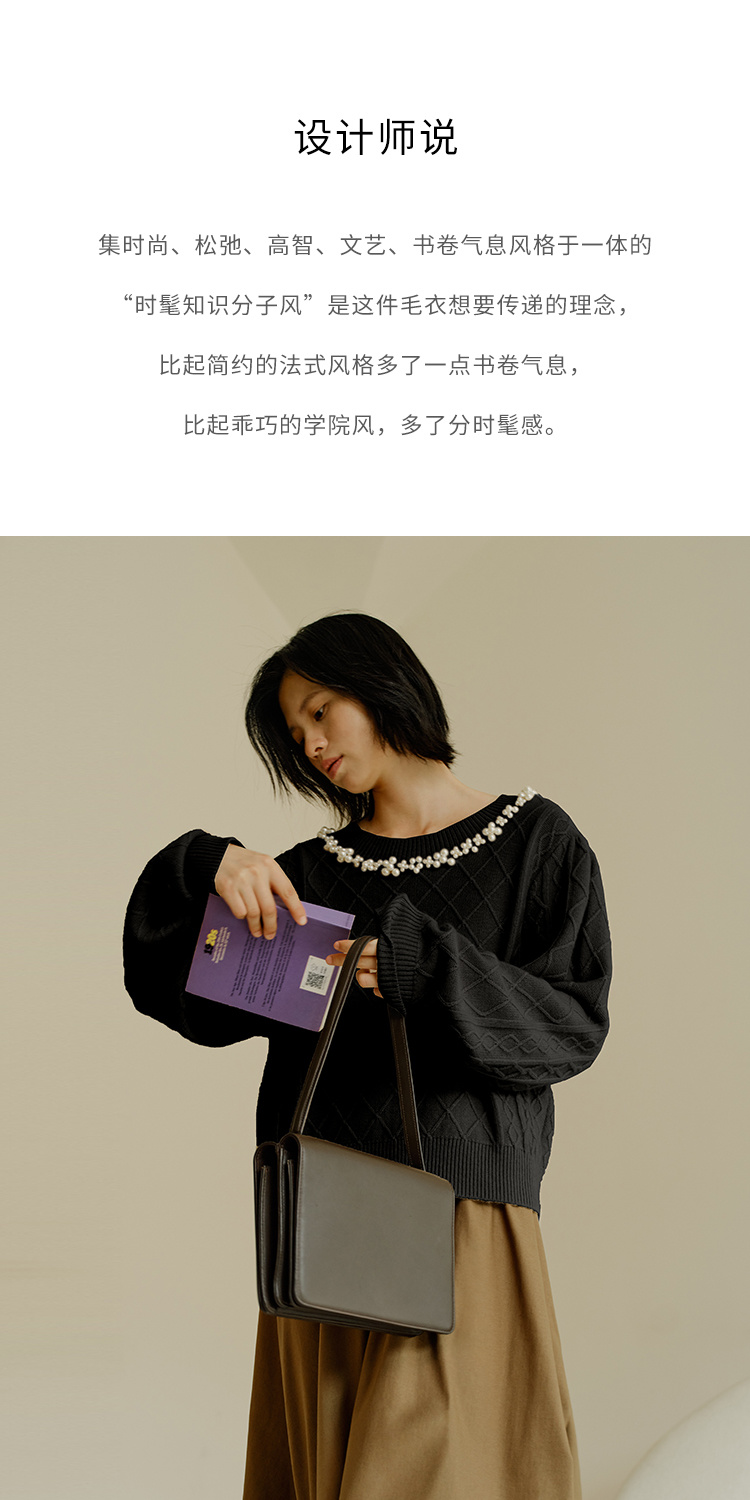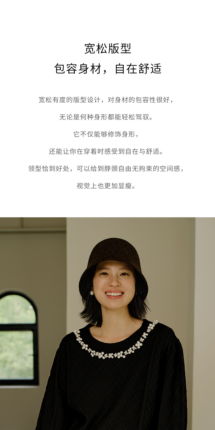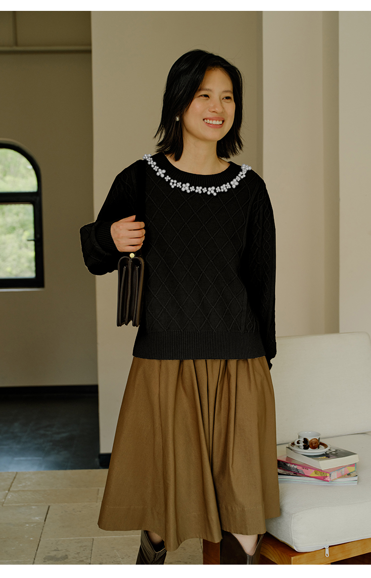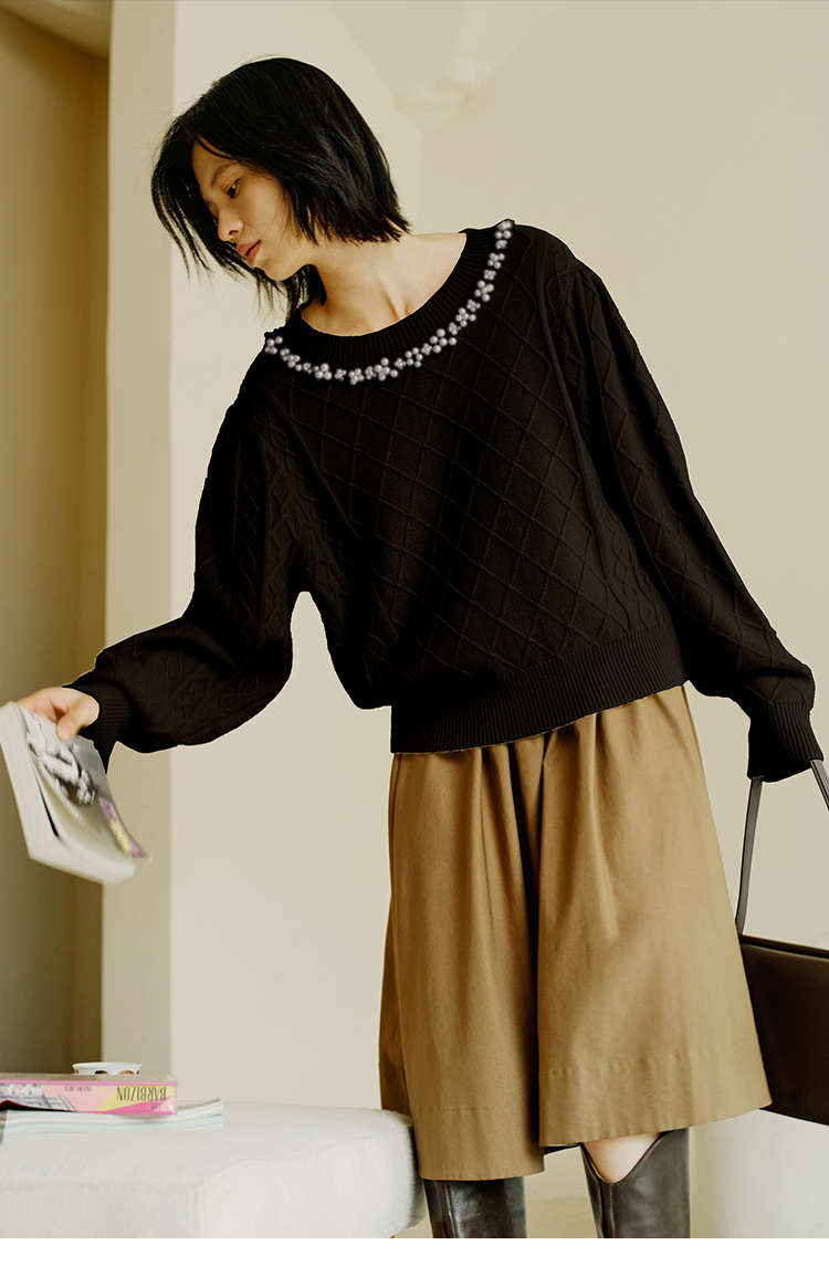 HeyDress珍珠花边领毛衣女秋冬法式优雅设计感针织衫黑色羊毛上衣
