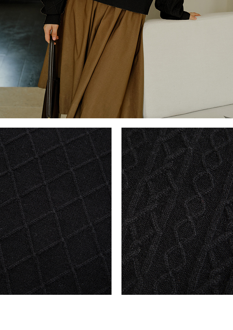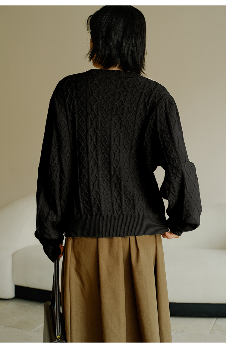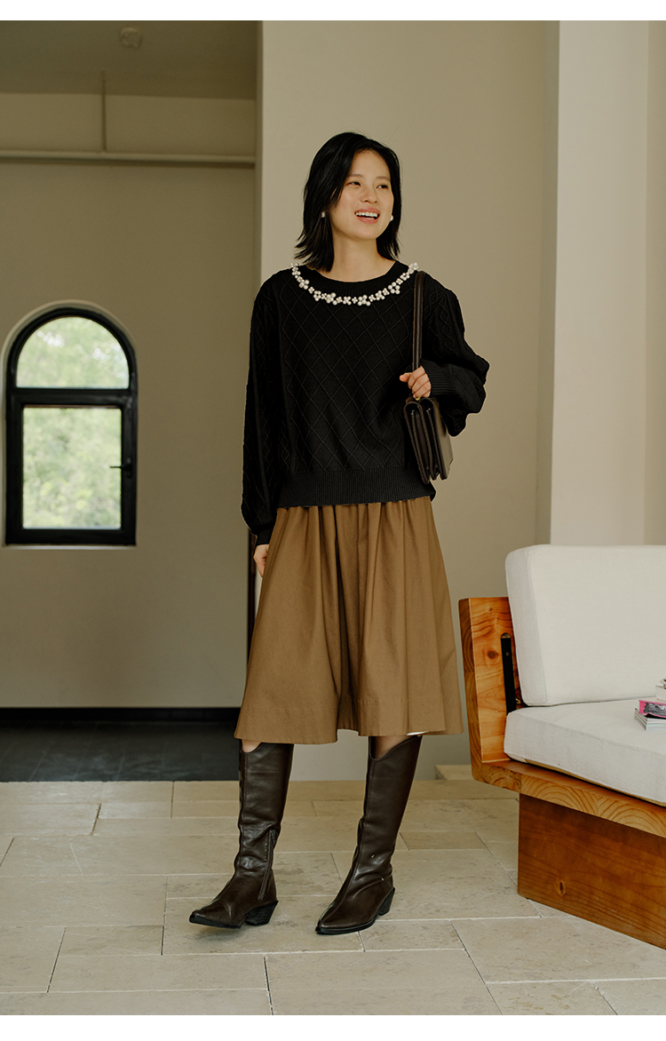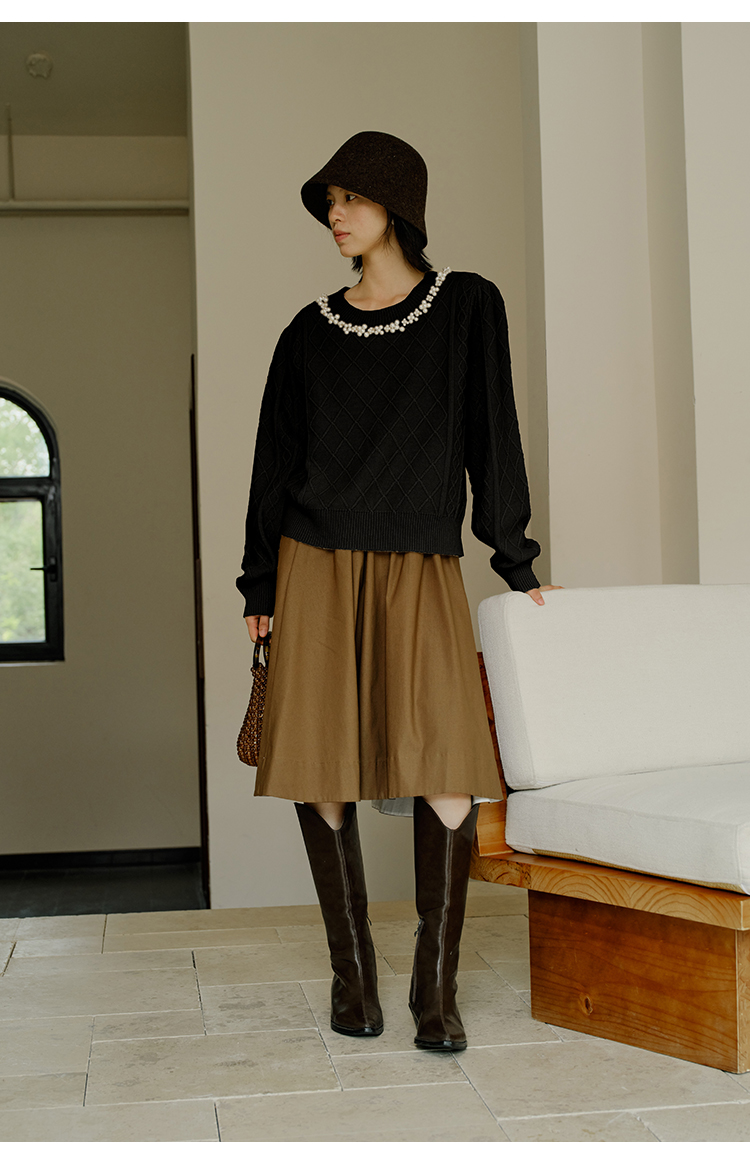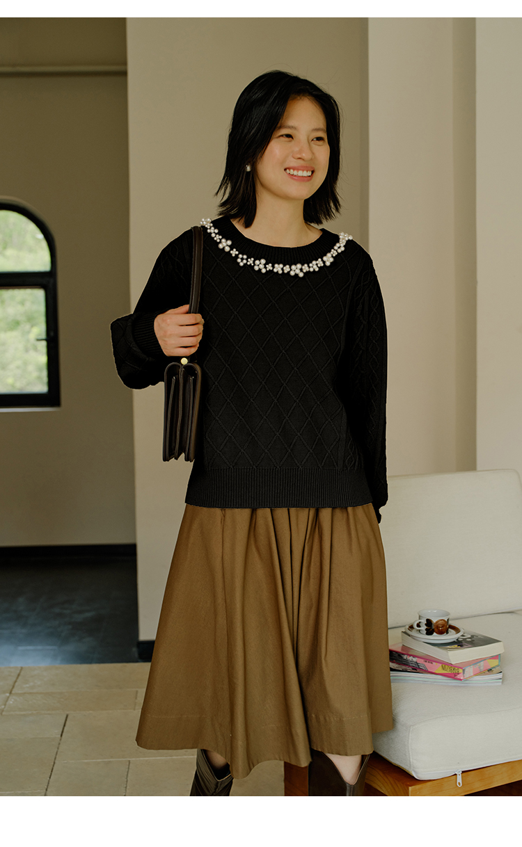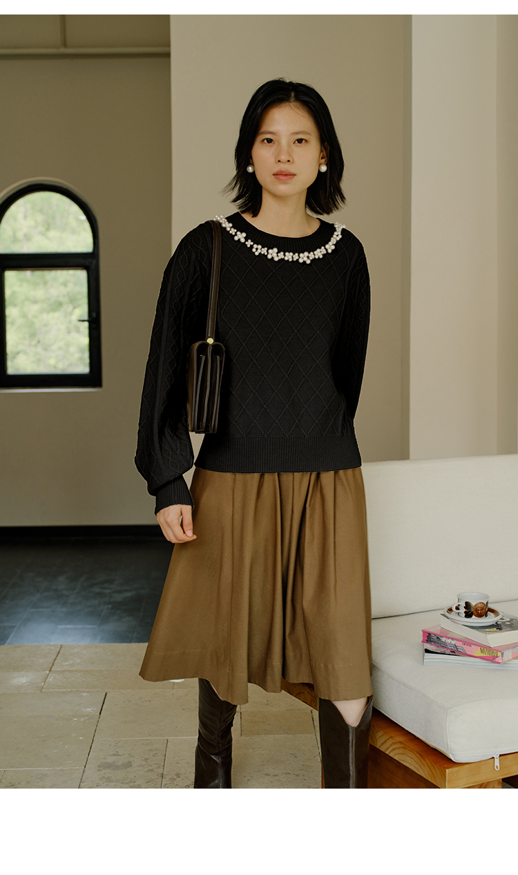 HeyDress珍珠花边领毛衣女秋冬法式优雅设计感针织衫黑色羊毛上衣