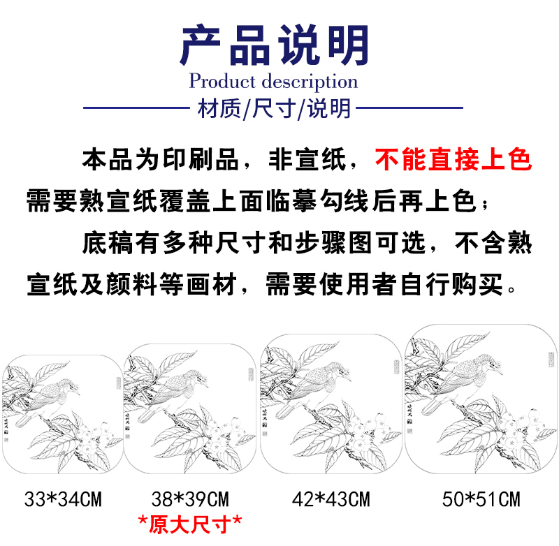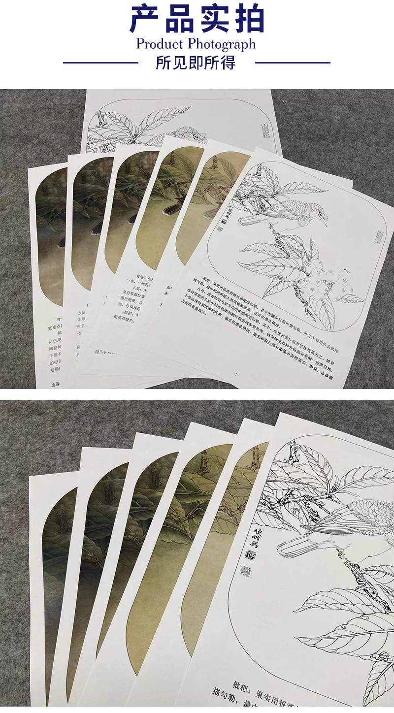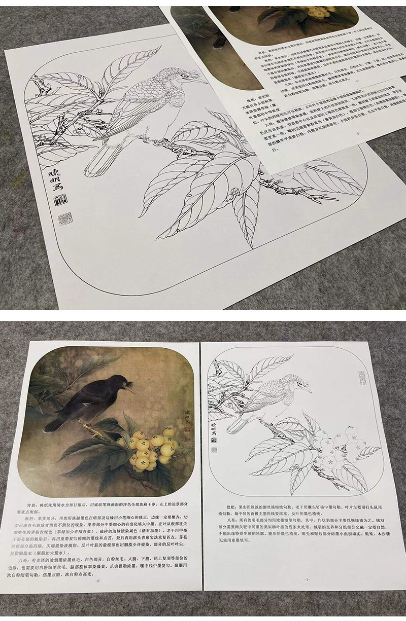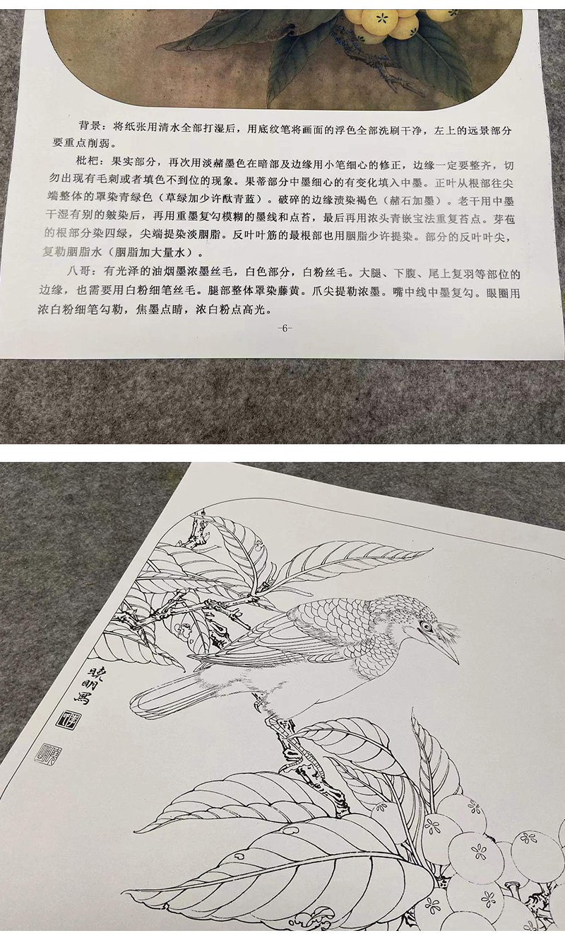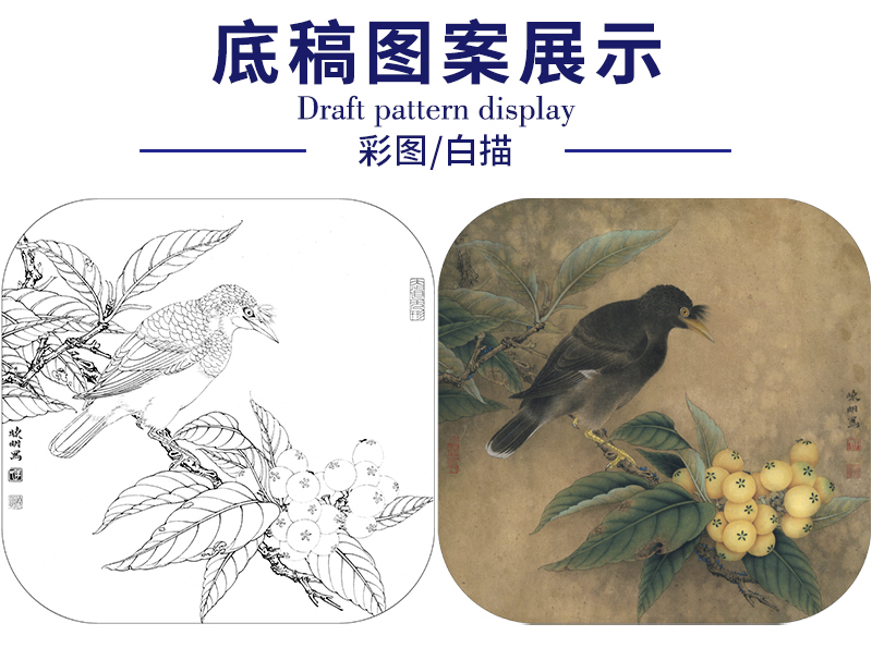 【有步骤、大彩图】李晓明工笔画白描底稿斗方小品《八哥枇杷图》乌鸦初学者临摹花鸟线稿KL01