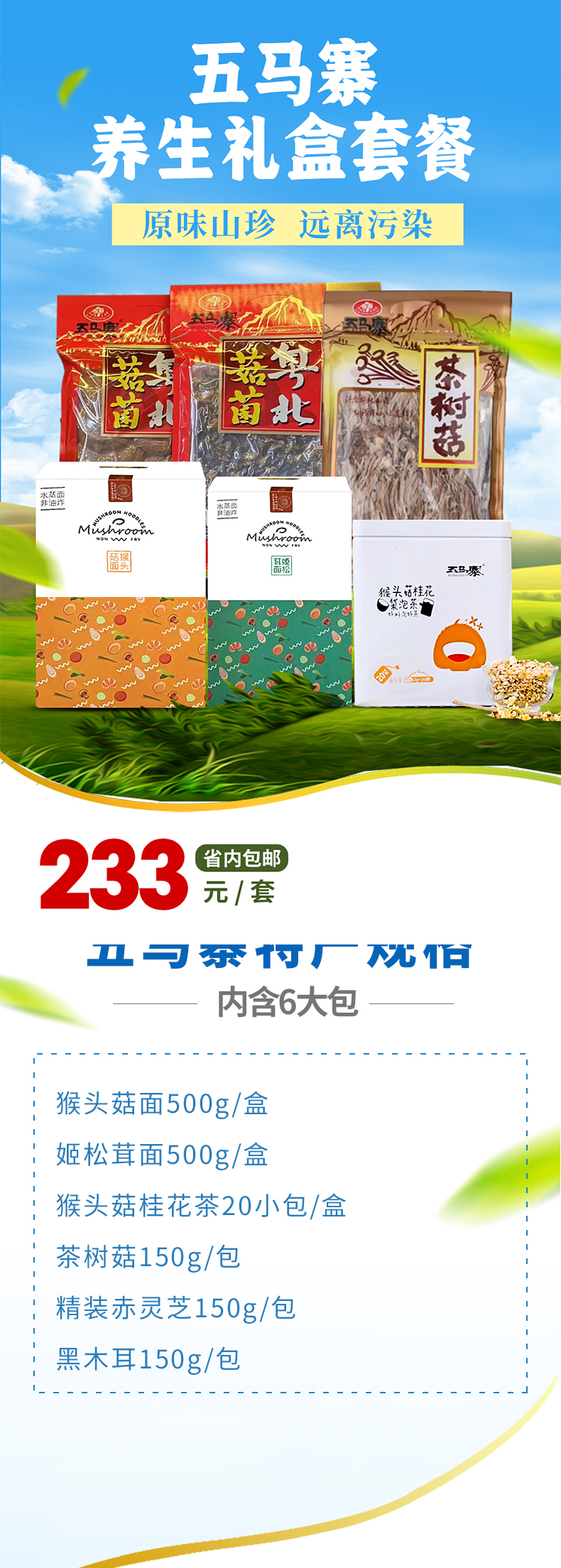 【省内包邮】五马寨养生礼盒套餐:猴头菇面500g/盒 、姬松茸面500g/盒 猴头菇桂花茶20小包/盒 、茶树菇150g/包 、精装赤灵芝150g/包、黑木耳150g/包