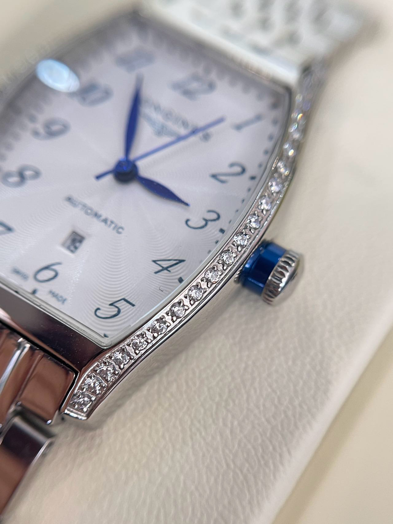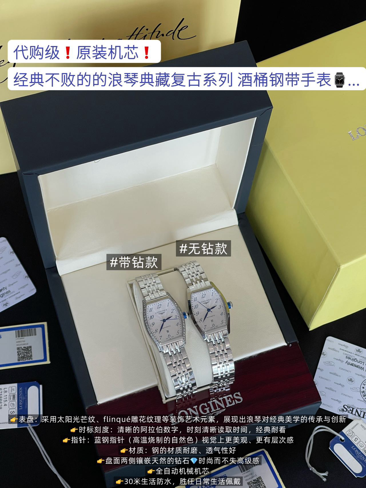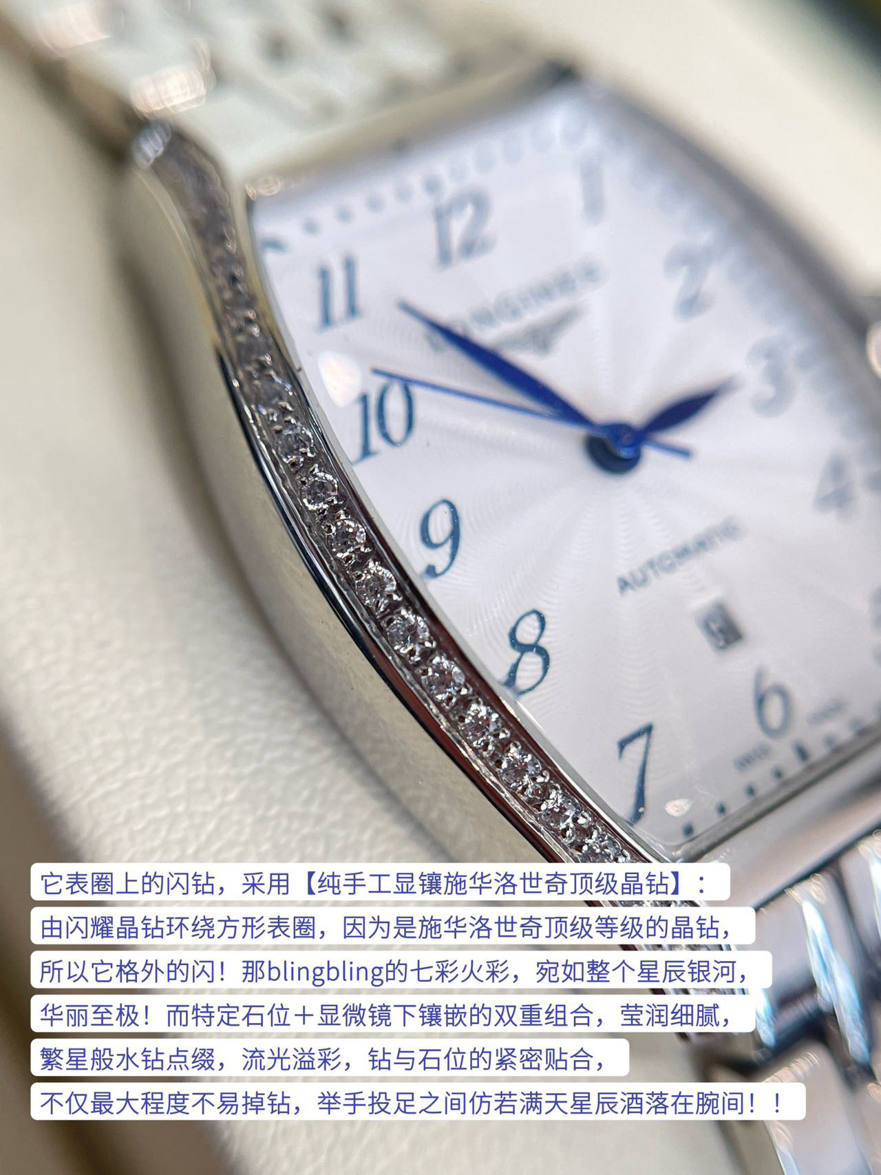 它表圈上的闪钻,采用【纯手工显镶施华洛世奇顶级晶钻】:由闪耀晶钻环绕方形表圈,因为是施华洛世奇顶级等级的晶钻,所以它格外的闪!那blingbling的七彩火彩,宛如整个星辰银河,华丽至极!而特定石位+显微镜下镶嵌的双重组合,莹润细腻,繁星般水钻点缀,流光溢彩,钻与石位的紧密贴合,不仅最大程度不易掉钻,举手投足之间仿若满天星辰酒落在腕间!!