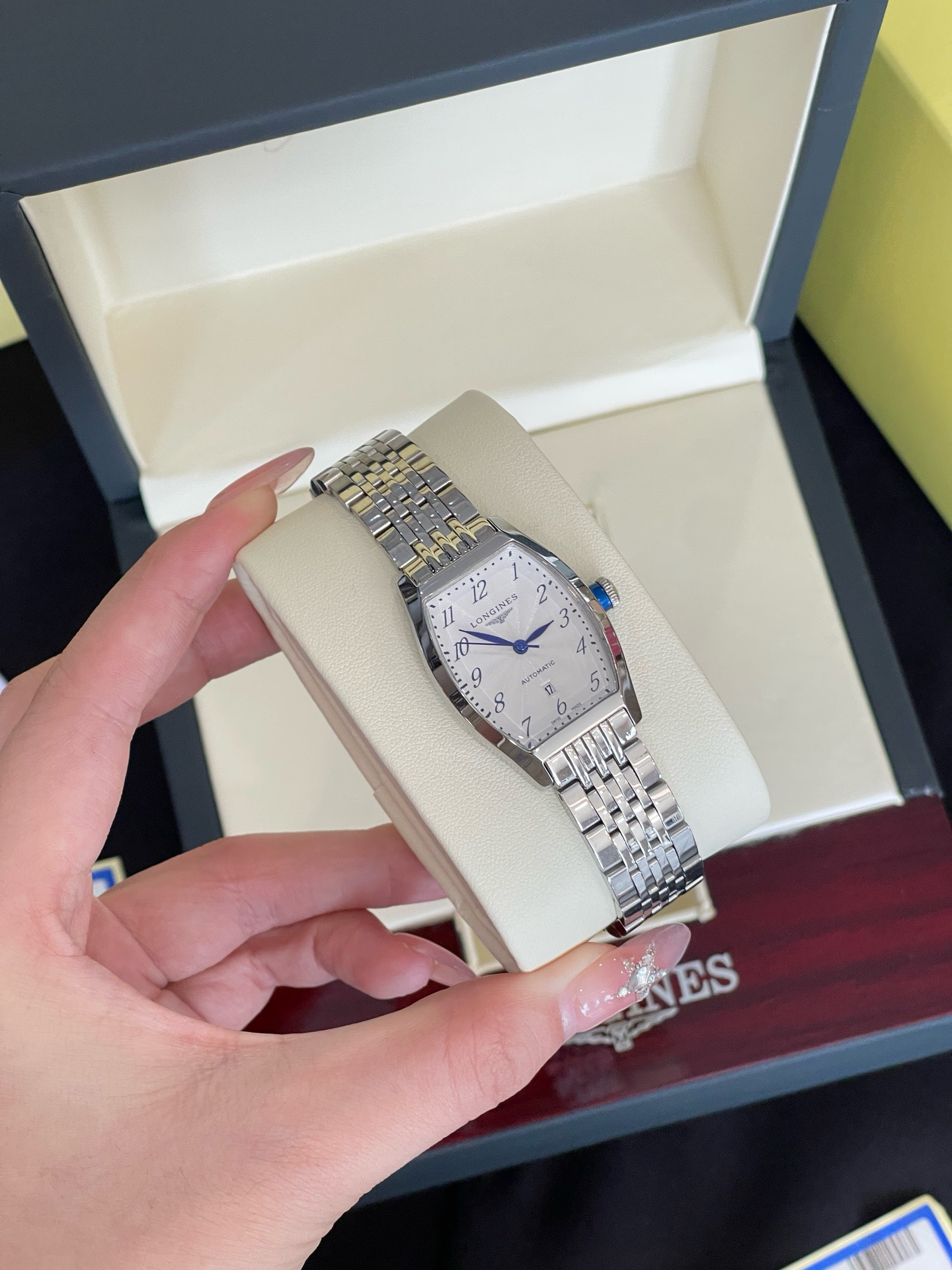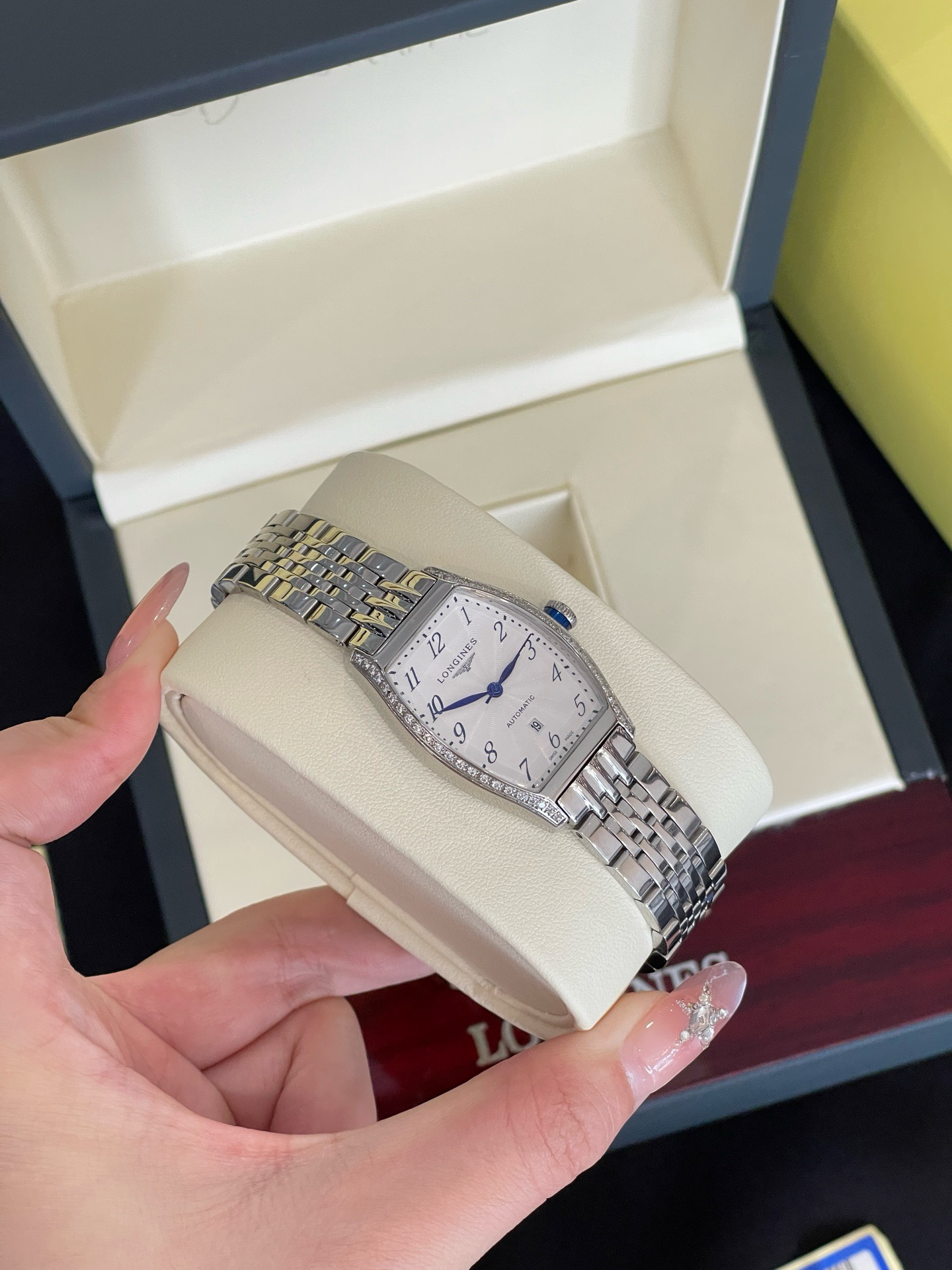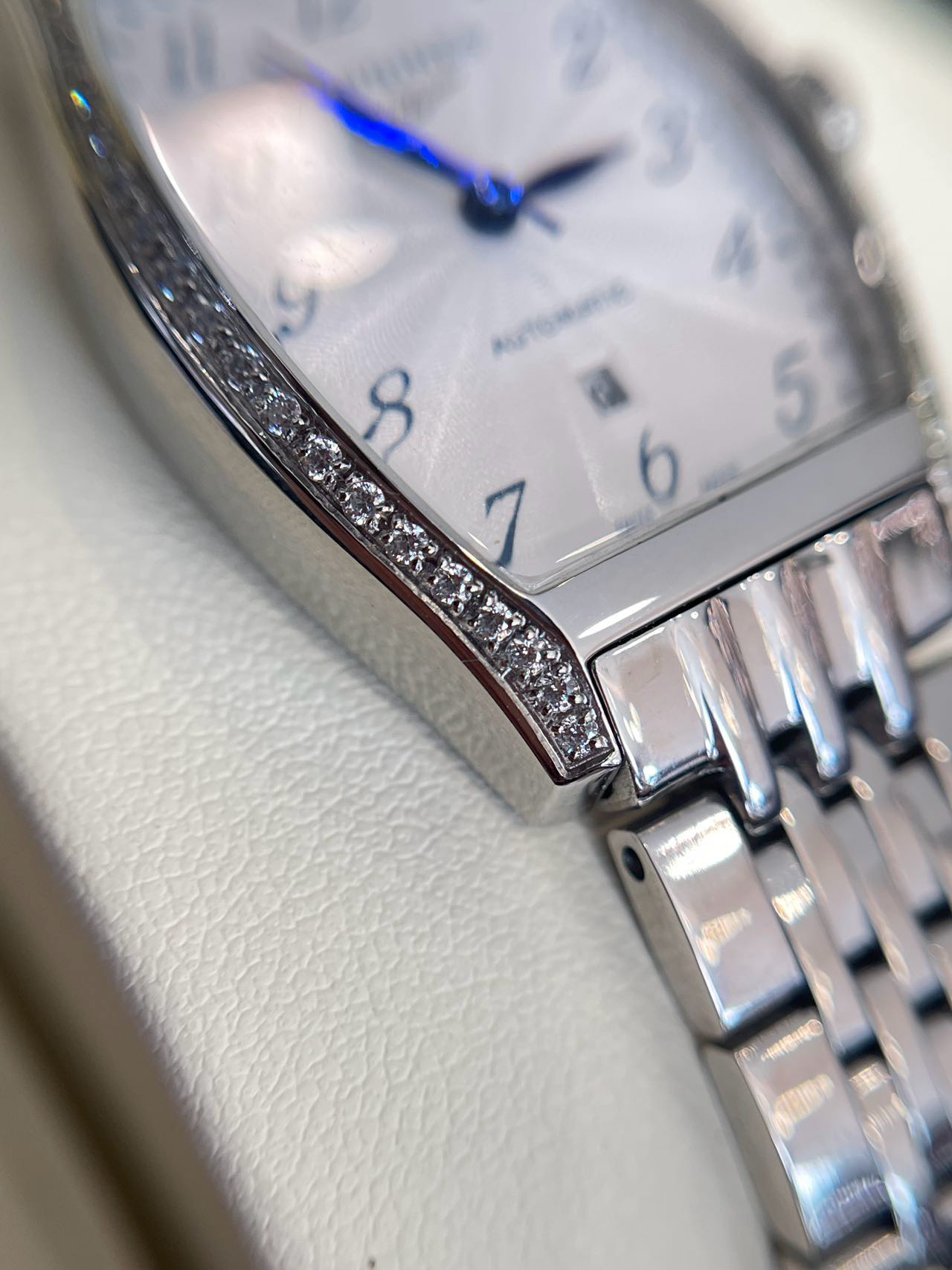 它表圈上的闪钻,采用【纯手工显镶施华洛世奇顶级晶钻】:由闪耀晶钻环绕方形表圈,因为是施华洛世奇顶级等级的晶钻,所以它格外的闪!那blingbling的七彩火彩,宛如整个星辰银河,华丽至极!而特定石位+显微镜下镶嵌的双重组合,莹润细腻,繁星般水钻点缀,流光溢彩,钻与石位的紧密贴合,不仅最大程度不易掉钻,举手投足之间仿若满天星辰酒落在腕间!!