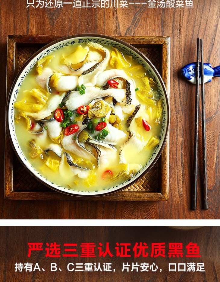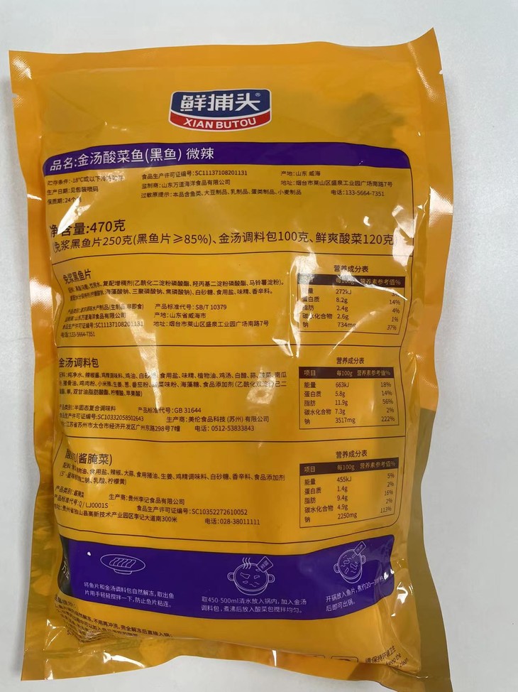 品名:金汤酸菜鱼 规格:470g/袋*3袋(注470g/袋包含免浆黑鱼片250g,金汤调料包100g,鲜爽酸菜120g);拍几份发几个包裹,不一定能同时到达,请耐心等待; 发货地/产地:山东 保质期:24个月 包装方式:袋装 物流信息:默认顺丰/京东发货,不支持指定快递 发货区域:新疆、西藏、海南不发; 物流详情:周六、周日及节假日除外,正常48小时内发货,到货时间约为2~5天,请耐心等待 售后说明:收到货后有质量问题,在24小时内都可以拍照(坏品+快递单面箱子一起拍)上传,申请按坏品比例理赔或联系客服;生鲜食品性质特殊,不支持7天无理由退换货;因地址错误,手机号联系不上,拒收等造成的损失无法售后,请理解; |