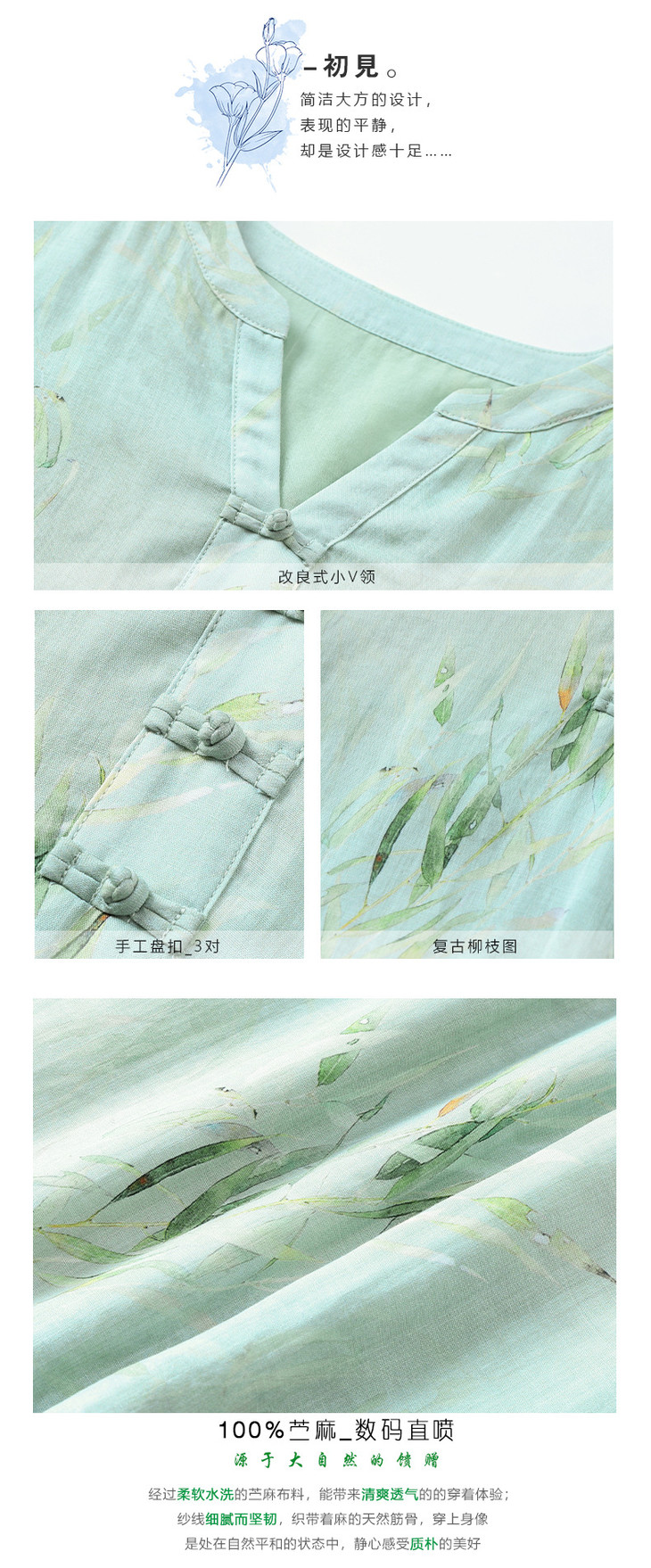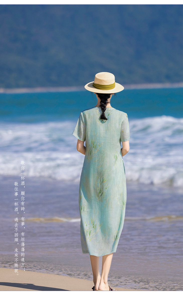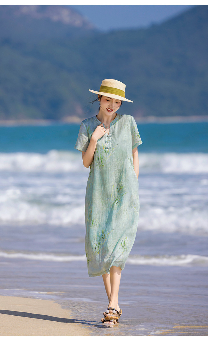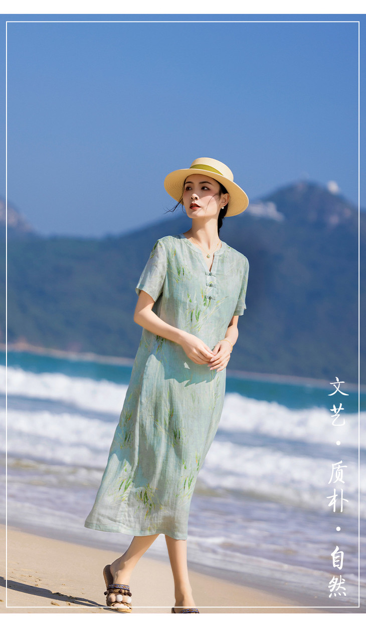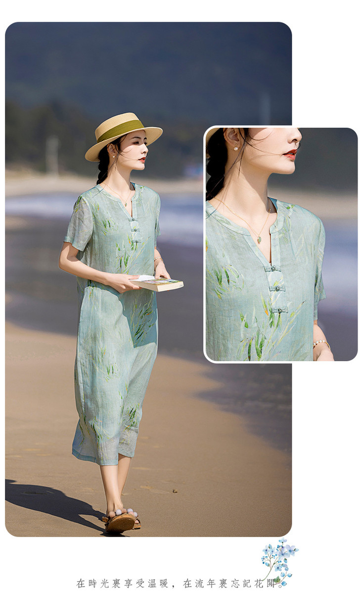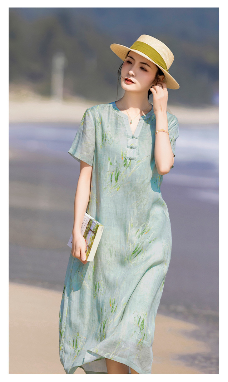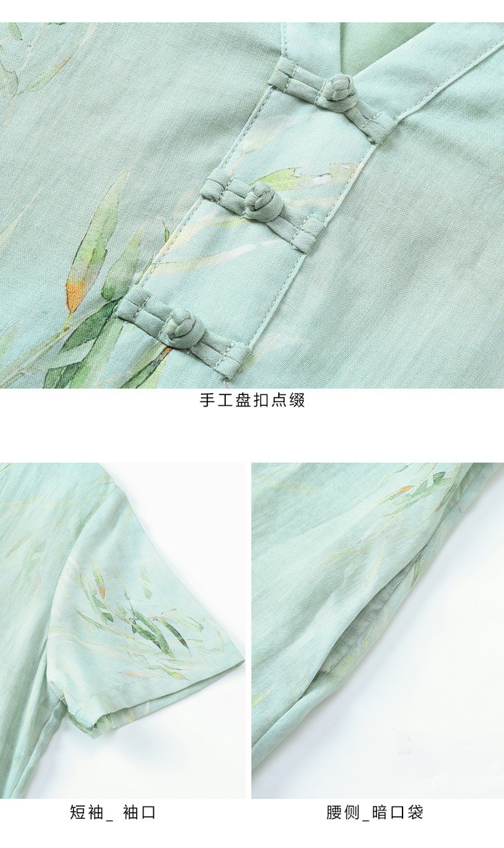 HM夏季新款文艺复古短袖柳枝印花苎麻改良旗袍裙V领大气盘扣连衣裙