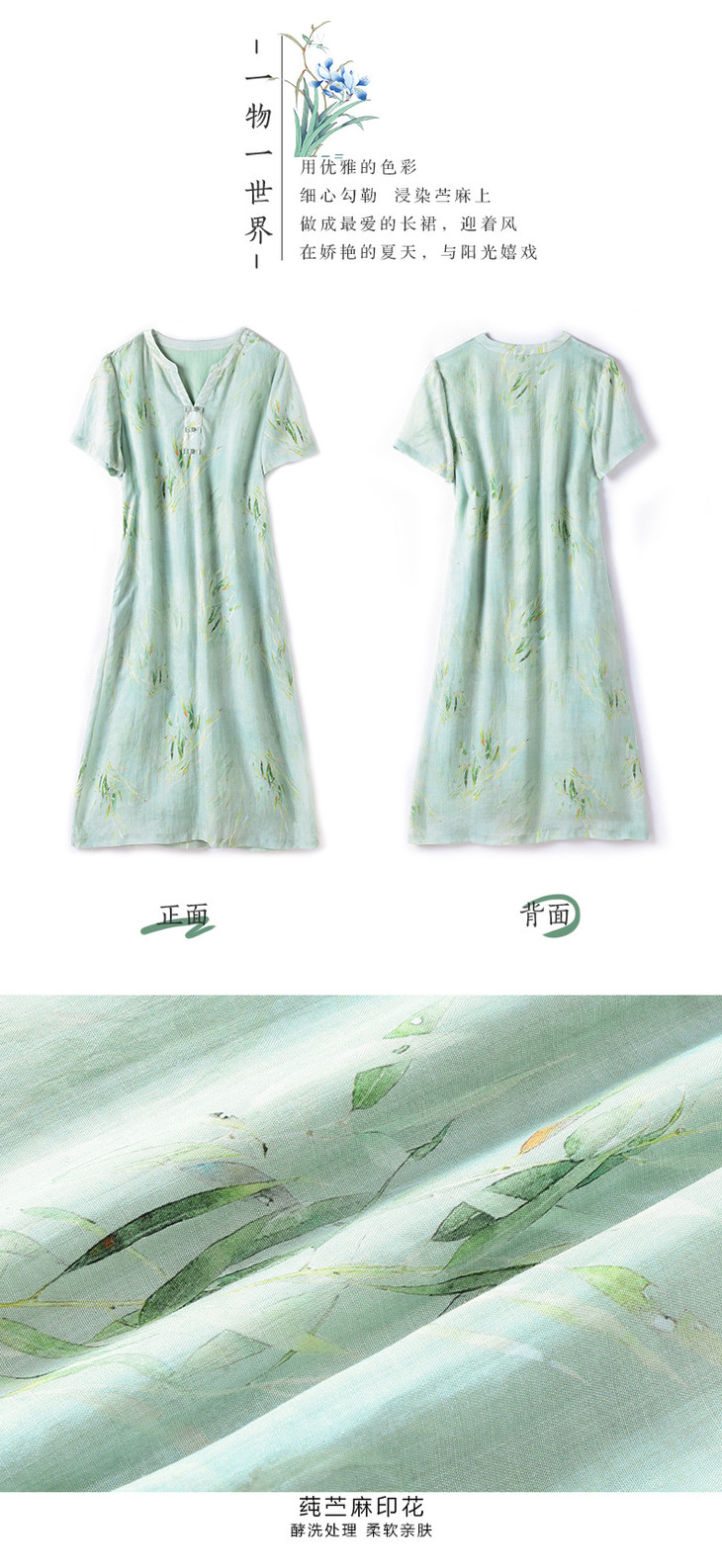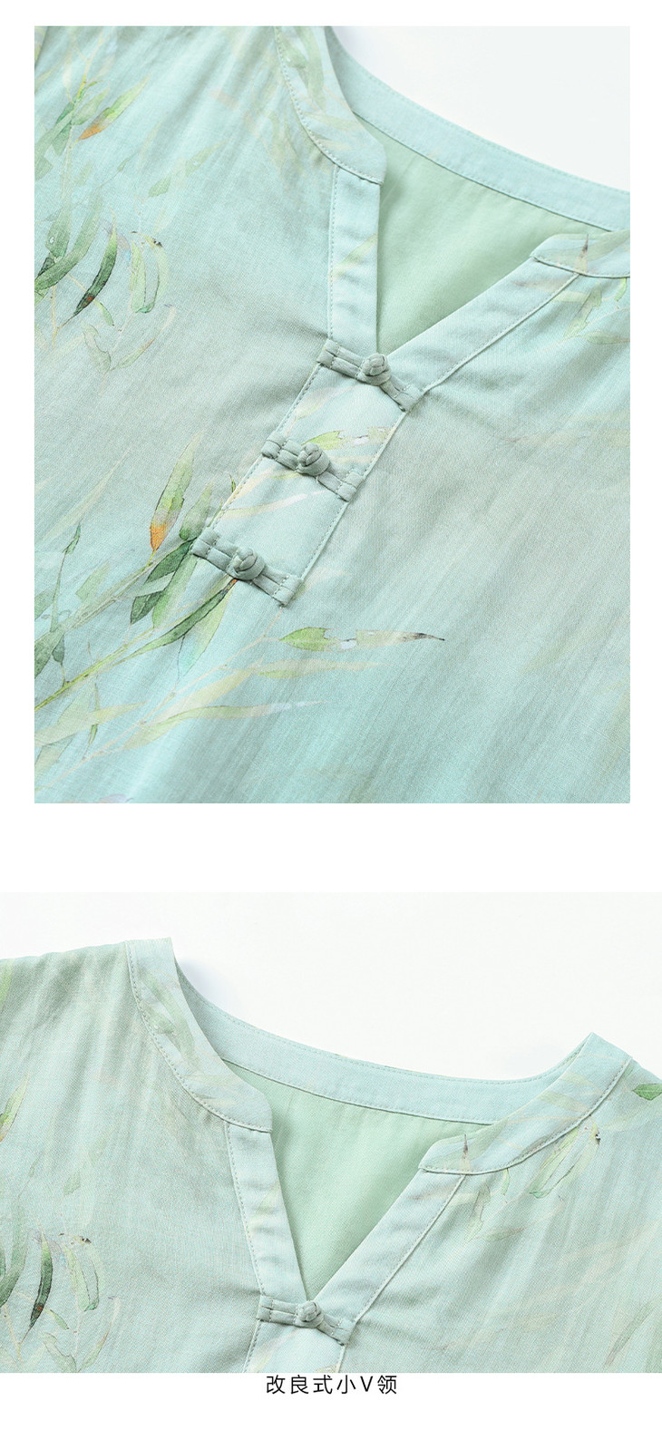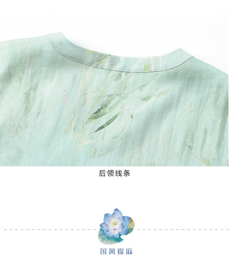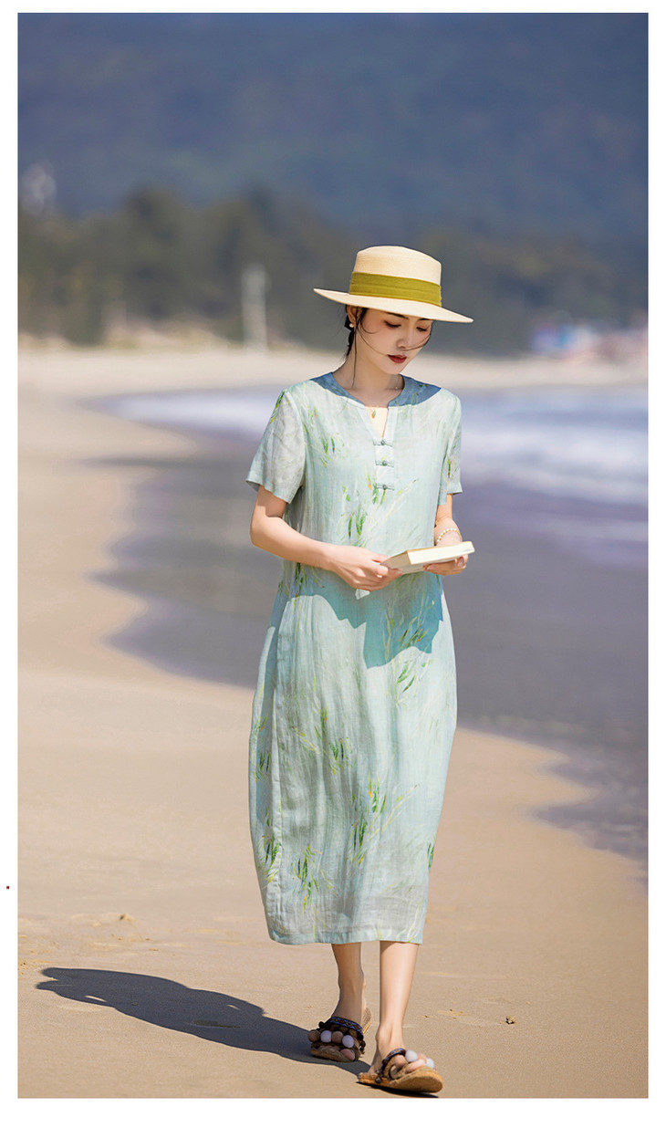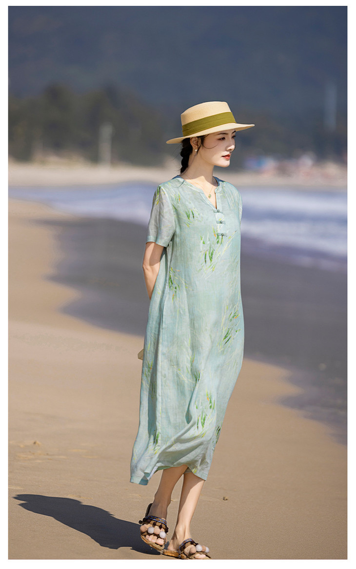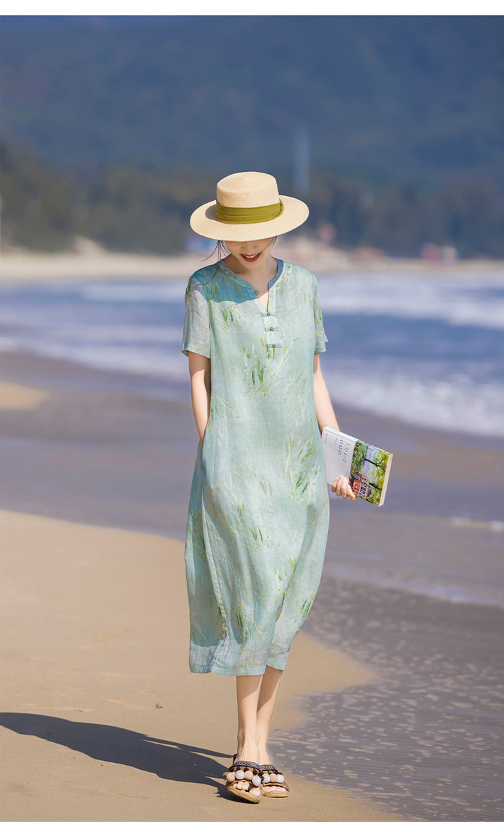HM夏季新款文艺复古短袖柳枝印花苎麻改良旗袍裙V领大气盘扣连衣裙