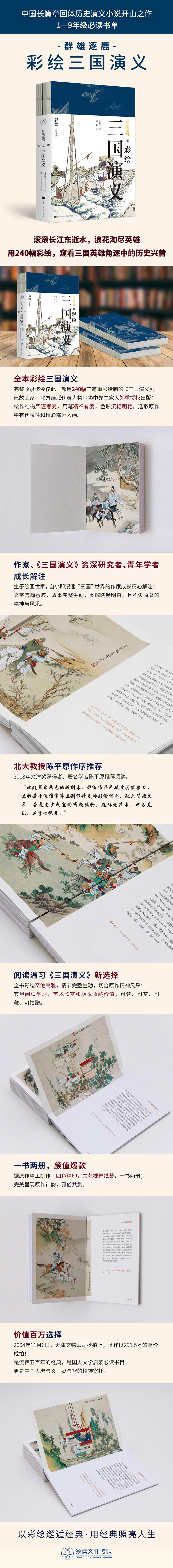 6. 特别邀请北京作家协会会员、《三国演义》资深研究者、青年学者成长为每幅图绘精心撰文,语言凝练、故事完整且不失原著风采。