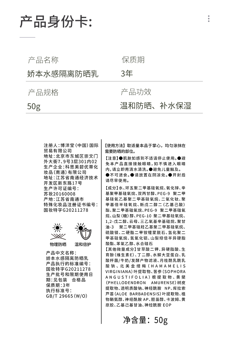 【电视台专享】娇本水感隔离防晒乳50g赠E乳30g*3