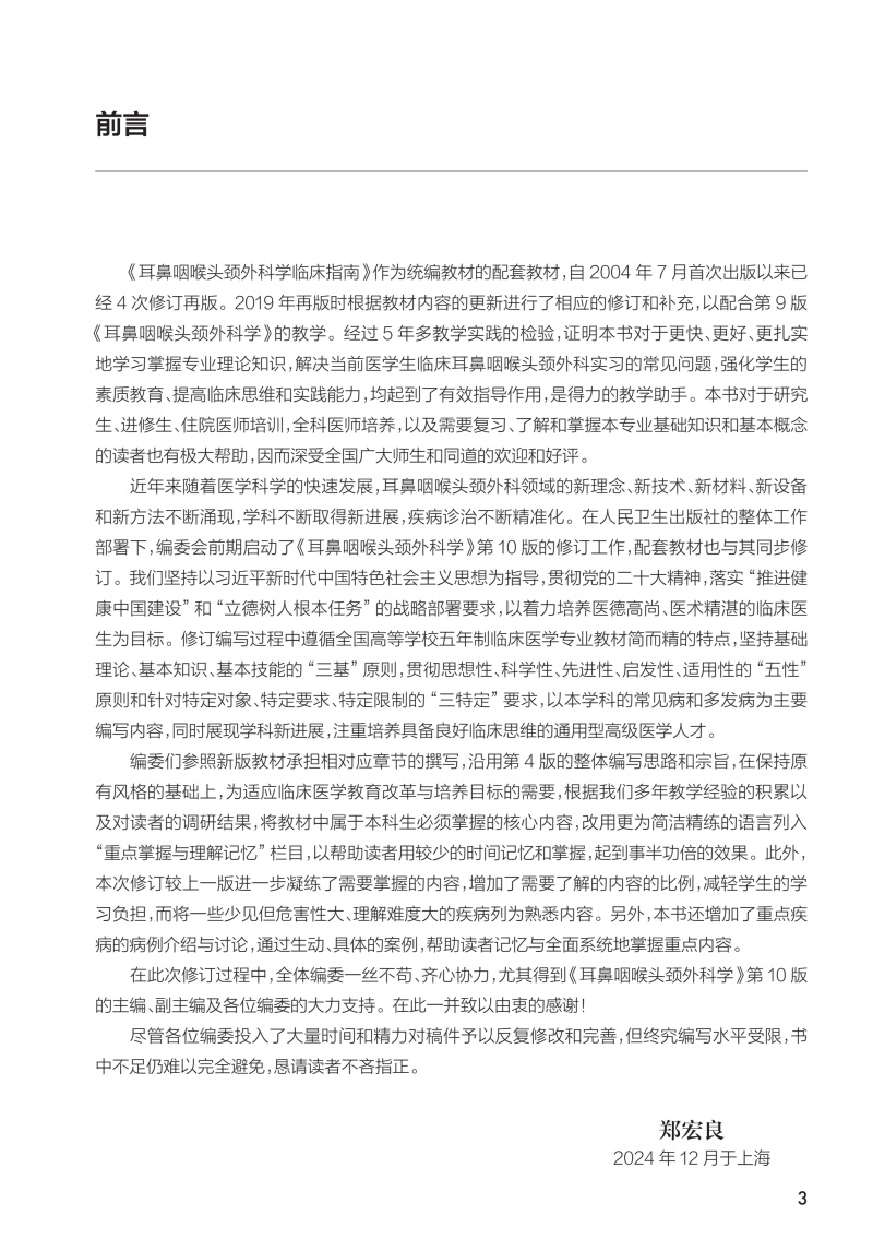 本书依据**理论教材《耳鼻咽喉头颈外科学》(第10版)相对应章节的内容,沿用第4版的整体编写思路和宗旨,在保持原有风格的基础上,适应临床医学教育改革与培养目标的需要,根据编委们多年的教学经验以及对读者的调研结果,将教材中属于本科生必须掌握的核心内容,改用更为简洁精练的语言列入“重点掌握与理解记忆”栏目,以帮助读者用较少的时间记忆和掌握,起到事半功倍的效果。此外,本次修订较上一版进一步凝练了需要掌握的内容,增加了需要了解的内容的比例,减轻了学生的学习负担,而将一些少见但危害性大、理解难度大的疾病列为熟悉内容。另外,本书还增加了重点疾病的病例介绍与讨论,通过生动、具体的案例,帮助读者记忆与全面系统地掌握重点内容。