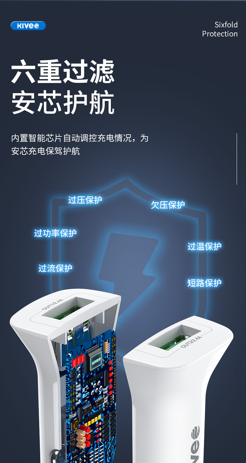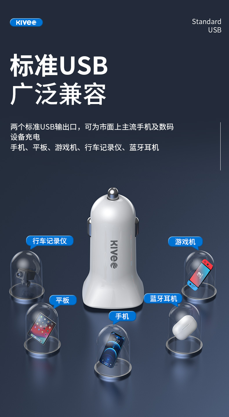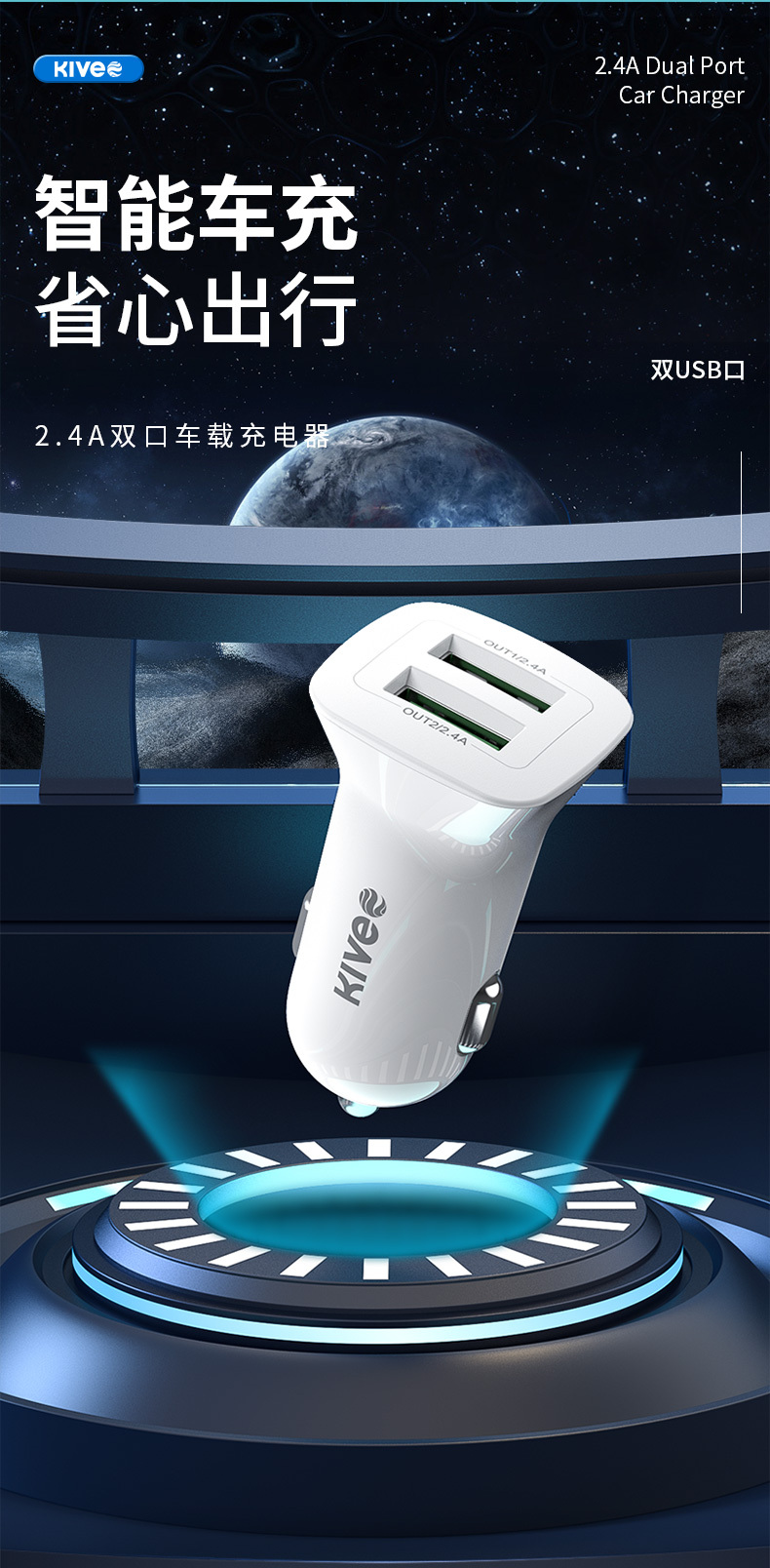 KIVEE车载充电器一拖二多功能通用USB车充汽车点烟器插头2.4A 双usb口 白色