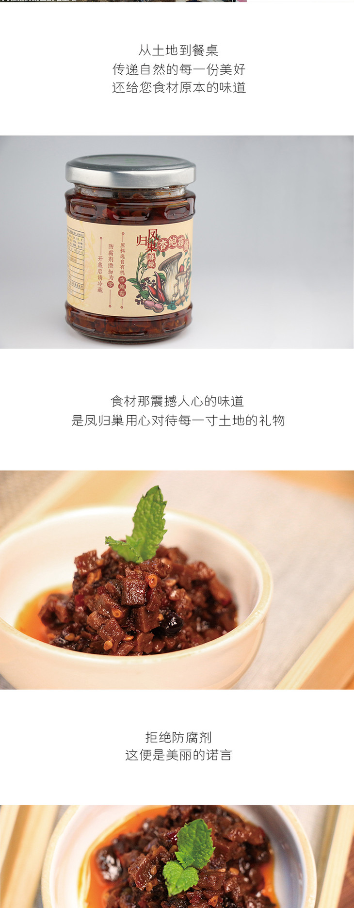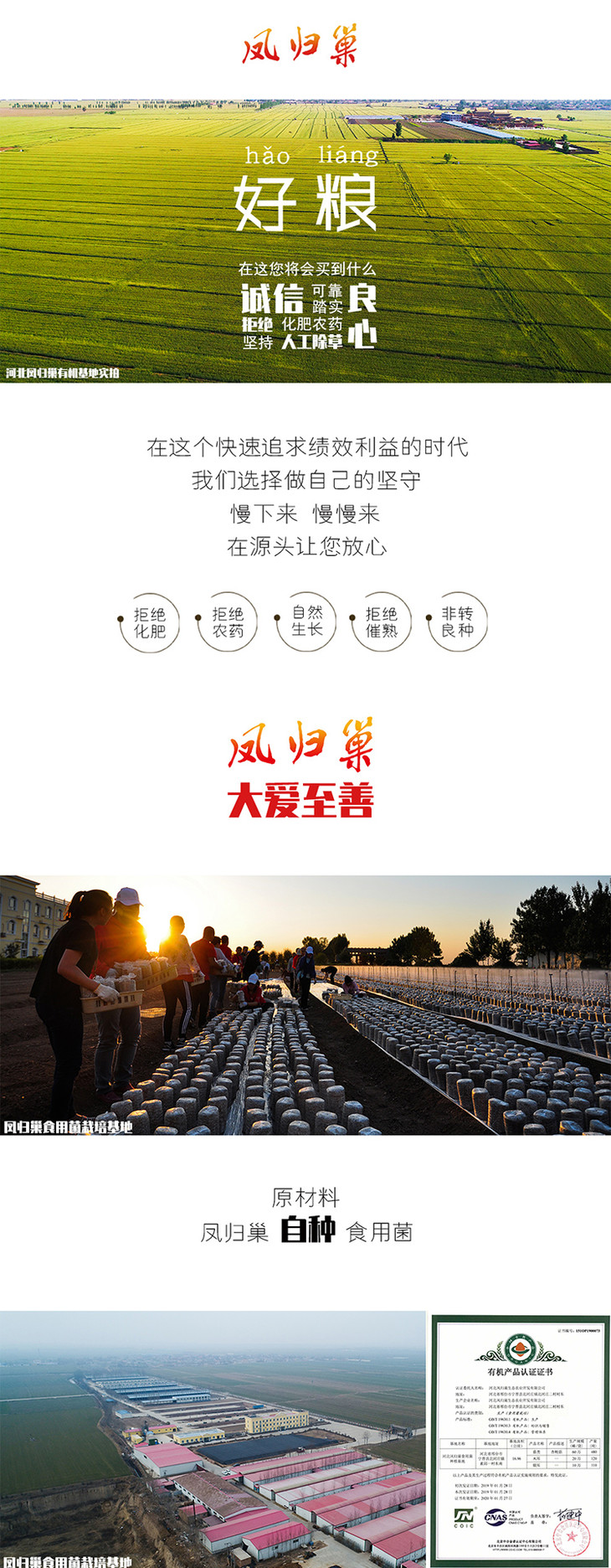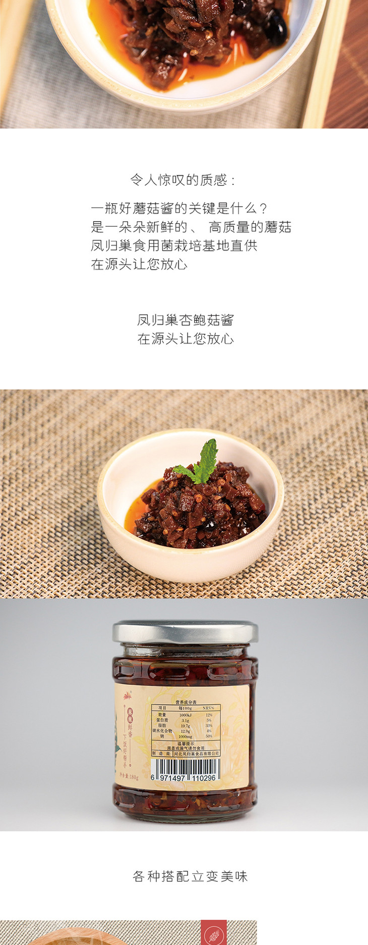 原料选自凤归巢有机食用菌栽培基地,使用生态种植的农作物残余如玉米芯、小麦等打碎做成菌包,安全且环保,使用后的菌包会堆肥还田,形成良性循环。经过专业厨师团队千百次研制调味,采用秘制配方精心制作而成。味道鲜美独特,最大限度保持蘑菇营养成分,凝固鲜香,锁住营养。