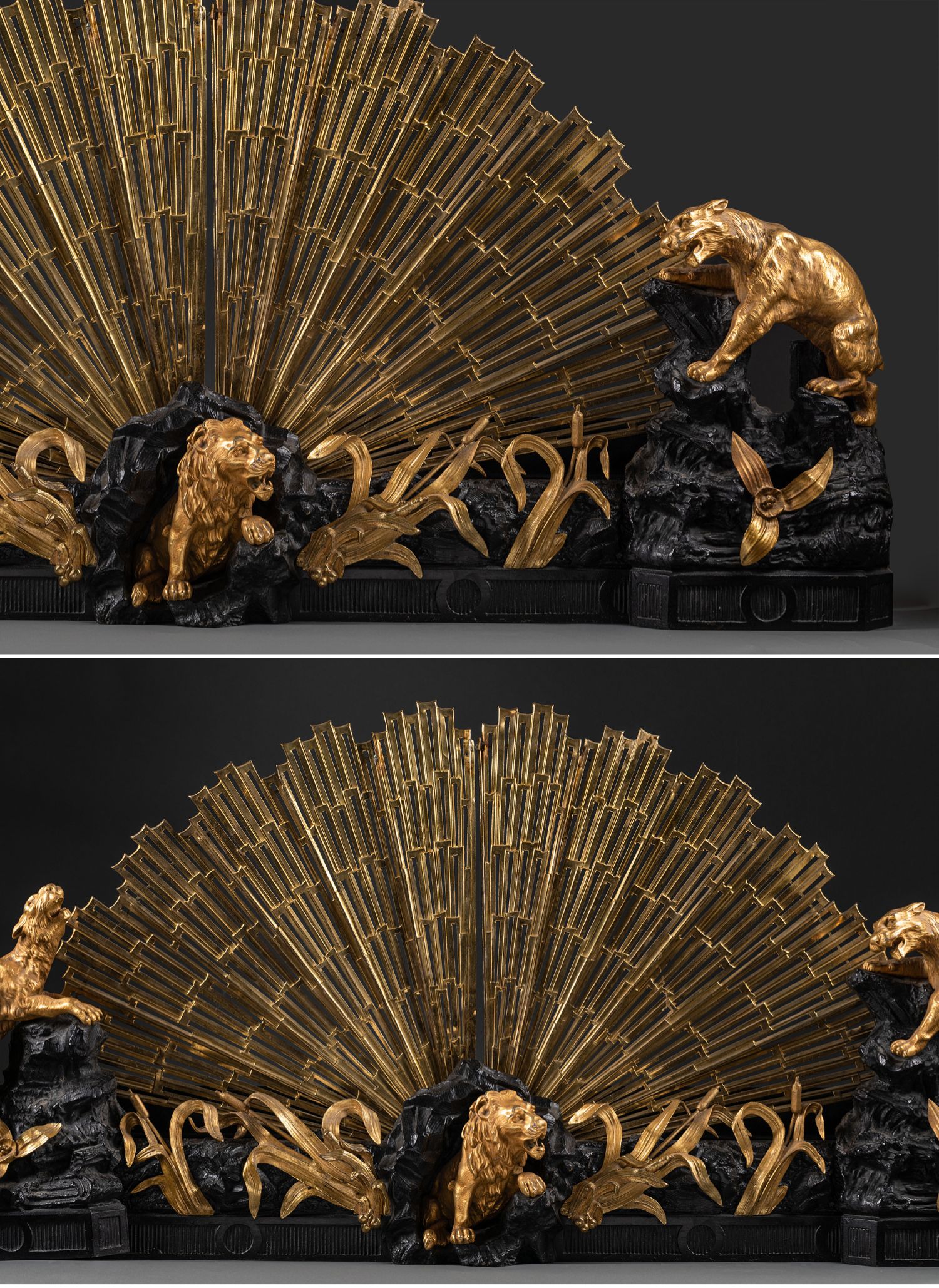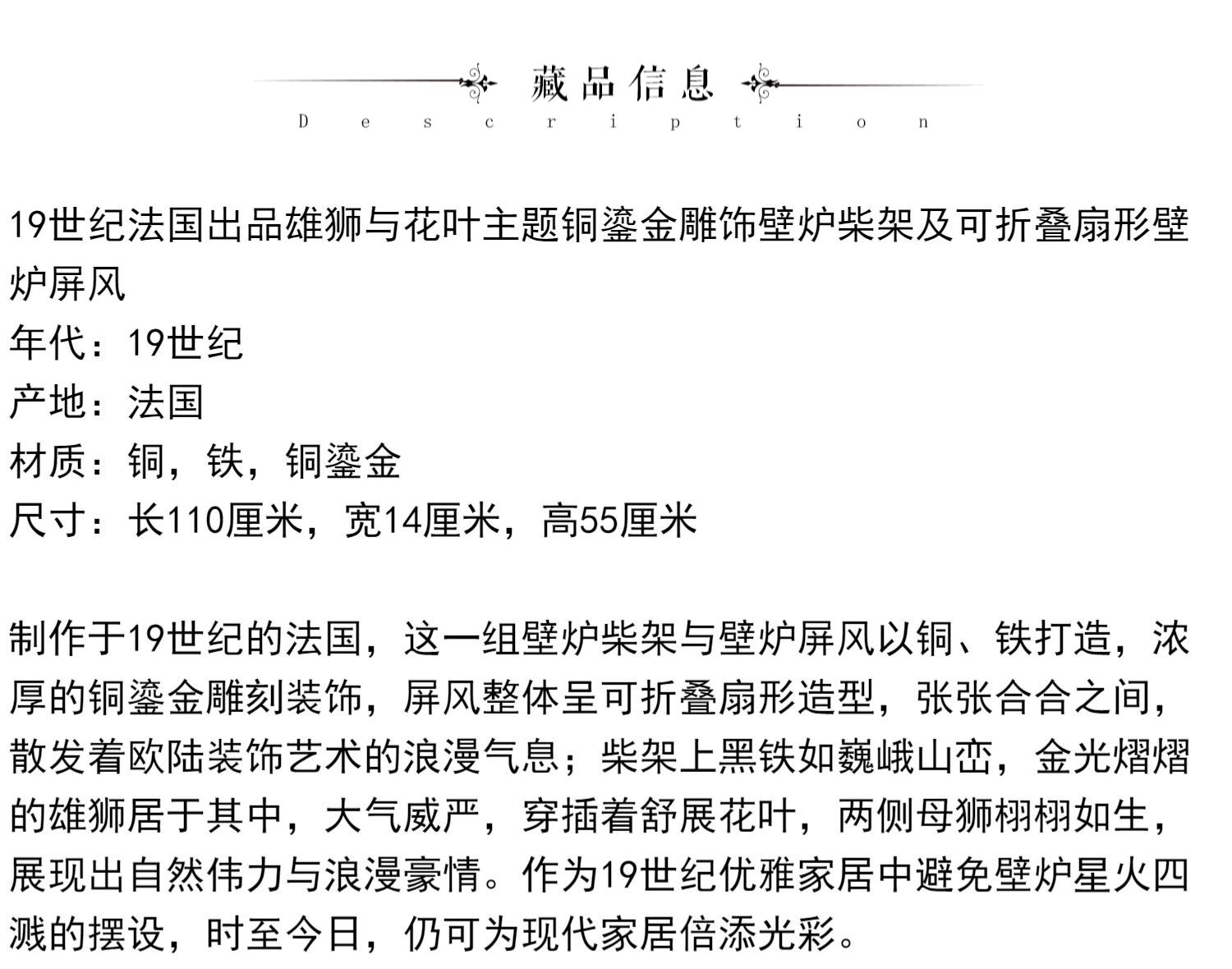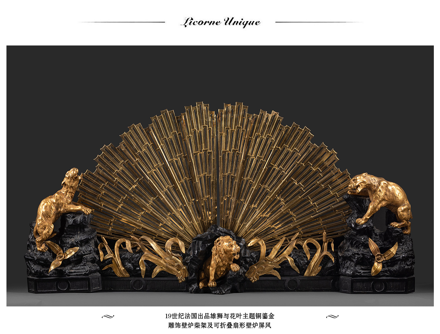 独角鹿西洋古董法国铜鎏金雕饰壁炉柴架及可折叠扇形壁炉屏风