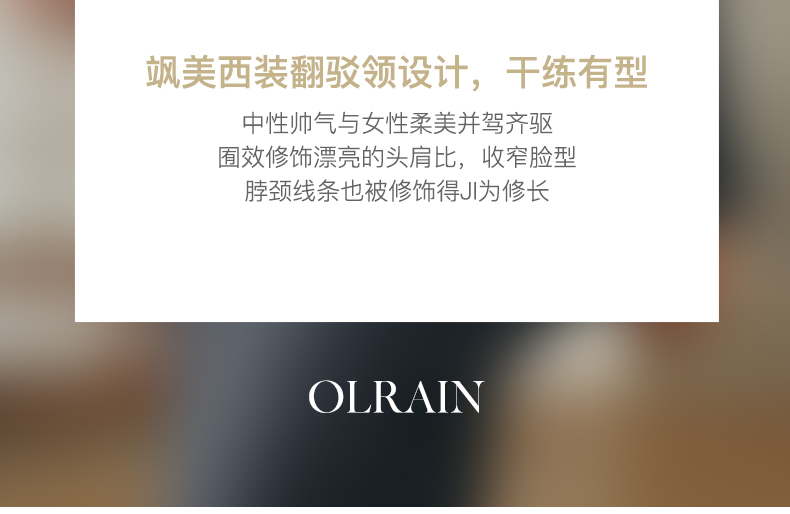 - “精致”是欧芮儿olrain品牌文化的核心,欧芮儿认为,精致的女人,不但要外在动人,更要内在迷人,内外兼修,有魅力、有气质、有内涵,自信而不自傲,优雅而不矫揉,自有万种风情而不轻浮,更不故作矜持。