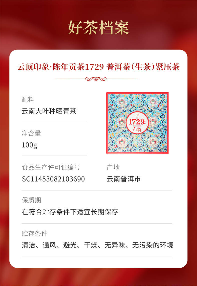 云顶印象陈年贡茶1729 普洱(生茶)100g