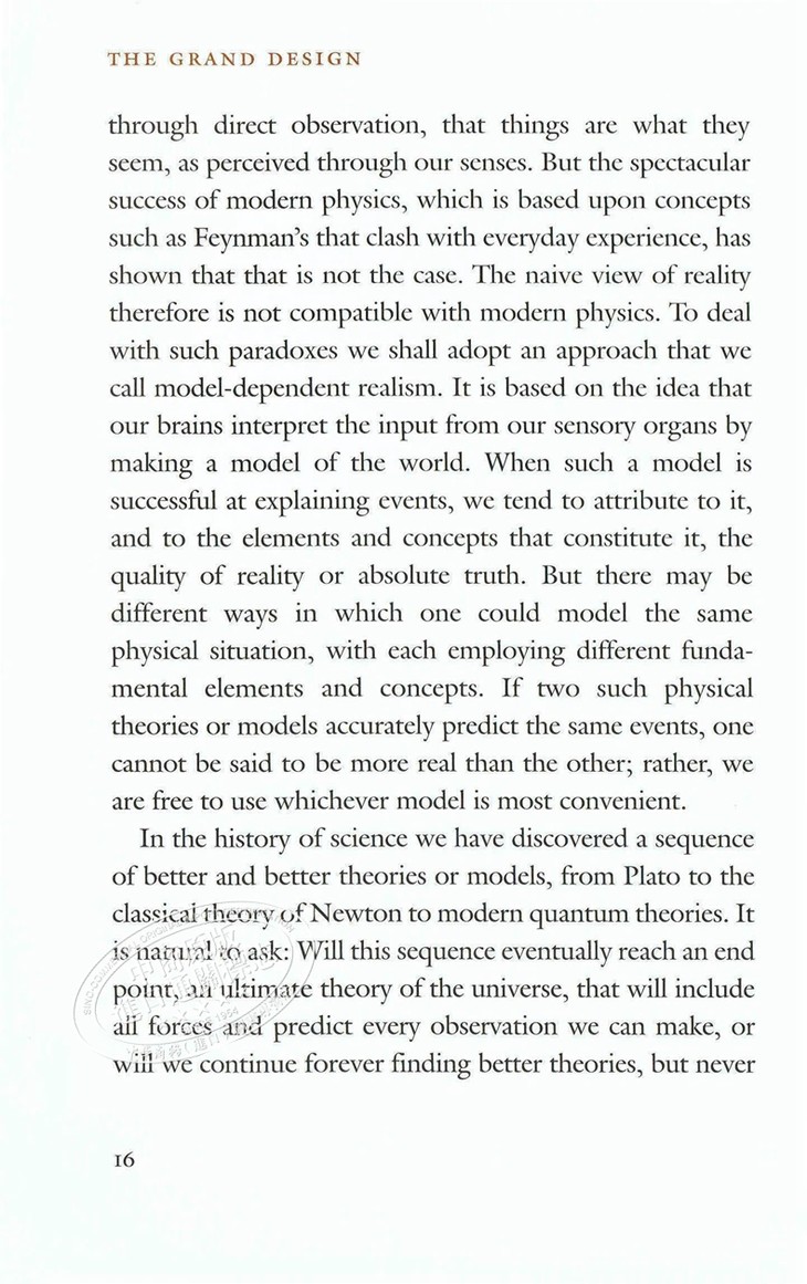霍金和蒙洛迪诺在这过程中诘问实在的传统概念,提出依赖模型的实在论,这是我们能够希望找到的答案。他们以对M理论的精彩评价来结束全书,M理论解释了制约我们和我们宇宙的定律,它还是完备的万物理论的目前可行的仅有候选者。他们写道,如果被证实的话,它将是爱因斯坦寻求的统一理论,也是人类理性的胜利。