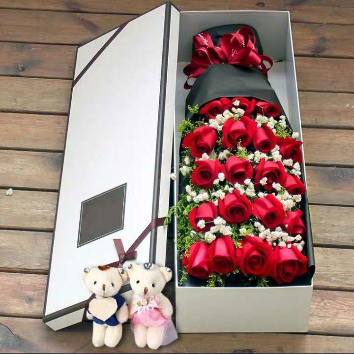 花材: 19支红玫瑰,满天星,黄莺搭配,50cm礼盒