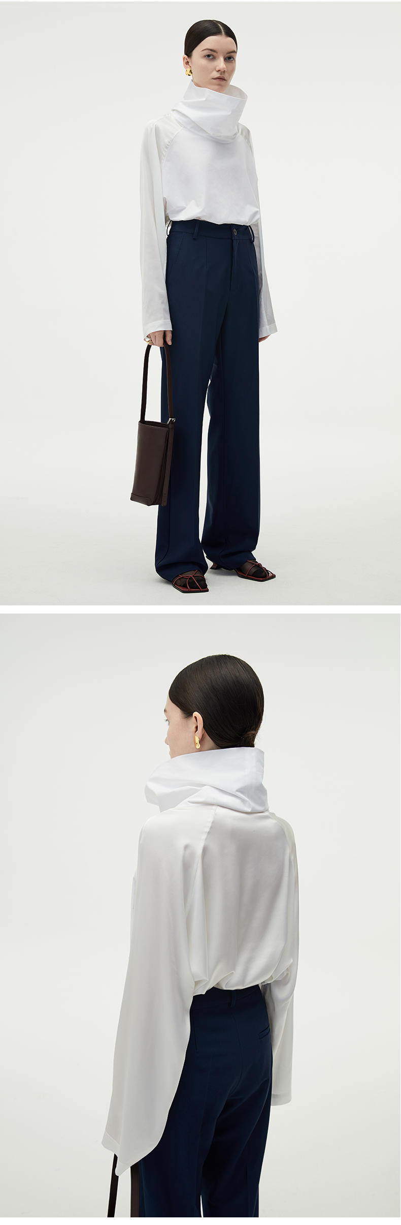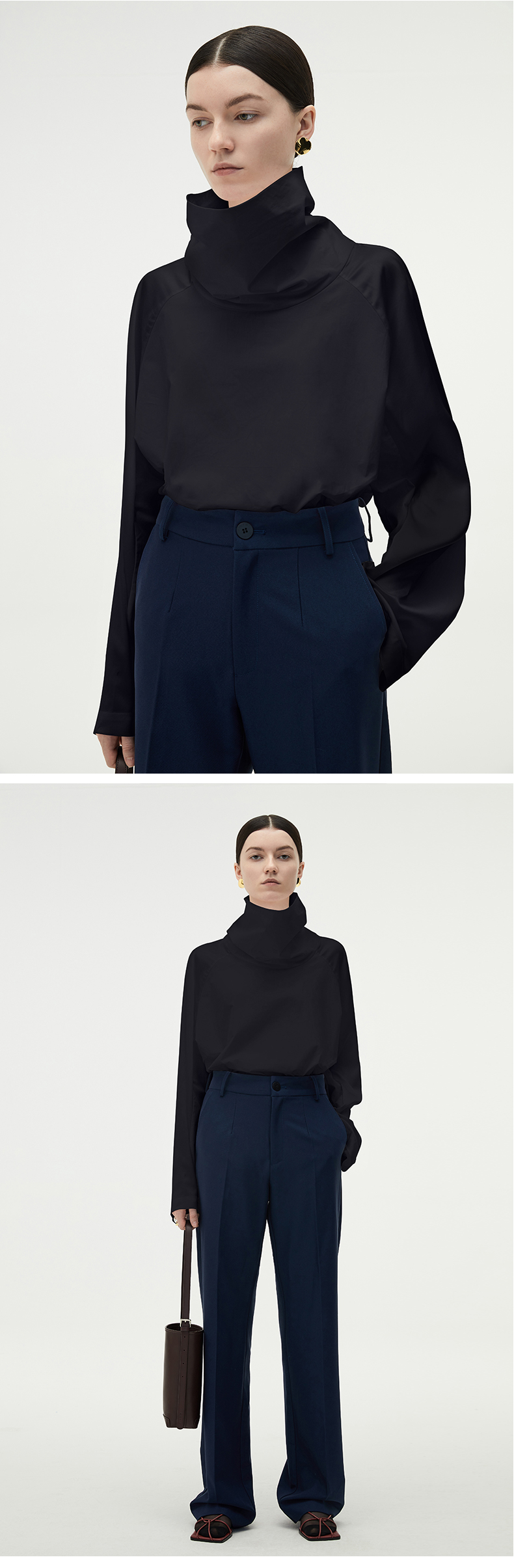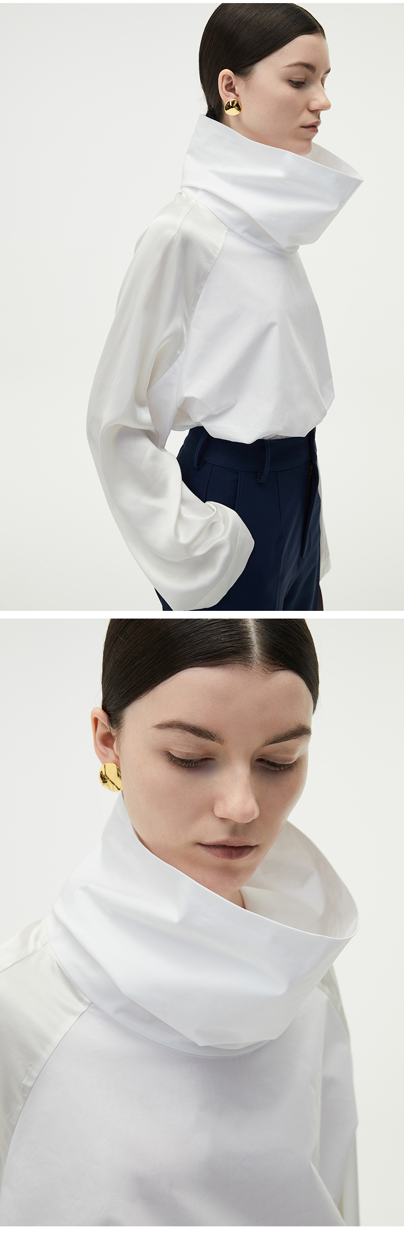 HIDEMI 醋酸缎拼接立领简约上衣 黑色/白色