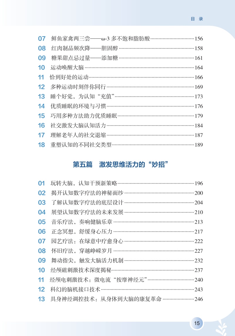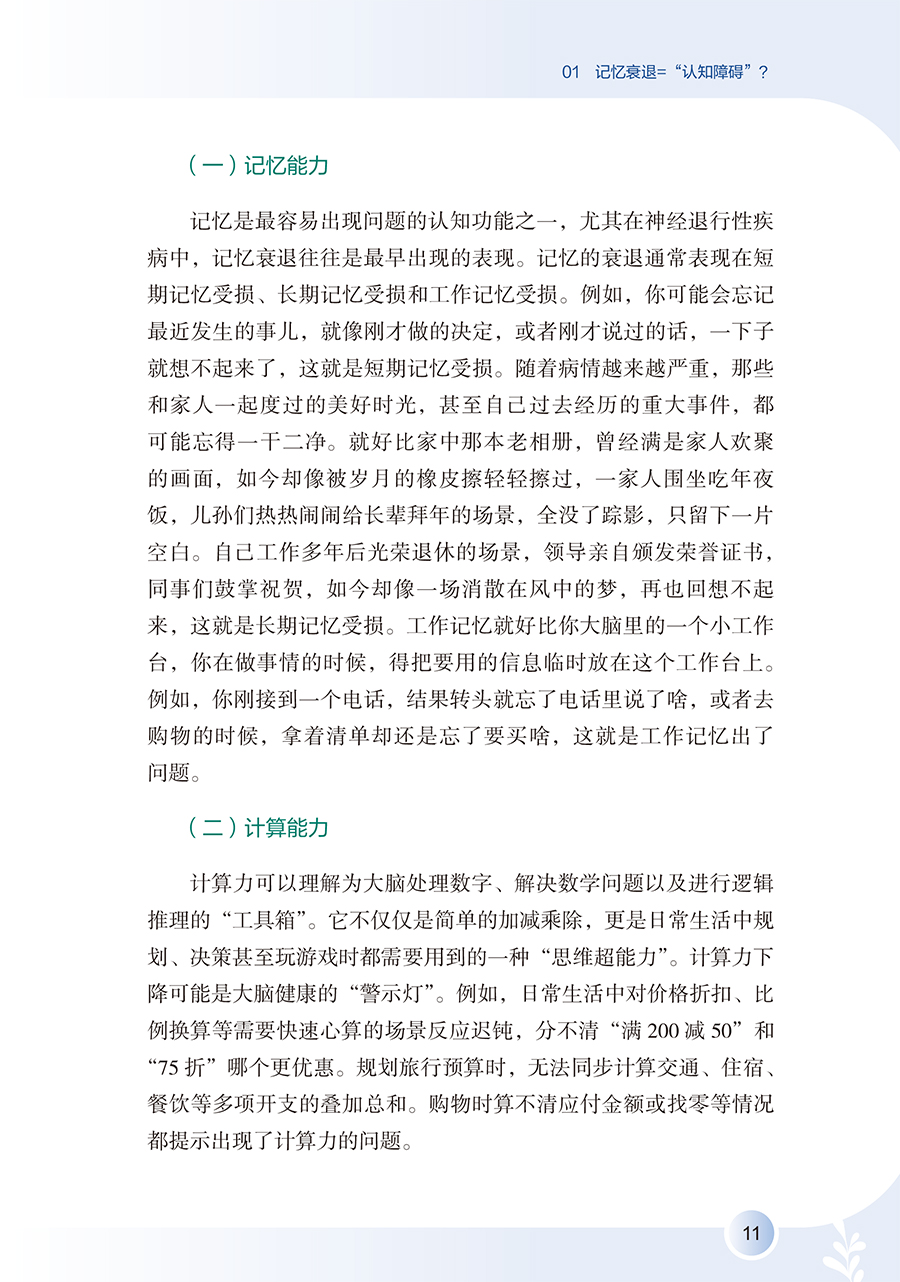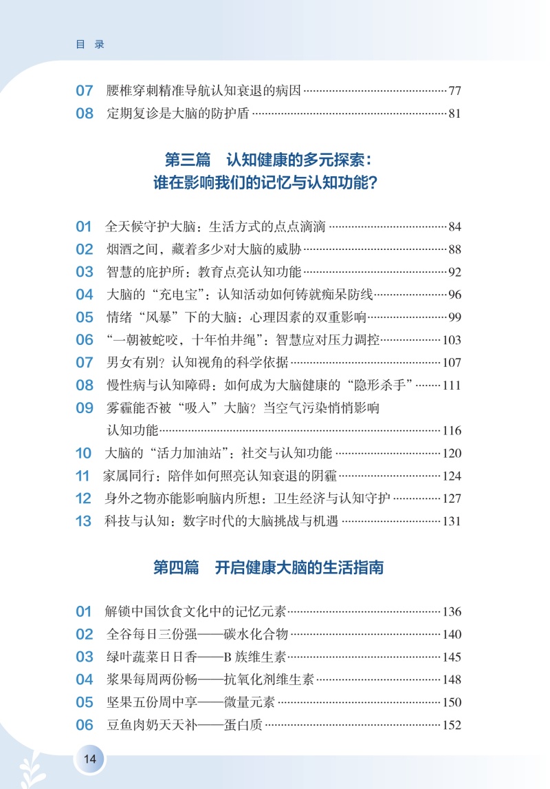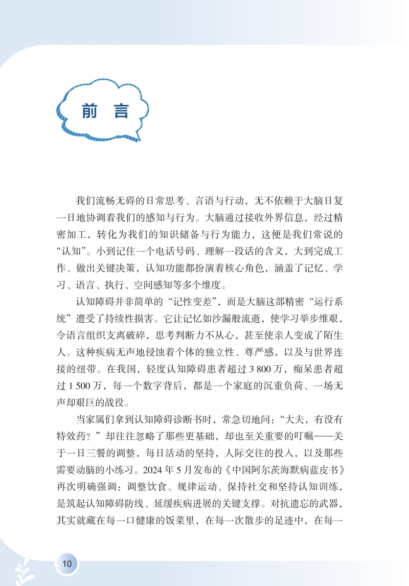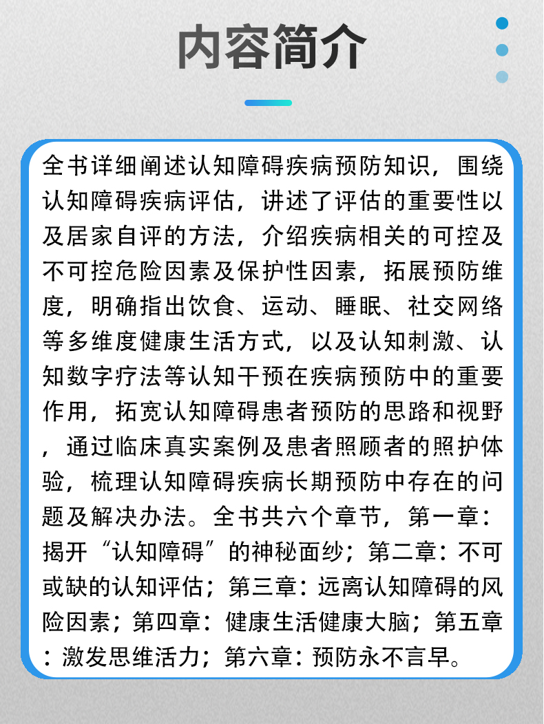 全书详细阐述认知障碍疾病预防知识,围绕认知障碍疾病评估,讲述了评估的重要性以及居家自评的方法,介绍疾病相关的可控及不可控危险因素及保护性因素,拓展预防维度,明确指出饮食、运动、睡眠、社交网络等多维度健康生活方式,以及认知刺激、认知数字疗法等认知干预在疾病预防中的重要作用,拓宽认知障碍患者预防的思路和视野,通过临床真实案例及患者照顾者的照护体验,梳理认知障碍疾病长期预防中存在的问题及解决办法。全书共六个章节,**章:揭开“认知障碍”的神秘面纱;**章 不可或缺的认知评估;第三章 远离认知障碍的风险因素;第四章 健康生活健康大脑;第五章 激发思维活力;第六章 预防永不言早。